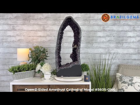 Discover the sophistication of this Extra Plus Quality Open 2-Sided (Window) Brazilian Amethyst Cathedral by Brazil Gems®. It has nicely shaped amethyst points with deep violet colors and polished edges. An amazing piece.