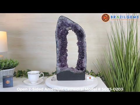 Discover the sophistication of this Extra Quality Open 2-Sided Brazilian Amethyst Cathedral by Brazil Gems®. It has nicely shaped amethyst points with violet colors and polished edges. A unique piece!