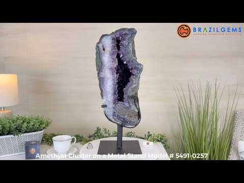 Infuse your room with the natural elegance of this Extra Quality Natural Brazilian Amethyst Cluster on a black metal stand from Brazil Gems®. This gemstone has purple amethyst points with lovely agate bands surrounding it. It is polished in the front edges with a natural rough outer shell.