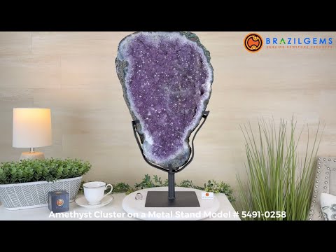 Infuse your room with the natural elegance of this Extra Quality Natural Brazilian Amethyst Cluster on a black metal stand from Brazil Gems®. This gemstone has purple amethyst points with lovely agate bands surrounding it. It is polished in the front edges with a natural rough outer shell.
