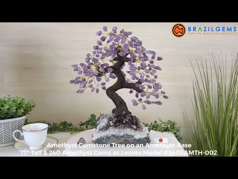 Amethyst Bonsai Gemstone Tree on an Amethyst Cluster Base Handcrafted in Brazil, this striking gemstone tree stands approximately 17" tall and features a sturdy bonsai-style trunk and branches adorned with 240 tumbled Amethyst gemstones as its leaves.