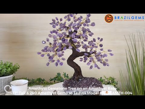 Amethyst Bonsai Gemstone Tree on an Amethyst Cluster Base Handcrafted in Brazil, this striking gemstone tree stands approximately 17" tall and features a sturdy bonsai-style trunk and branches adorned with 240 tumbled Amethyst gemstones as its leaves.