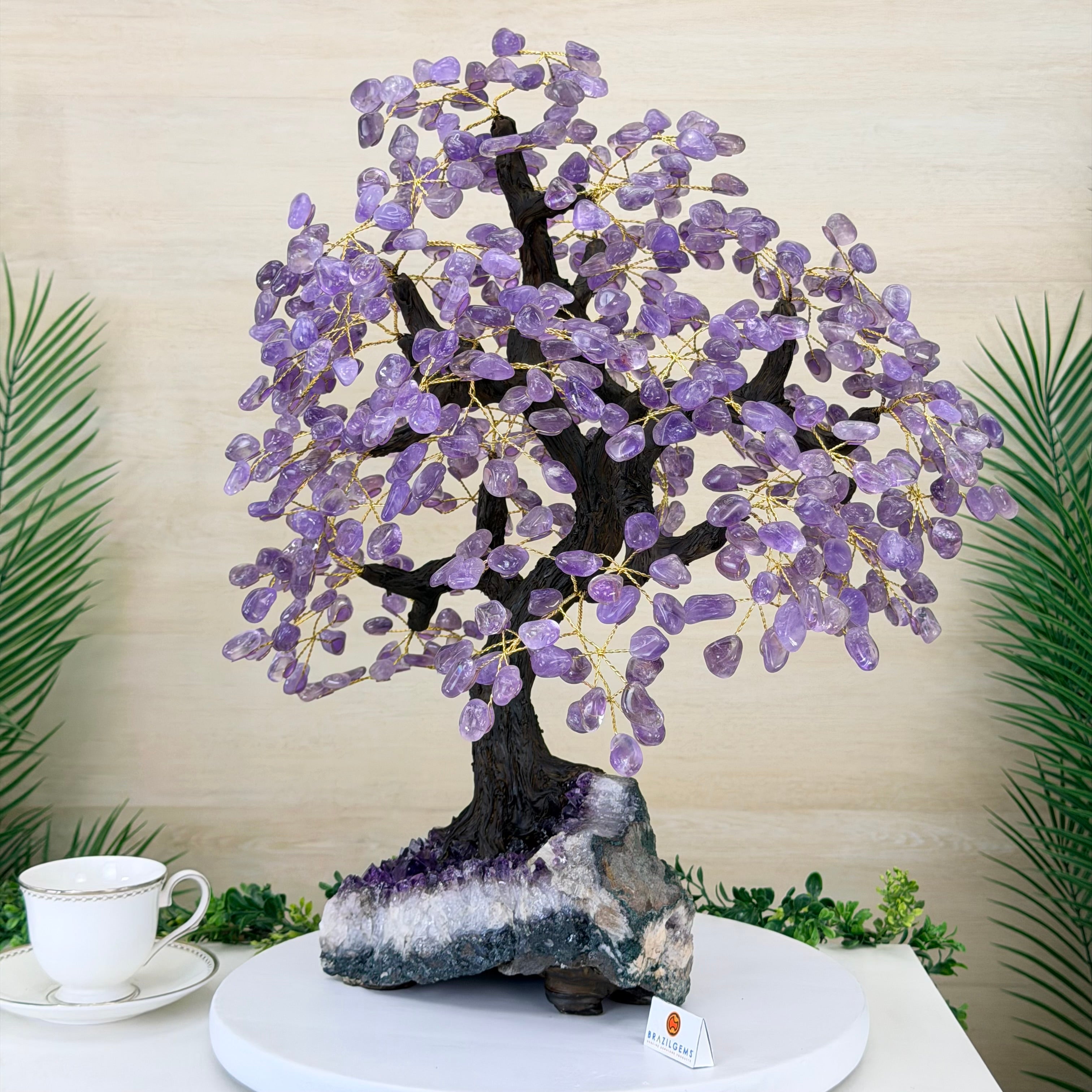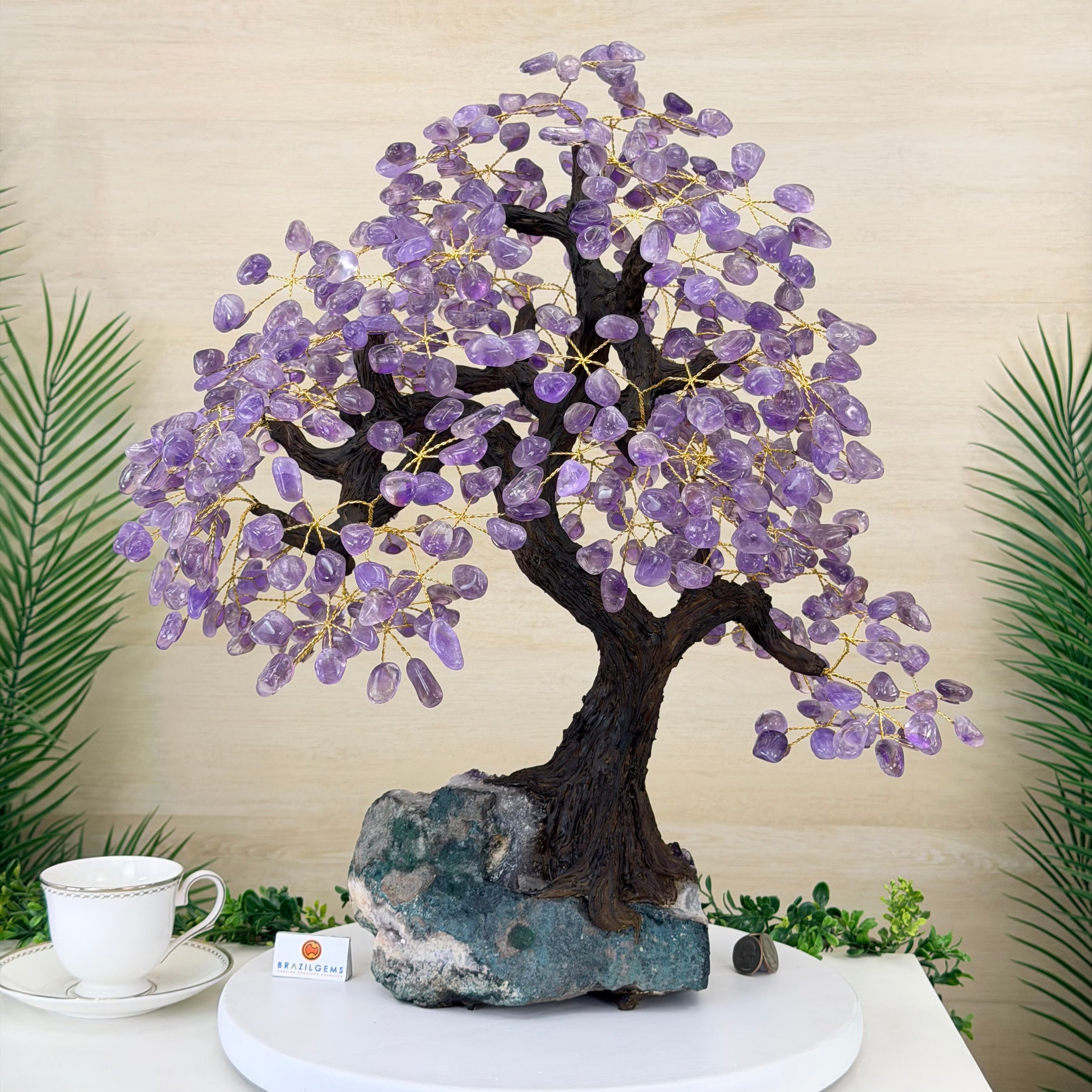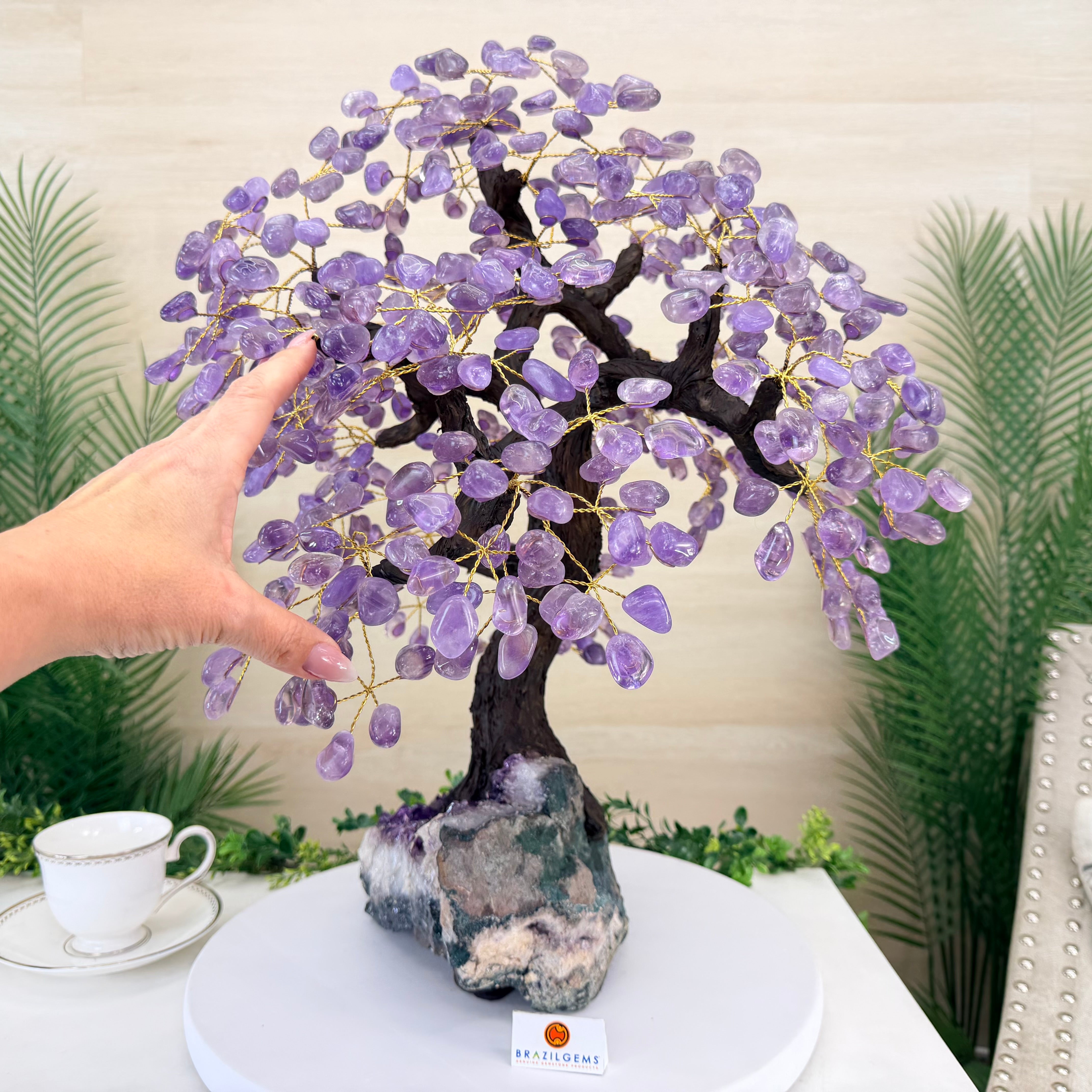 The process to make a crystal gem tree like this is very extensive and meticulous. A special amethyst cluster is selected for the base, the resin trunk and branches are crafted by Brazilian artisans and then each gemstone is glued to the tree by hand. MADE IN BRAZIL!