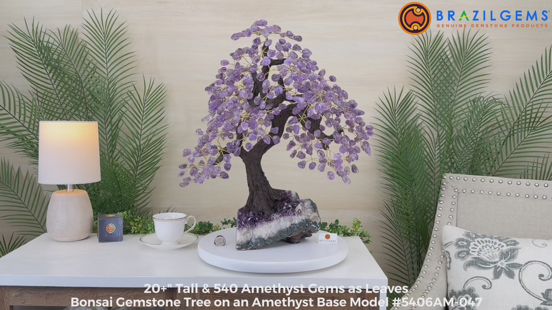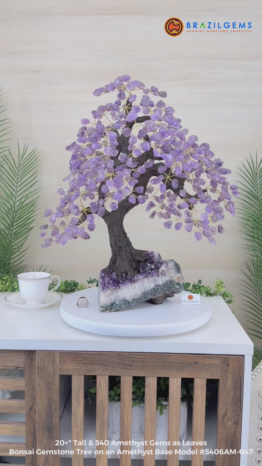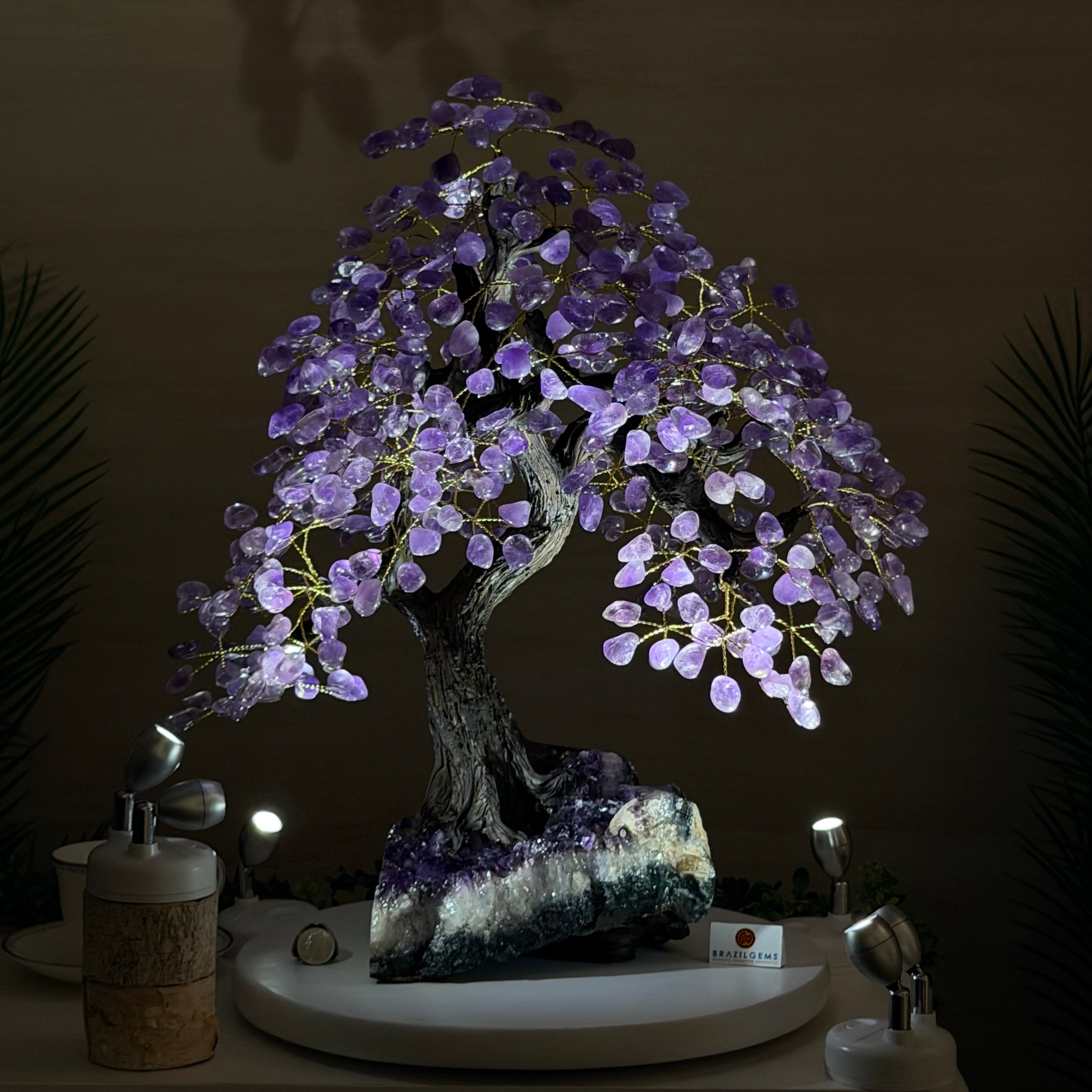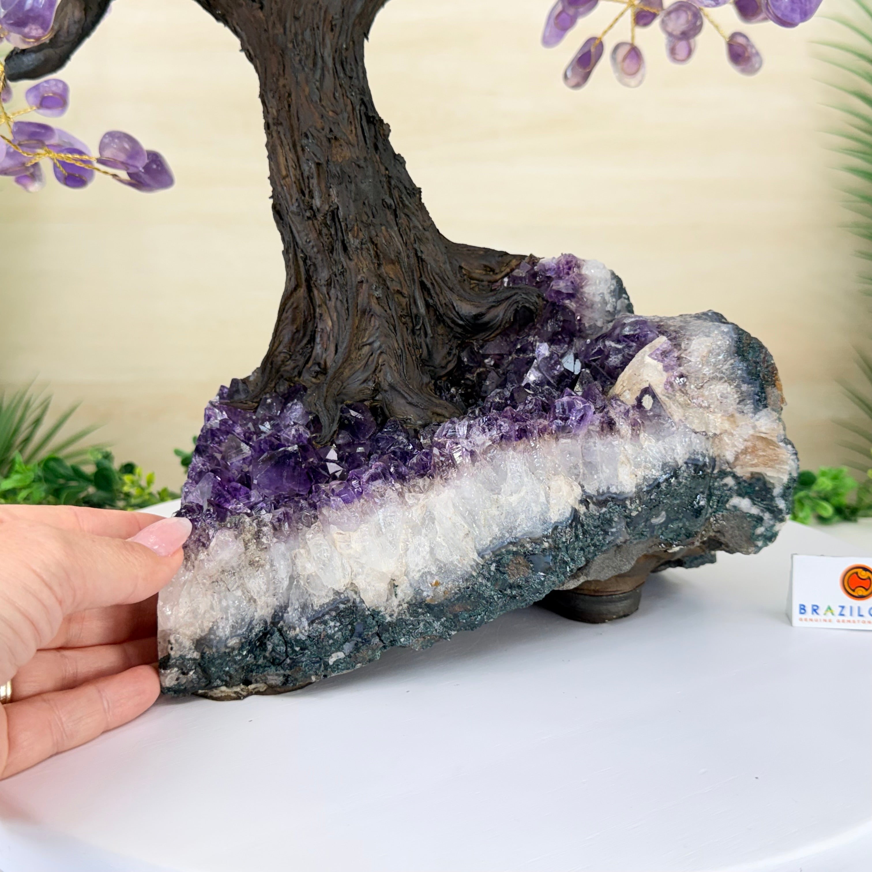 The process to make a crystal gem tree like this is very extensive and meticulous. A special amethyst cluster is selected for the base, the resin trunk and branches are crafted by Brazilian artisans and then each gemstone is glued to the tree by hand. MADE IN BRAZIL!