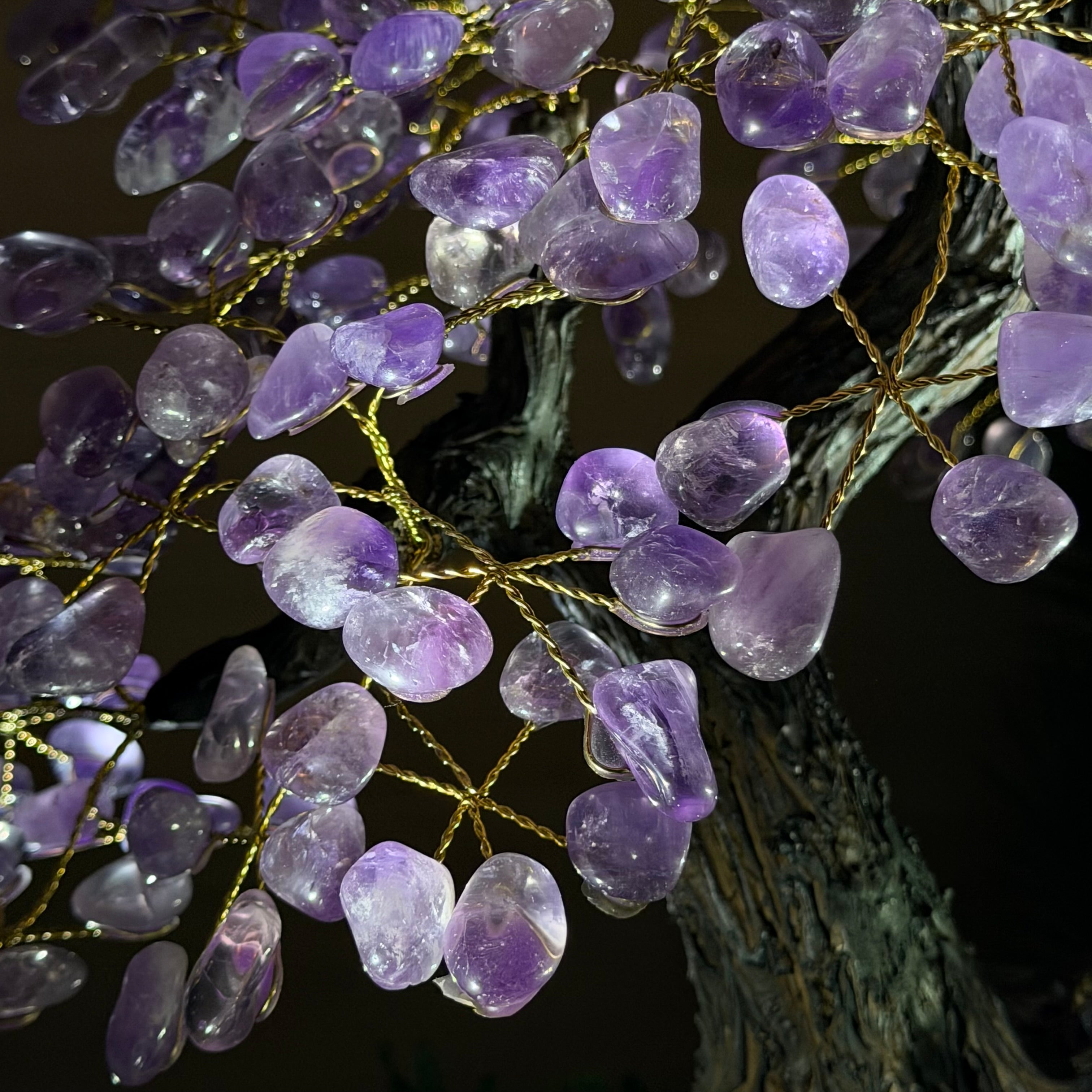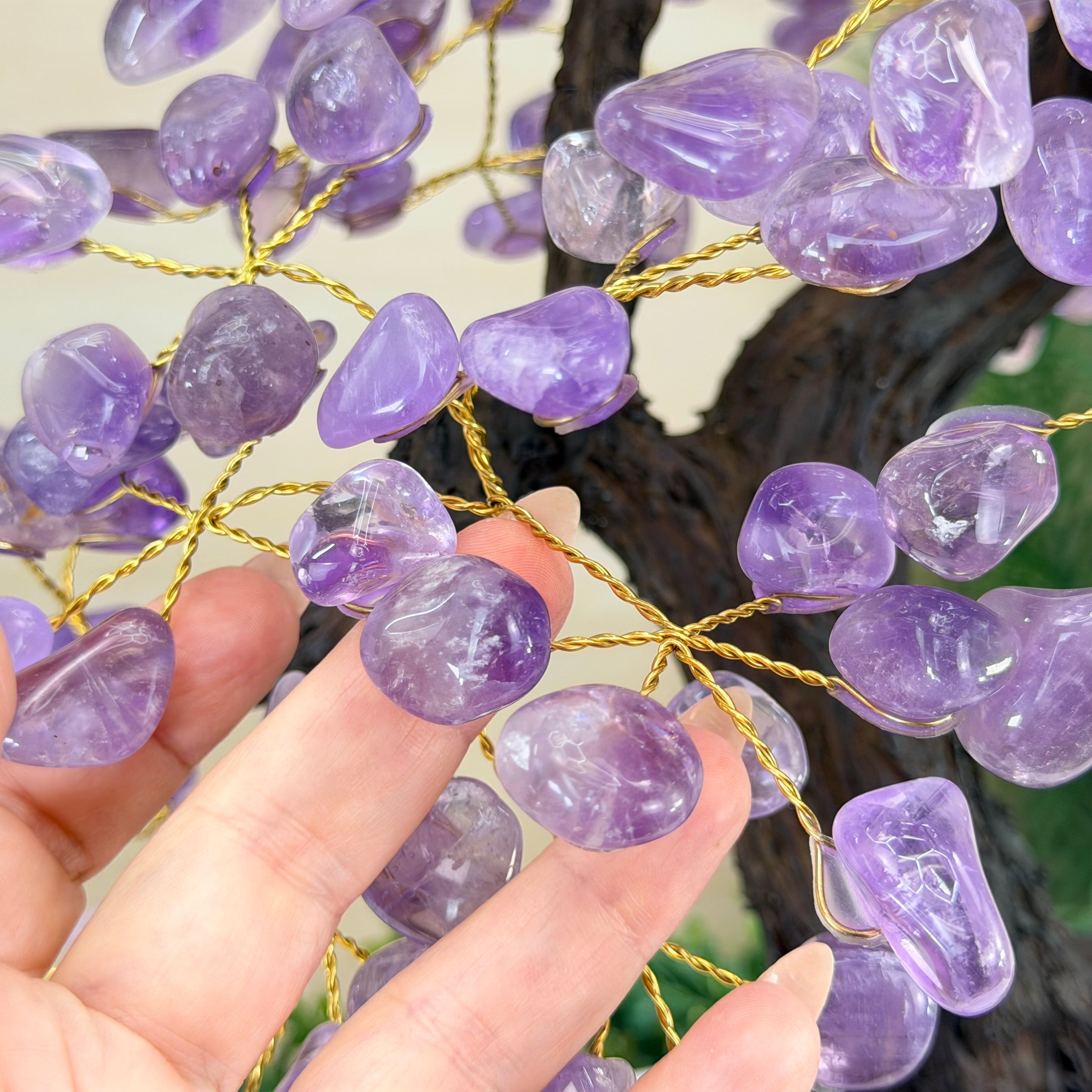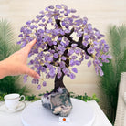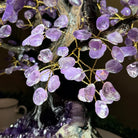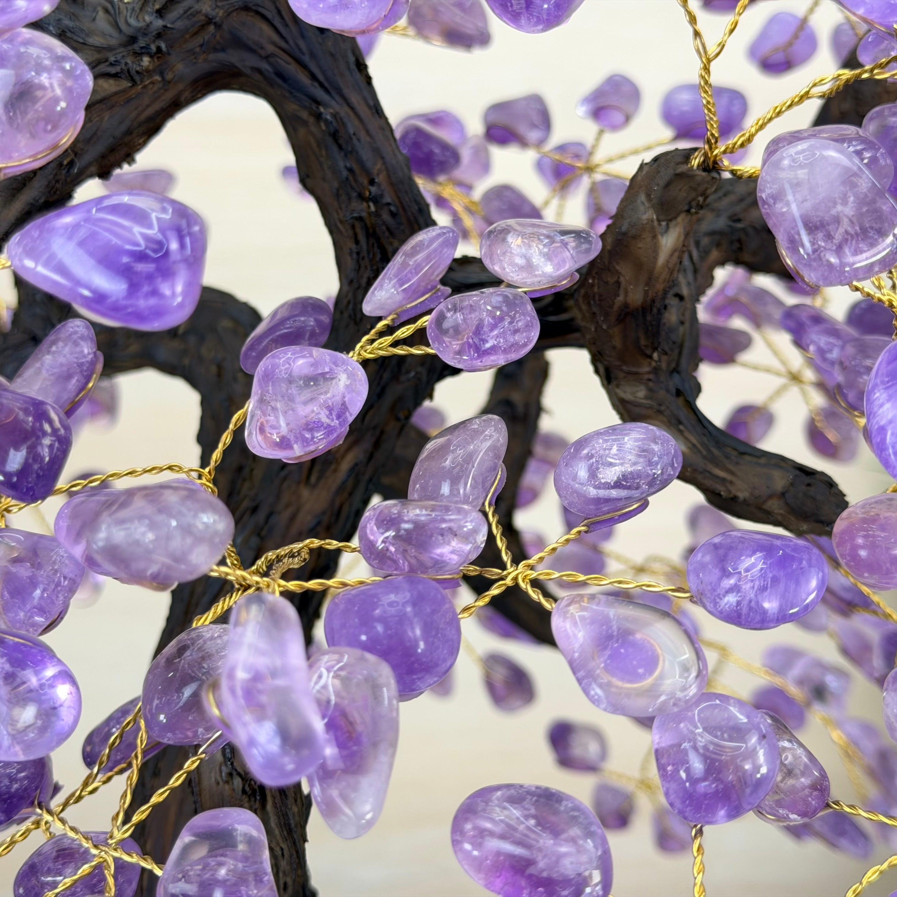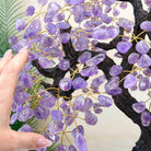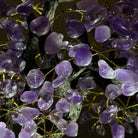 Nature and Artistry combine to create this Large Handmade Gemstone Tree with Amethyst Gemstones as leaves. Set atop a large Amethyst cluster base, it has a masterfully detailed trunk and branches crafted from resin in a bonsai tree style supporting 540 tumbled gemstones.