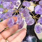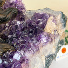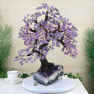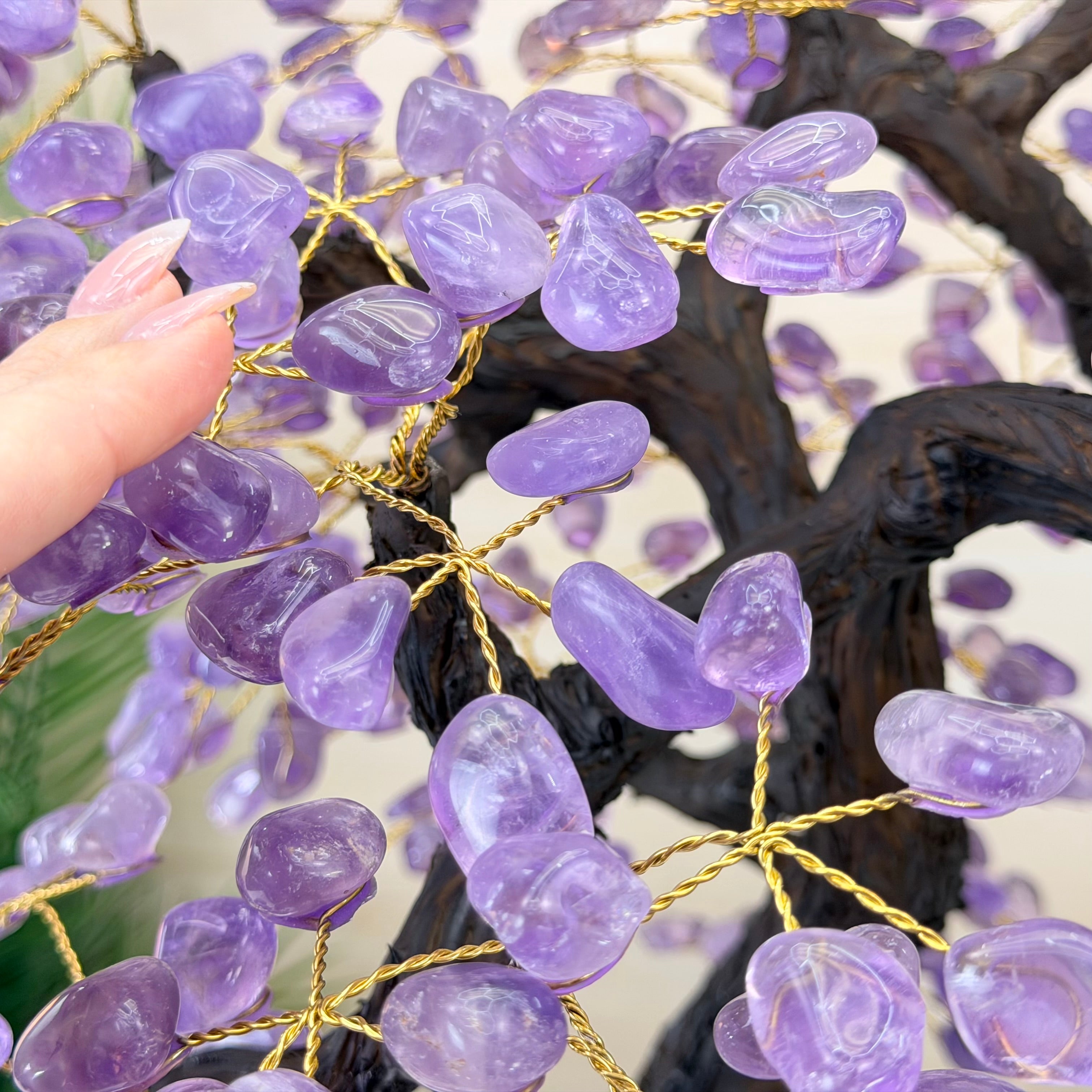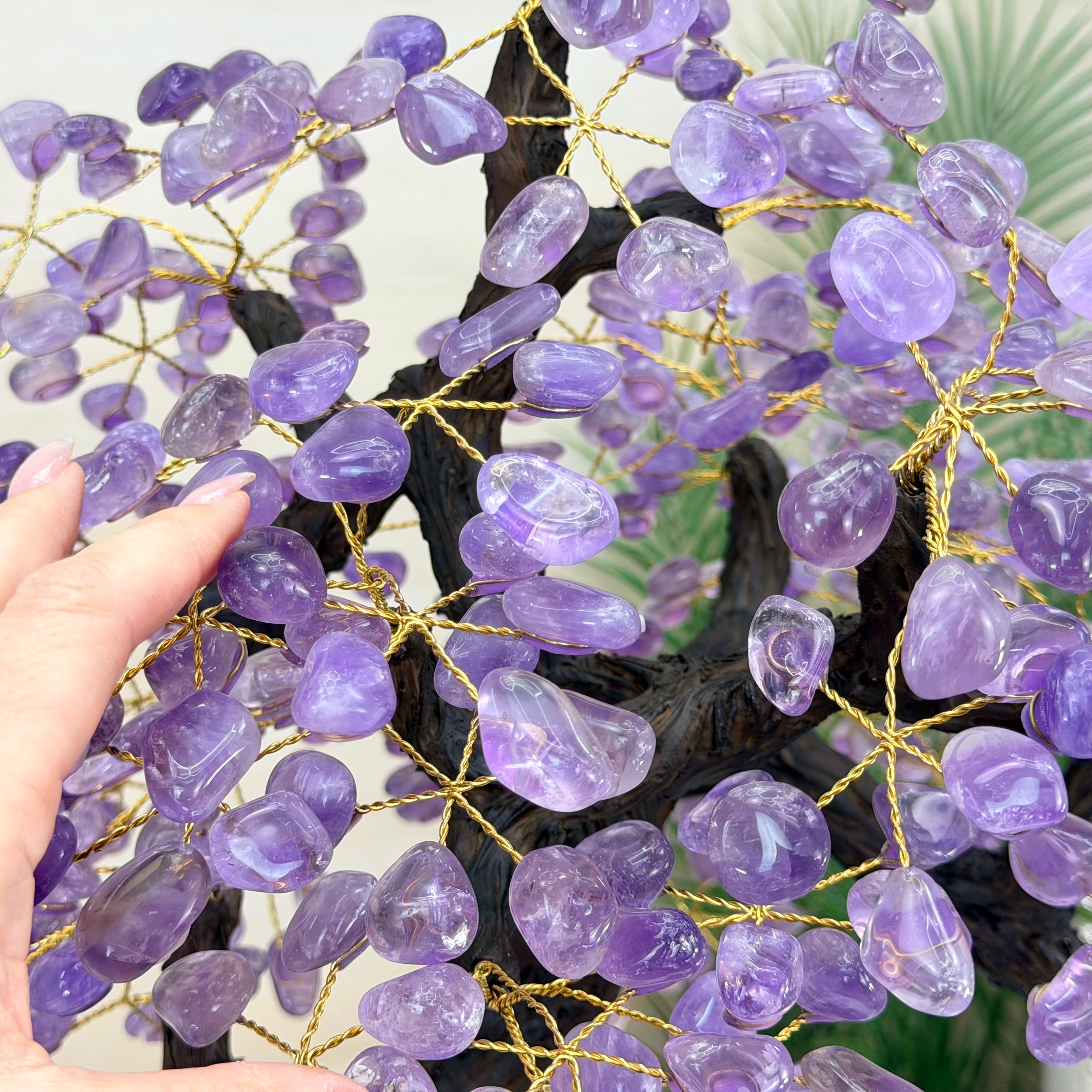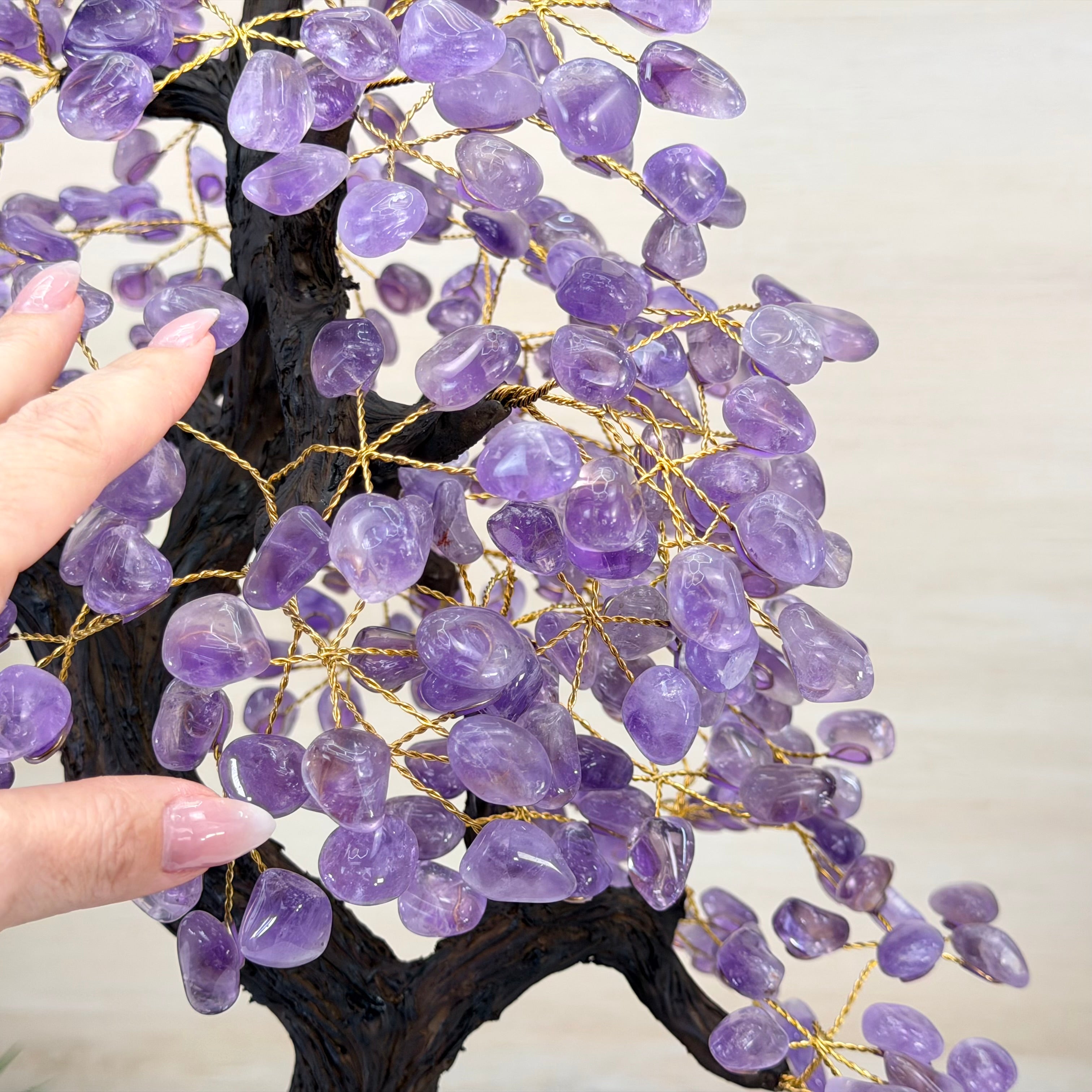 Nature and Artistry combine to create this Large Handmade Gemstone Tree with Amethyst Gemstones as leaves. Set atop a large Amethyst cluster base, it has a masterfully detailed trunk and branches crafted from resin in a bonsai tree style supporting 540 tumbled gemstones.