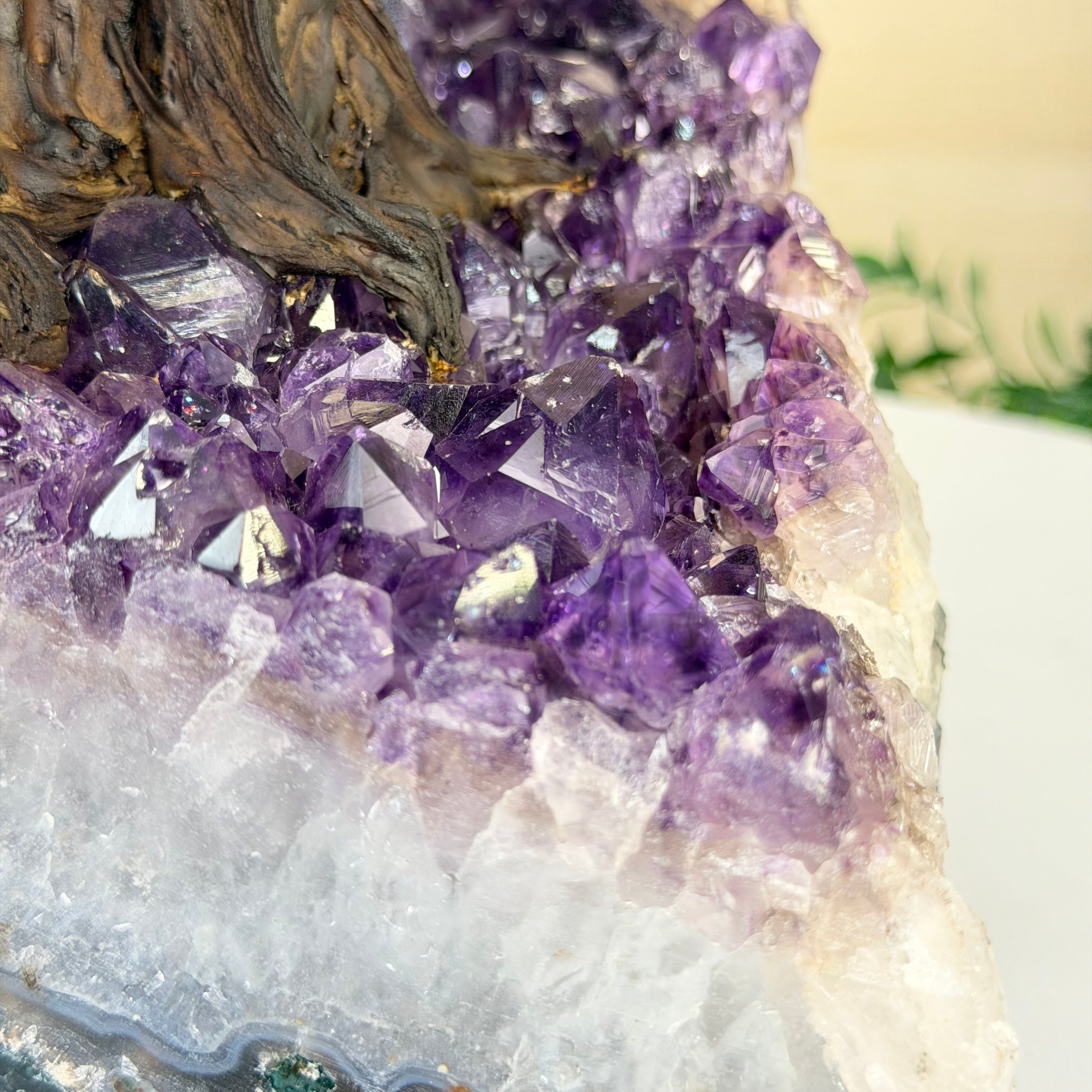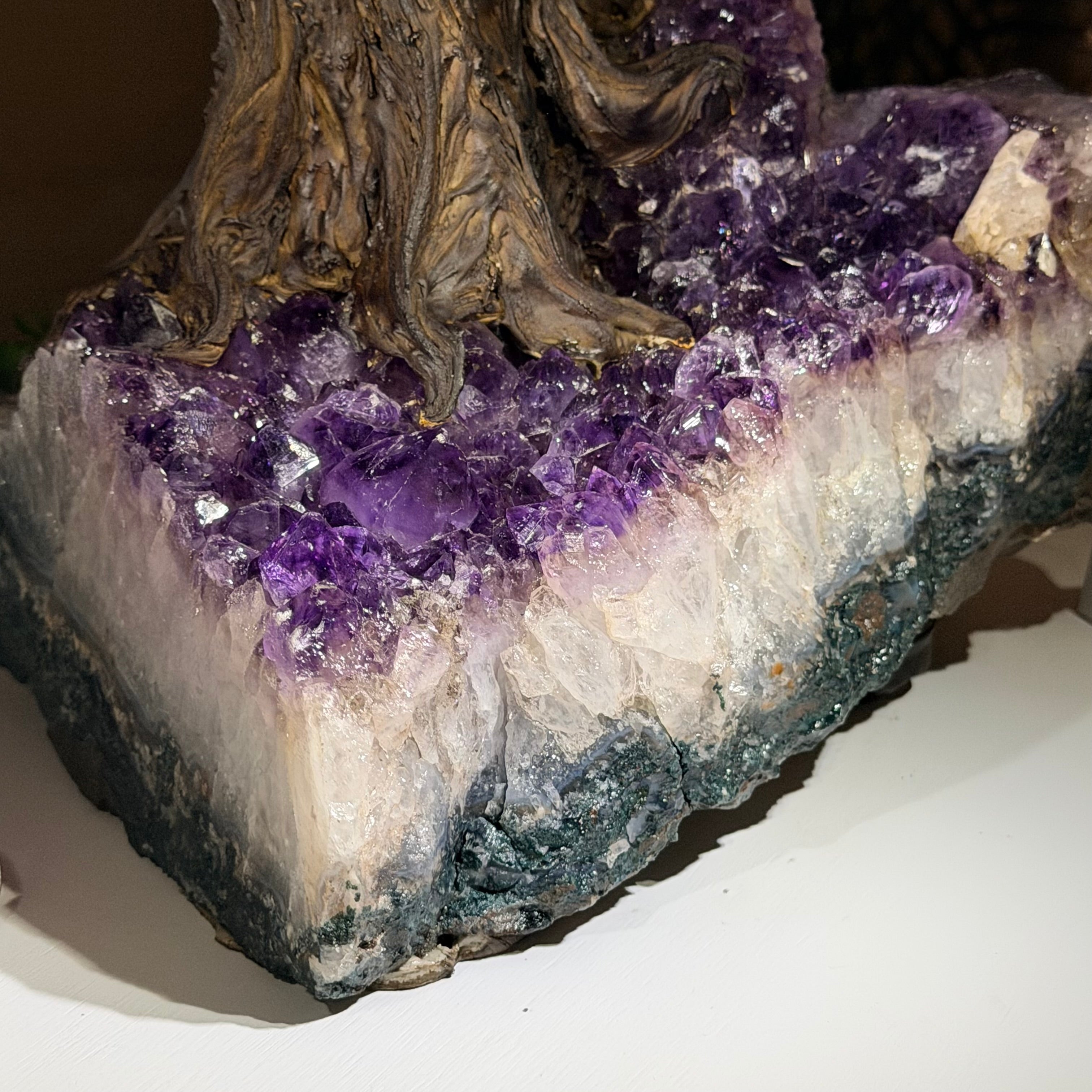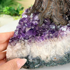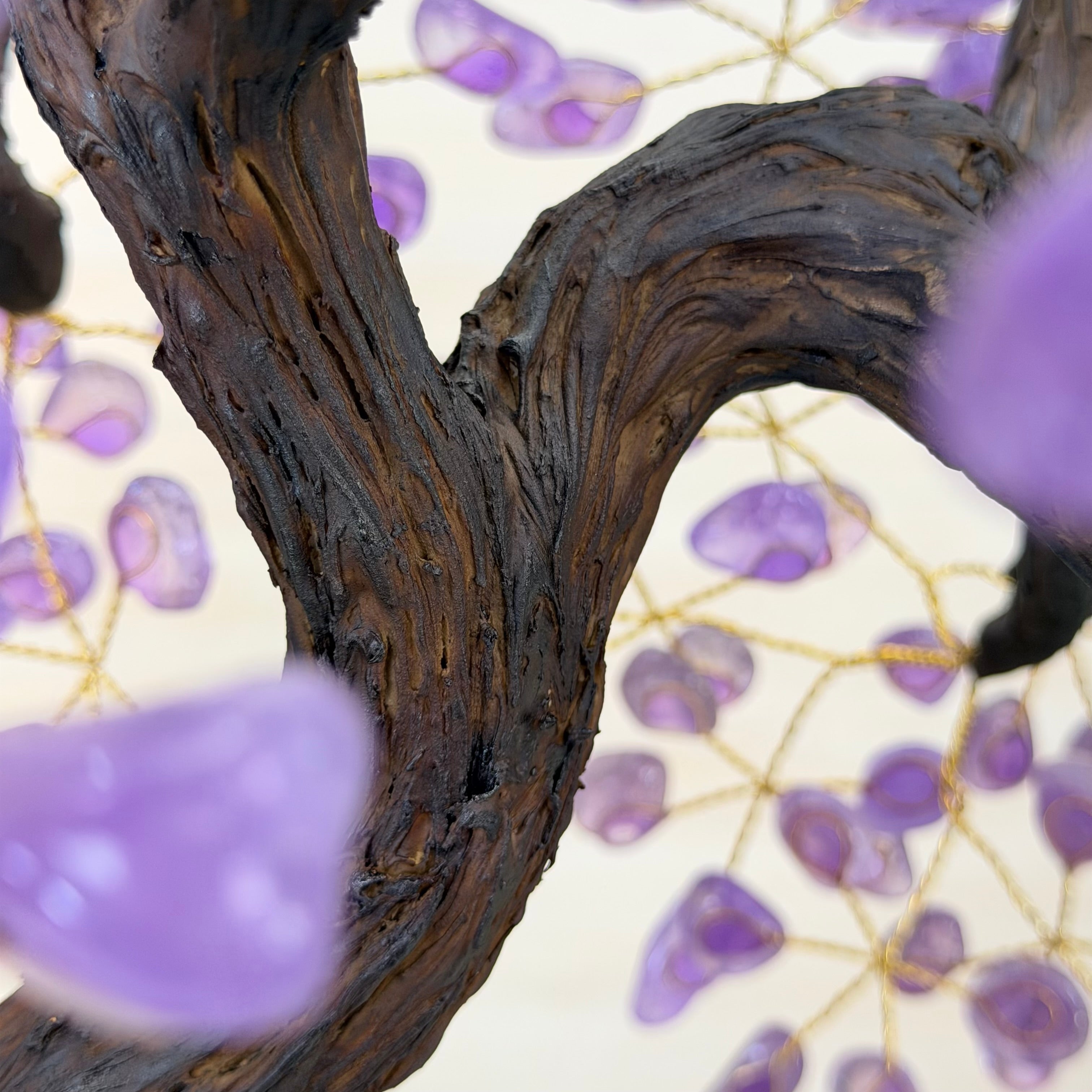 At approximately 20" tall to the top of its bark style branches this gemstone tree is both big and a design statement that will impact any room in your home or office. The amethyst clusters used as bases for this size of our gemstone trees are substantial gemstones on their own.