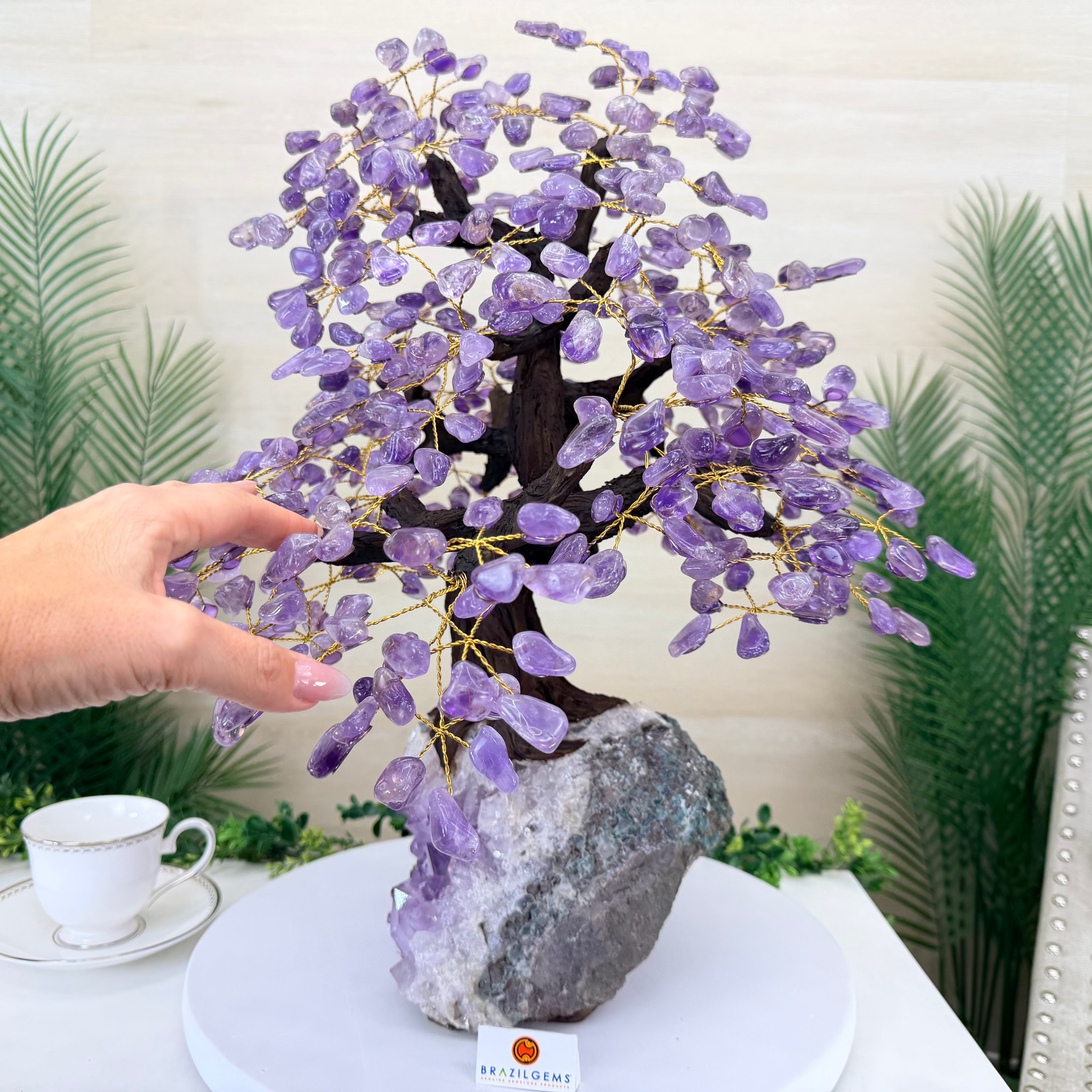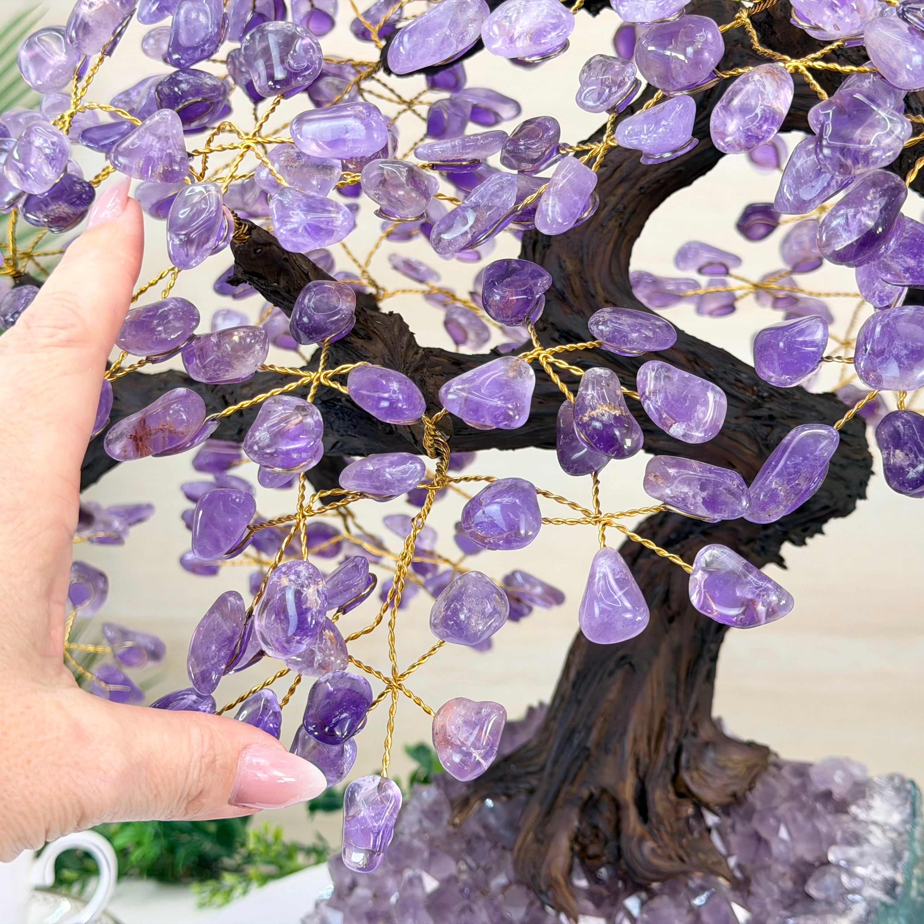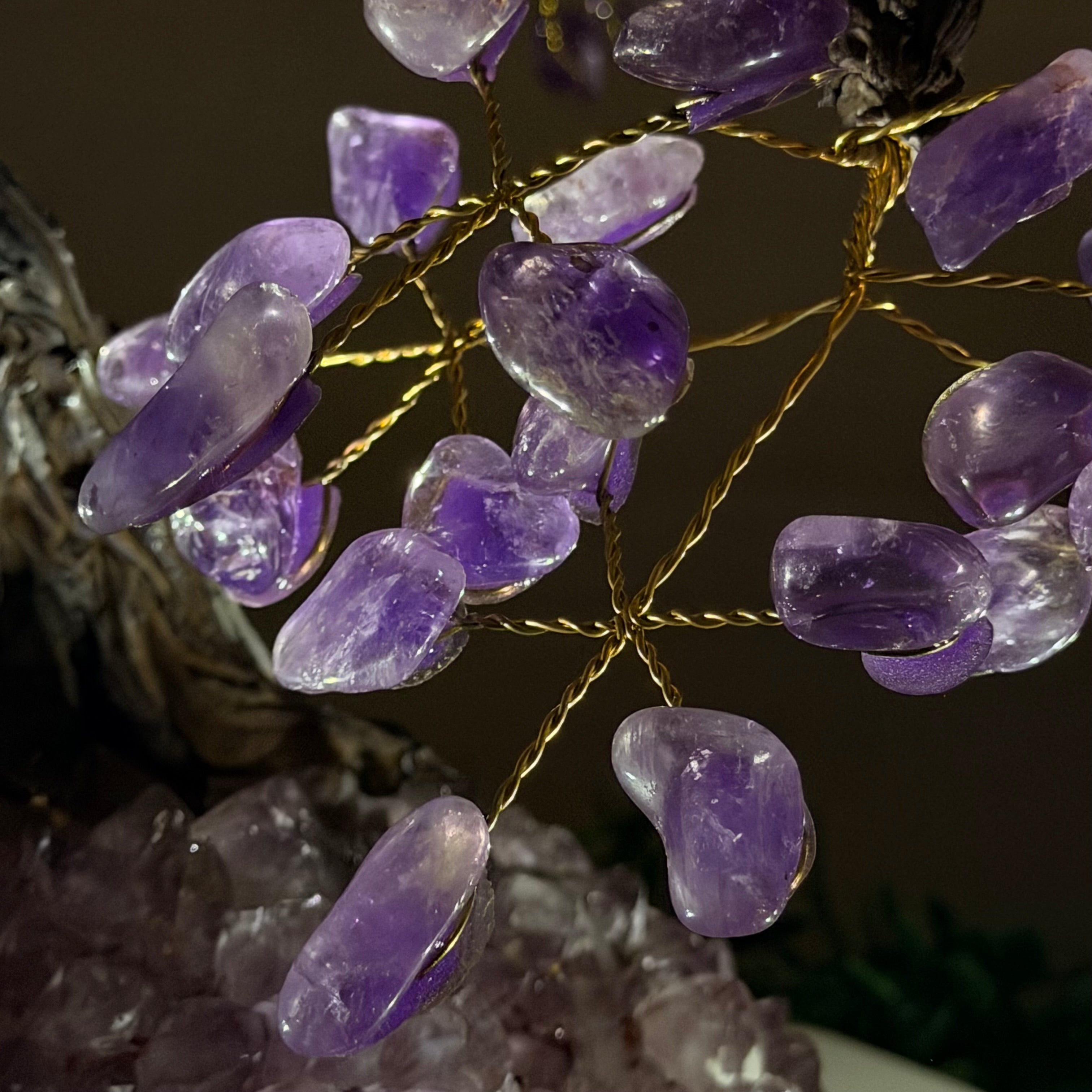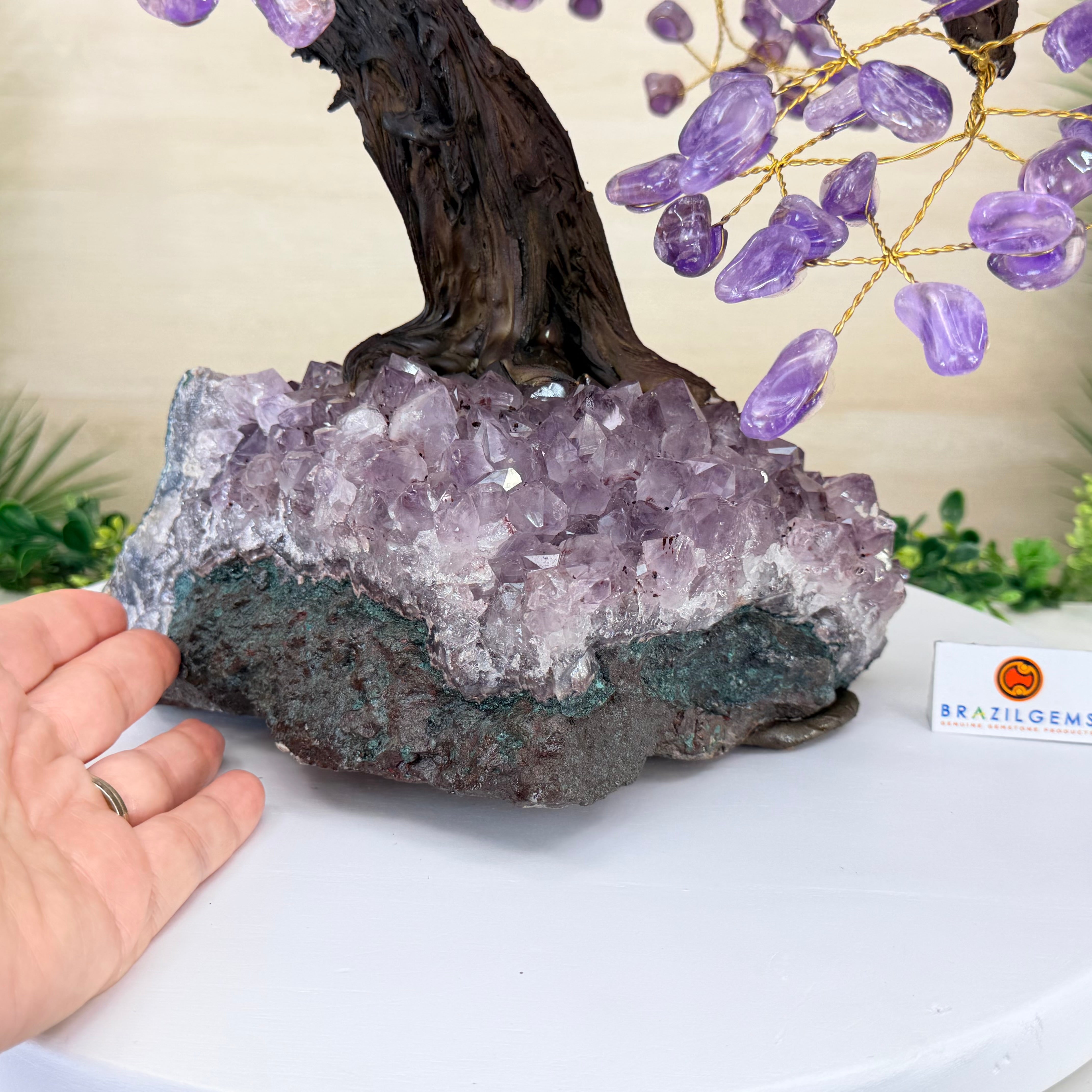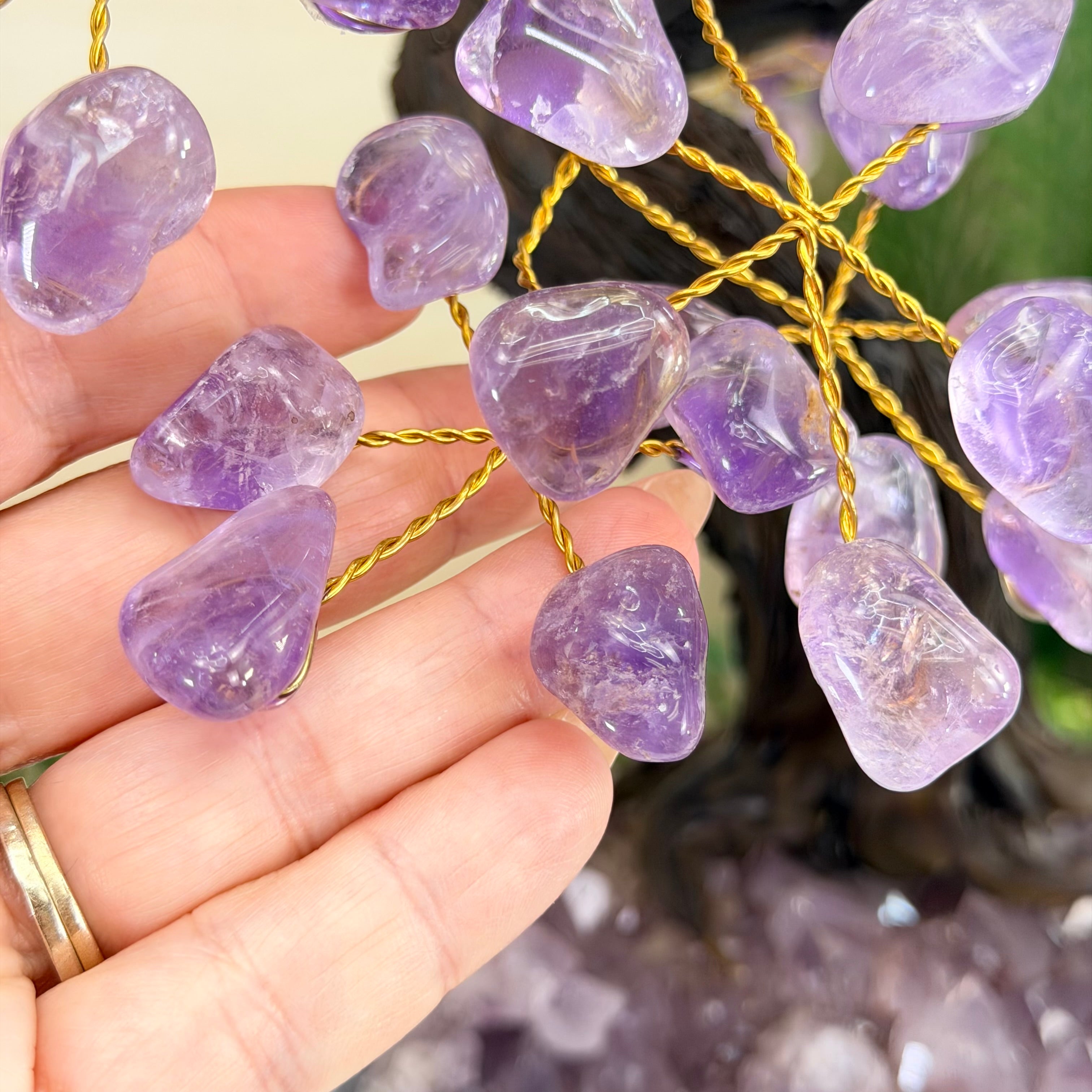 Brazil Gems® brings you Handmade Amethyst Gemstone trees with a crystal cluster base, resin trunk, wired branches and tumbled Amethyst gemstones.