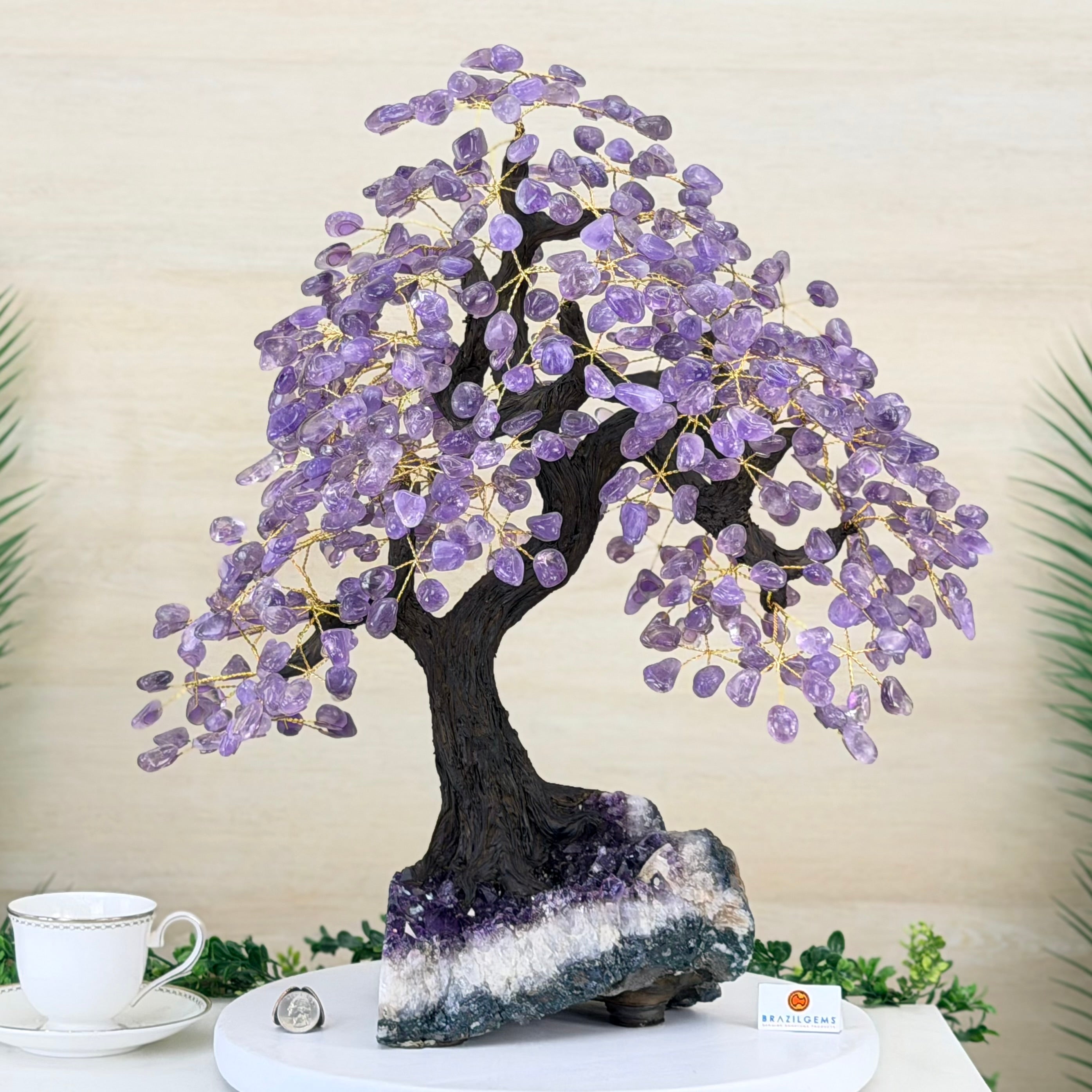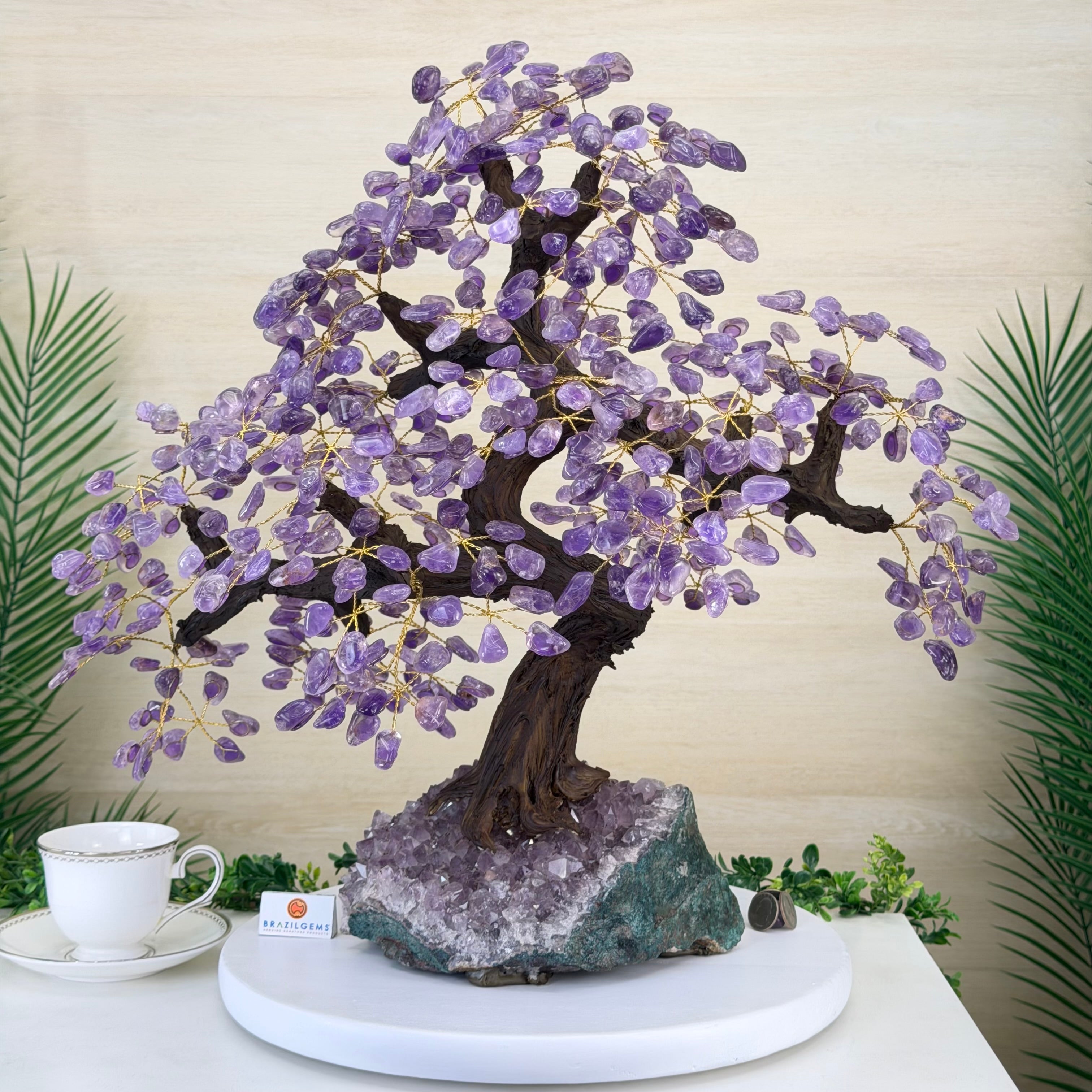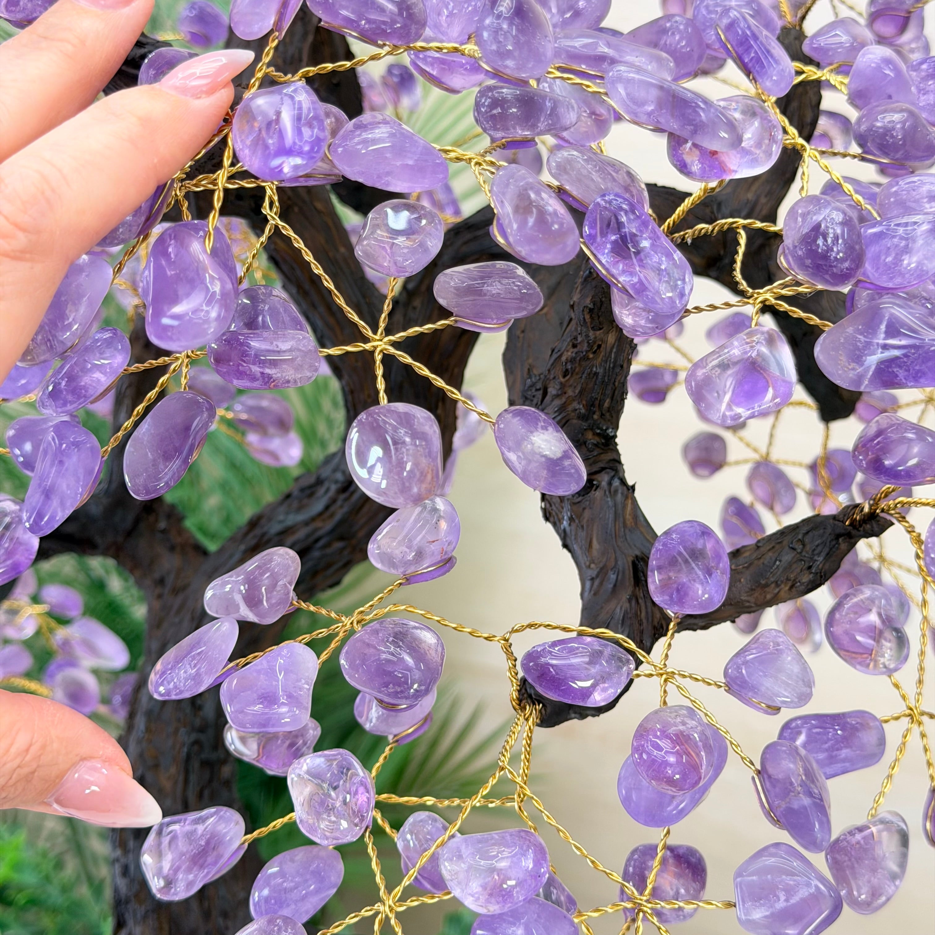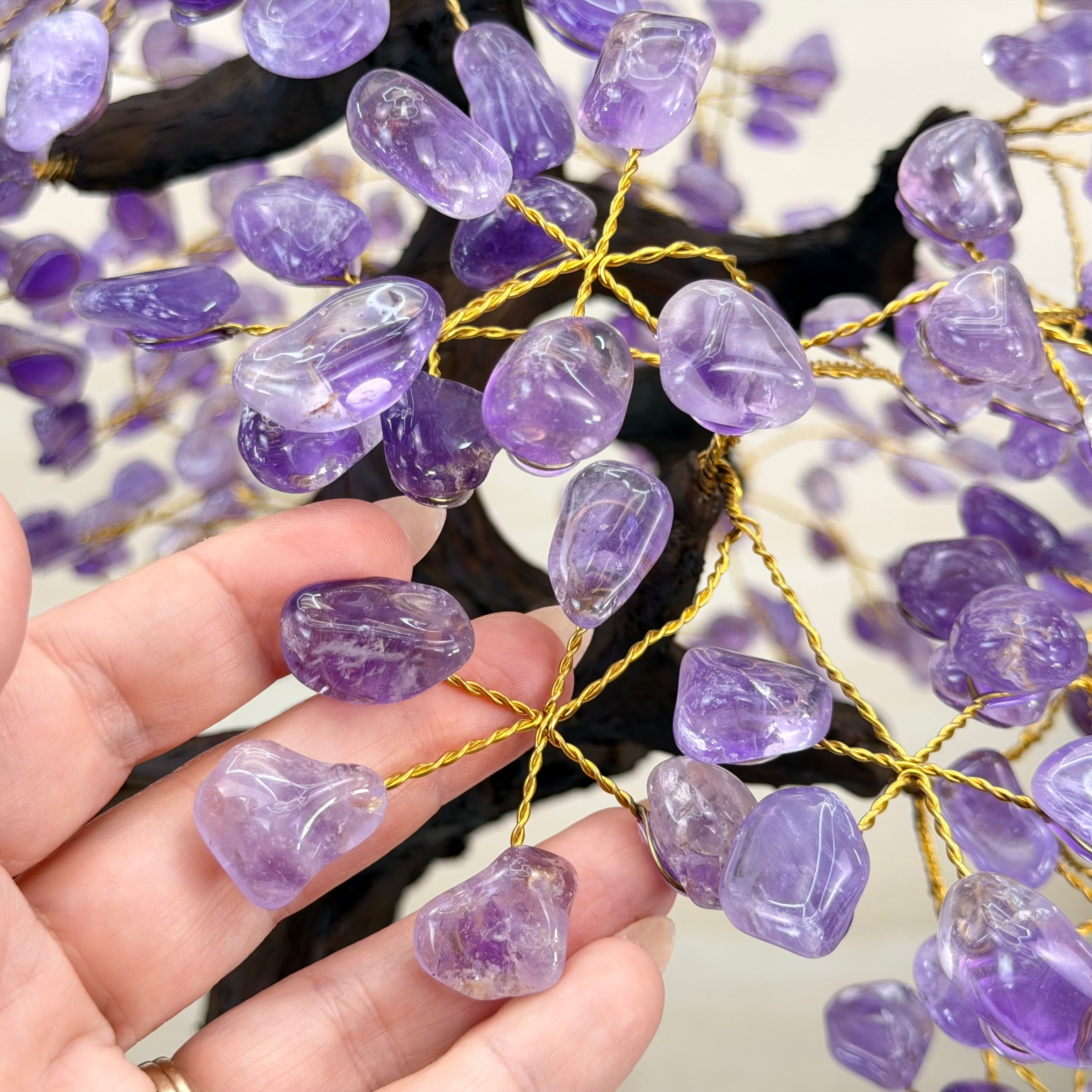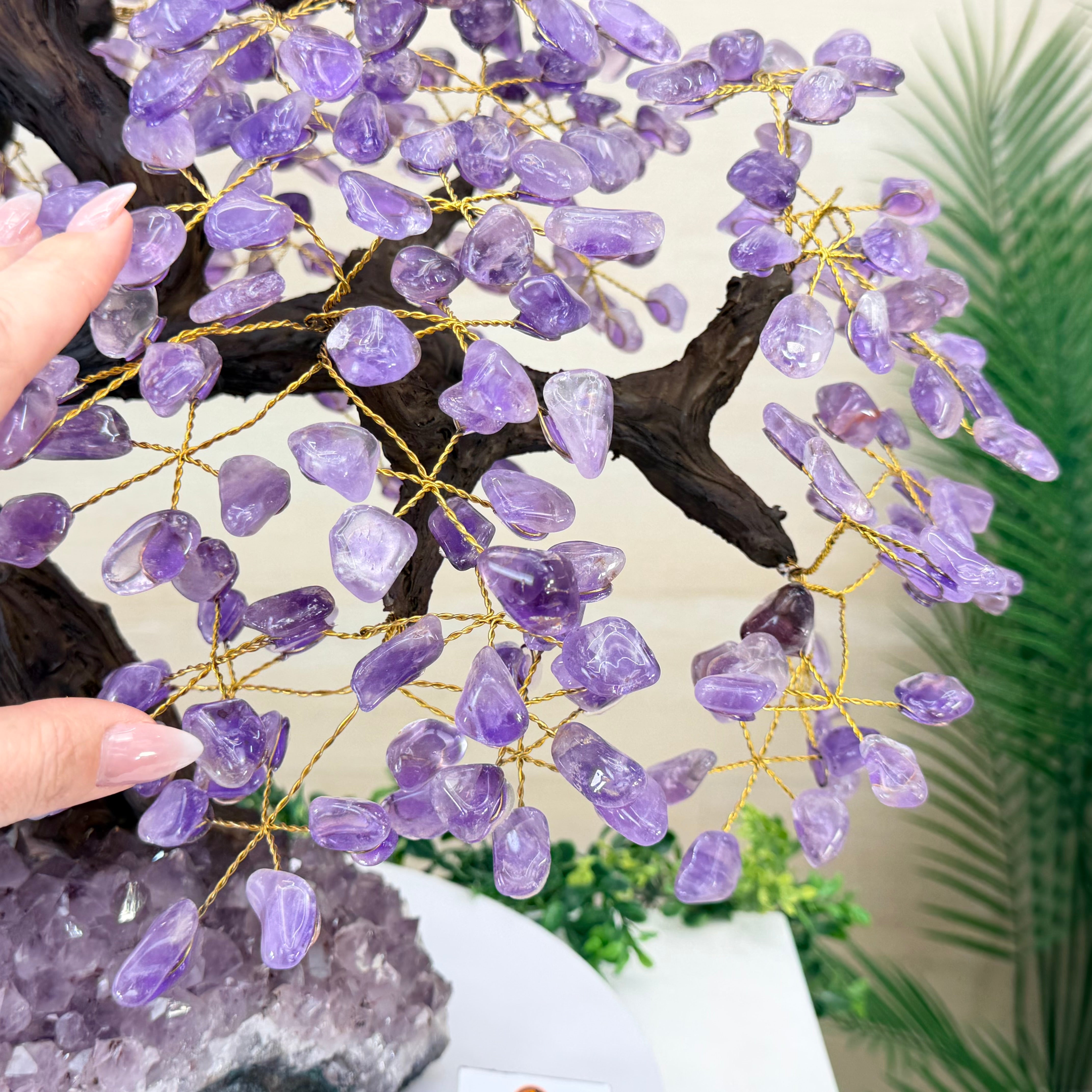 Brazil Gems® brings you Handmade Amethyst Gemstone trees with a crystal cluster base, resin trunk, wired branches and tumbled Amethyst gemstones.