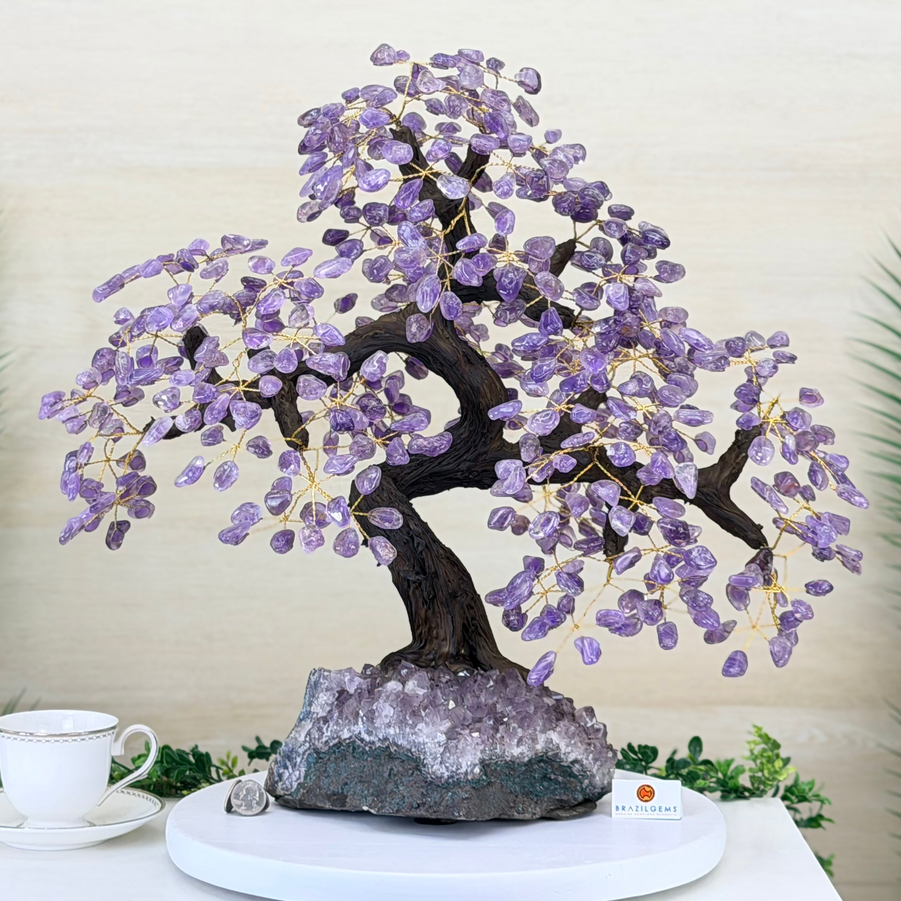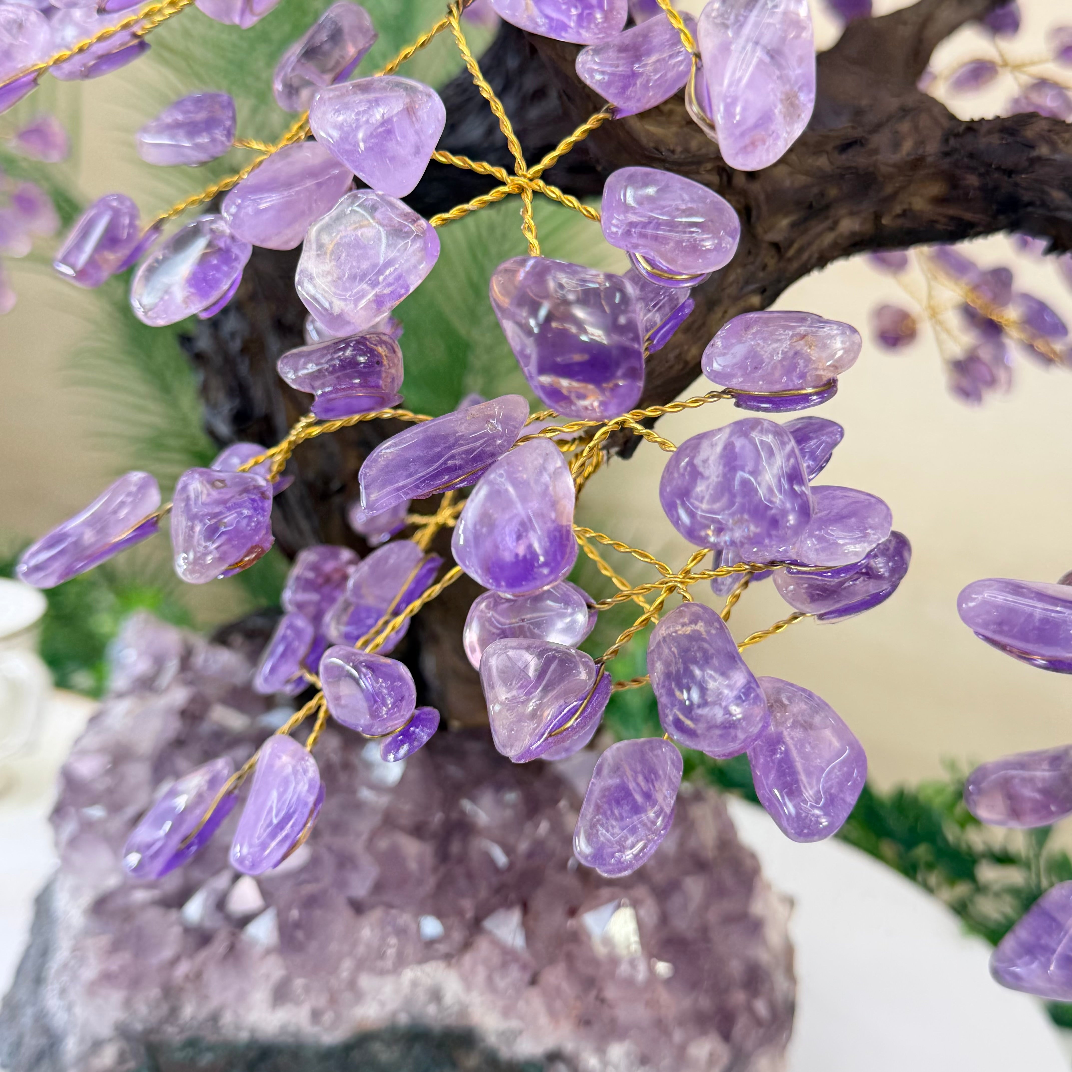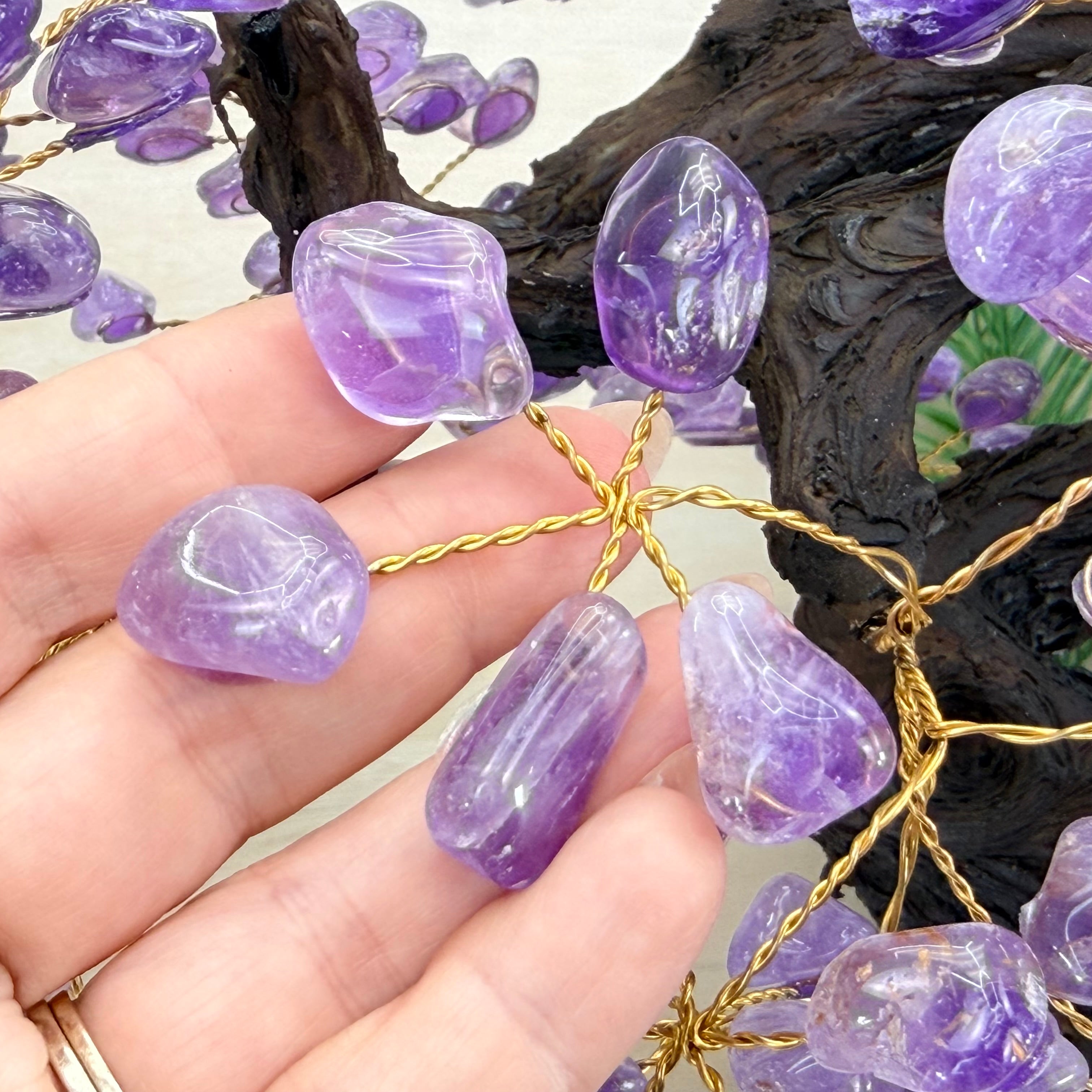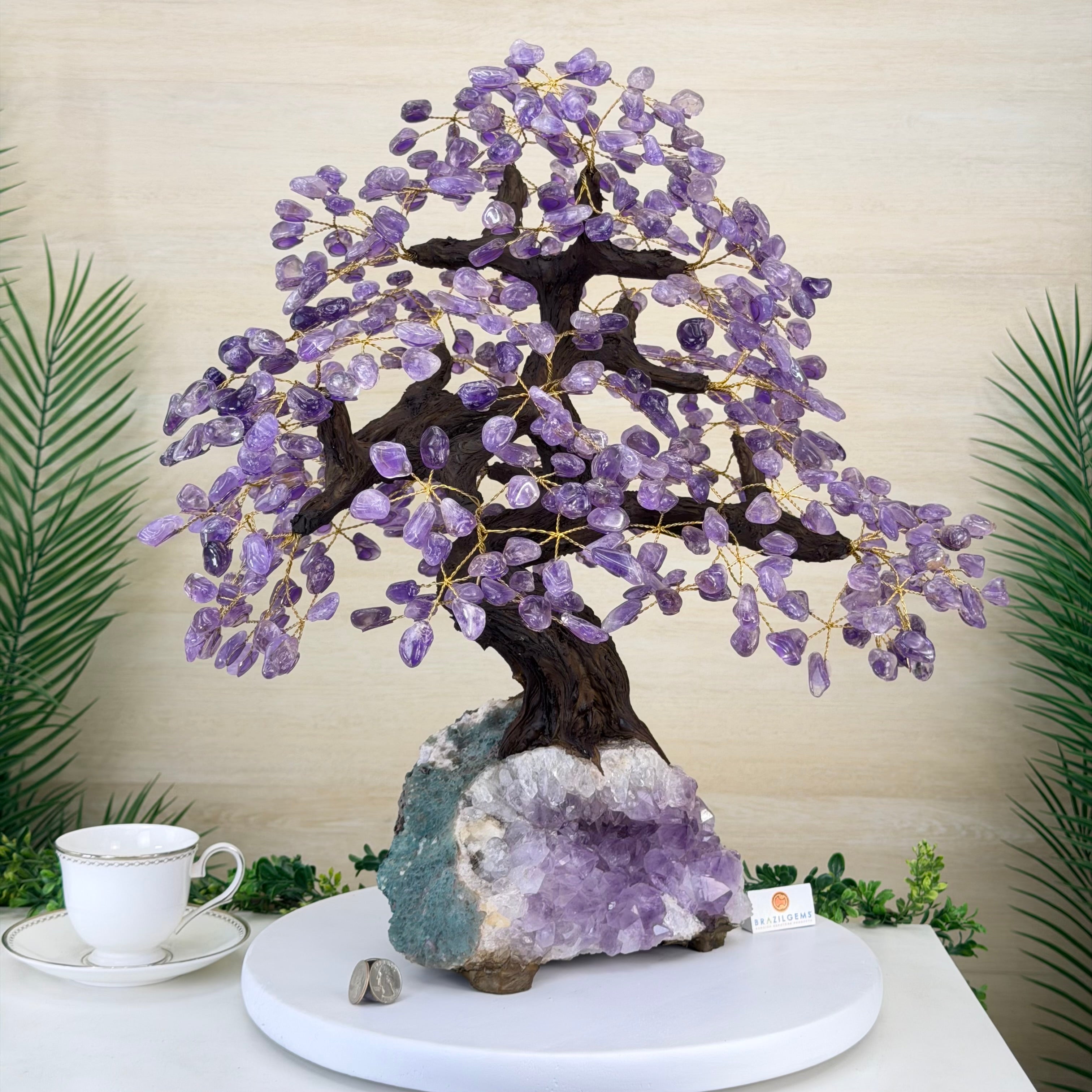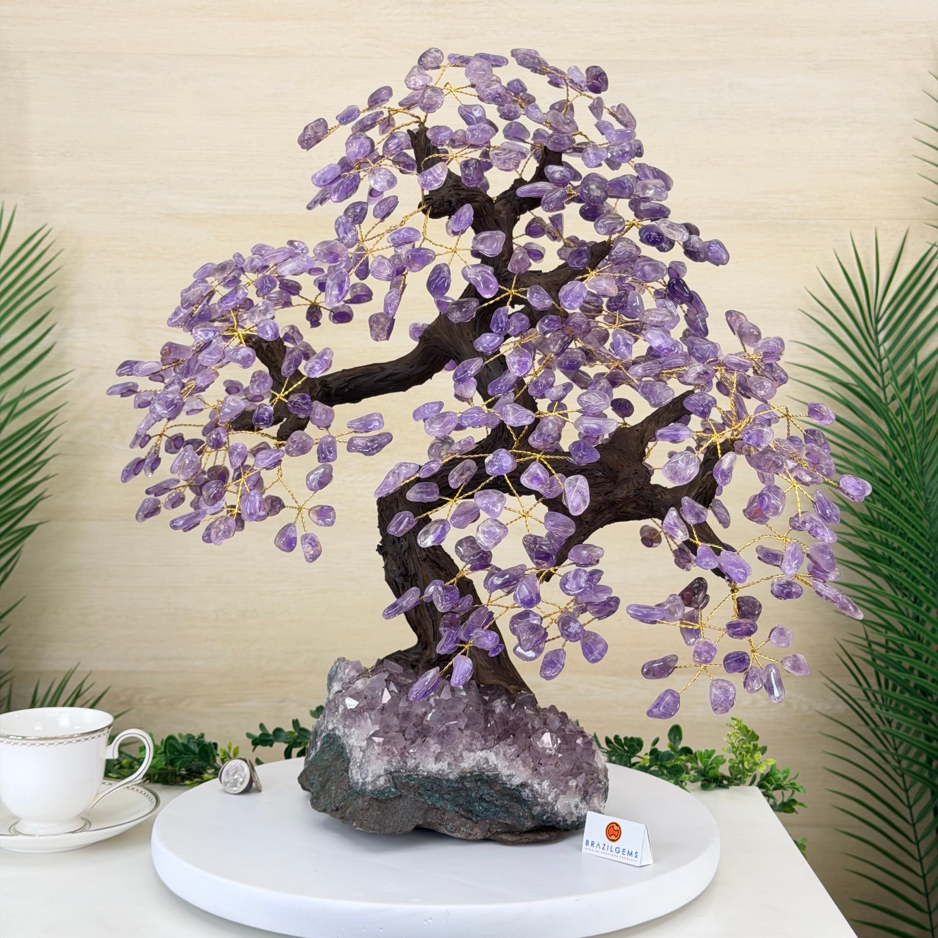 Brazil Gems® brings you Handmade Amethyst Gemstone trees with a crystal cluster base, resin trunk, wired branches and tumbled Amethyst gemstones.