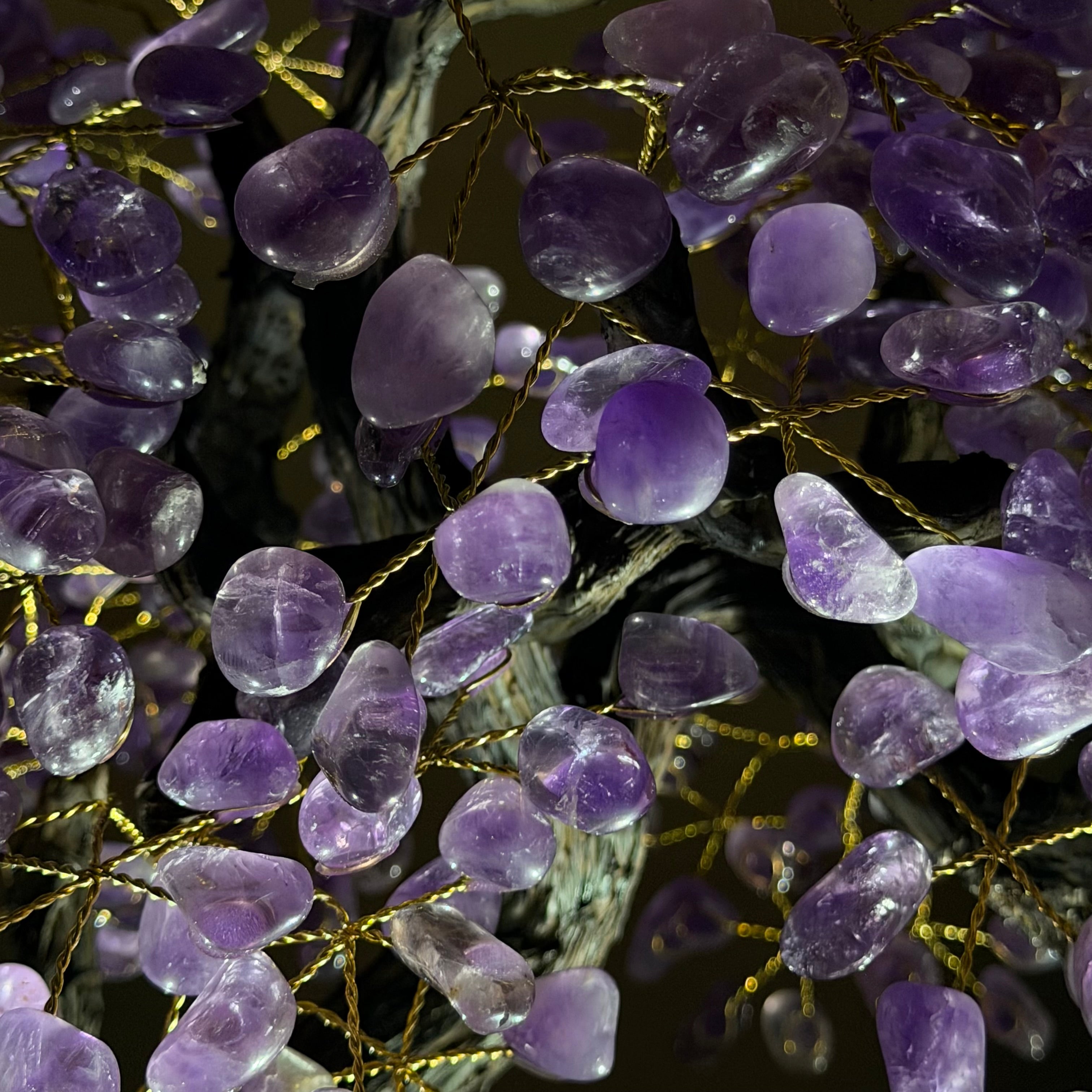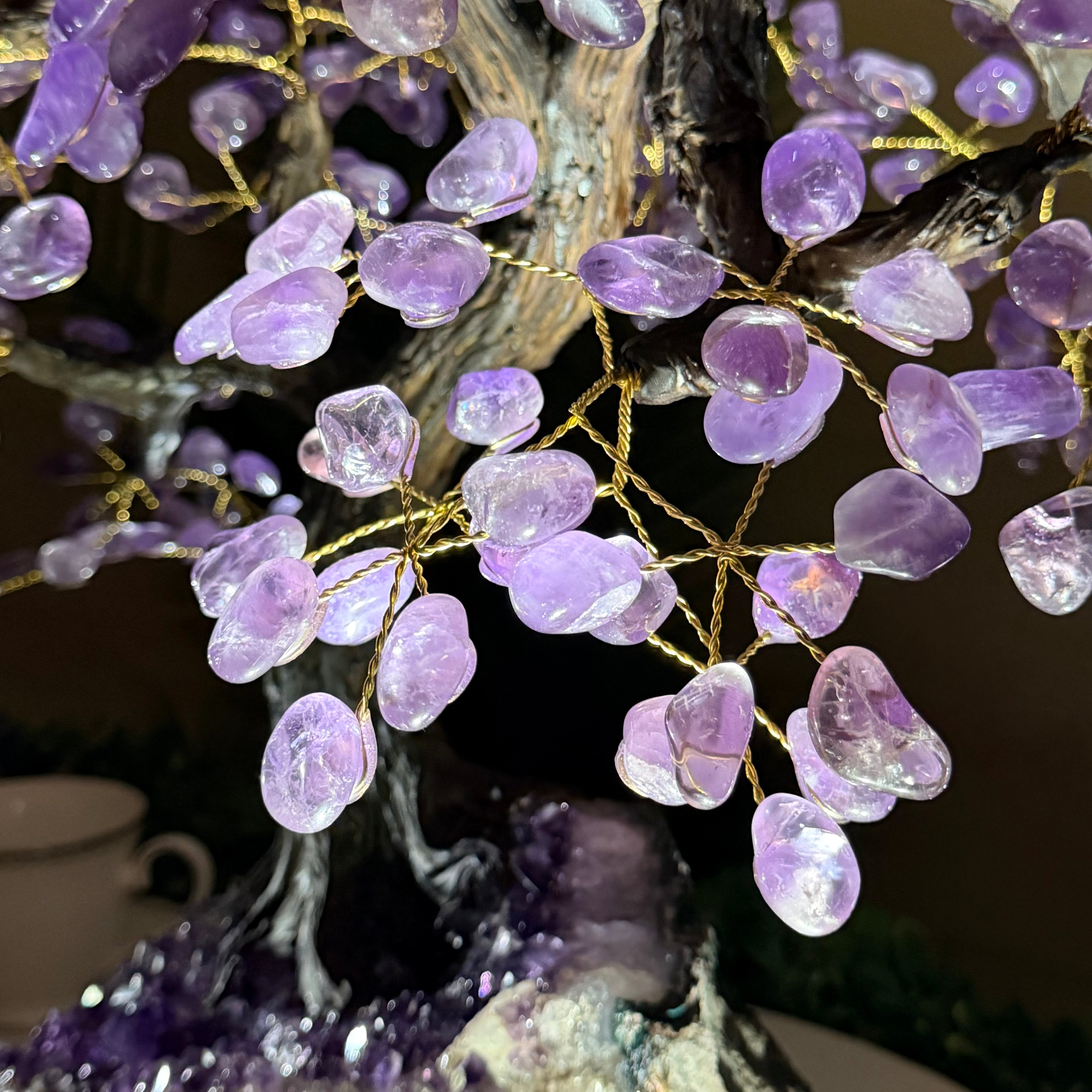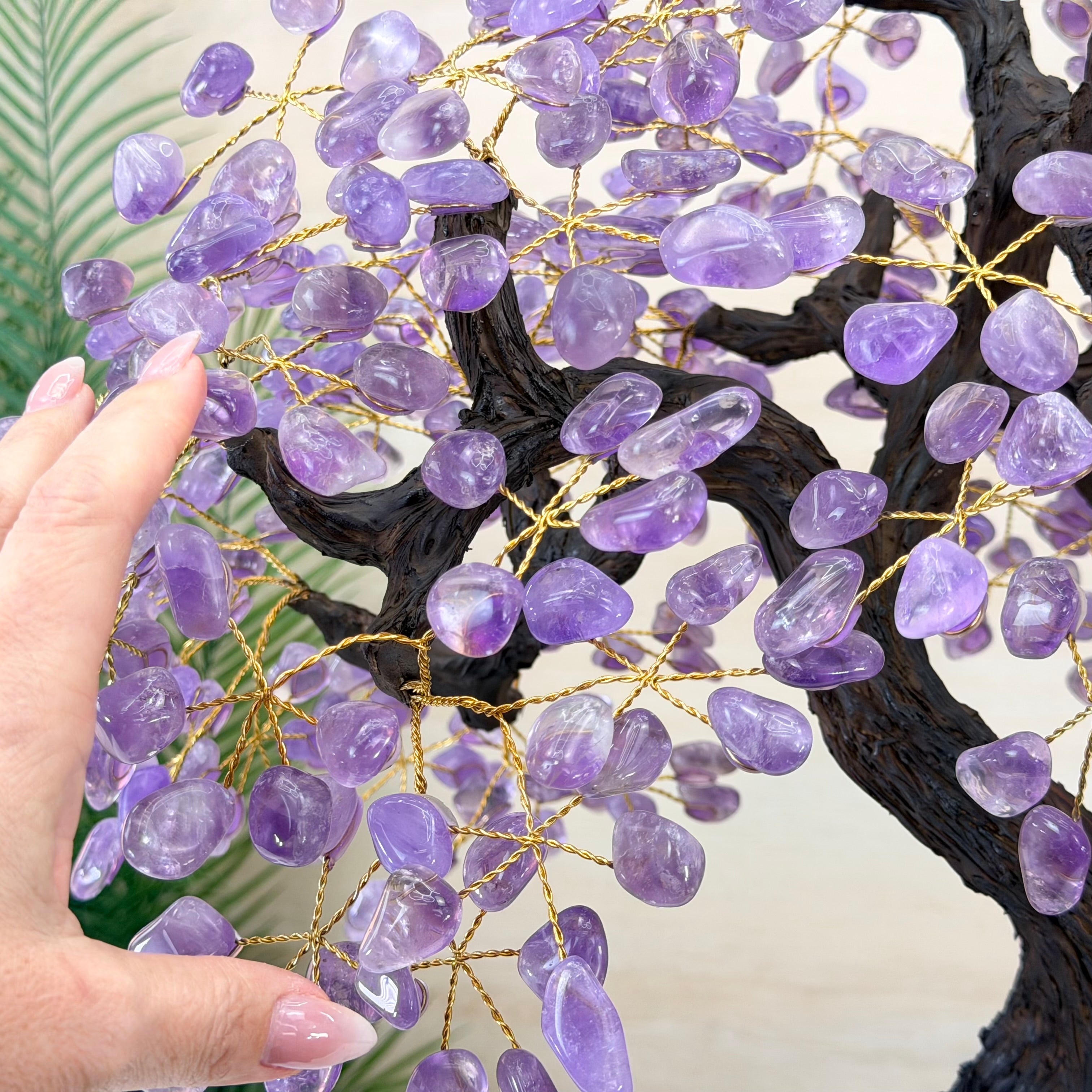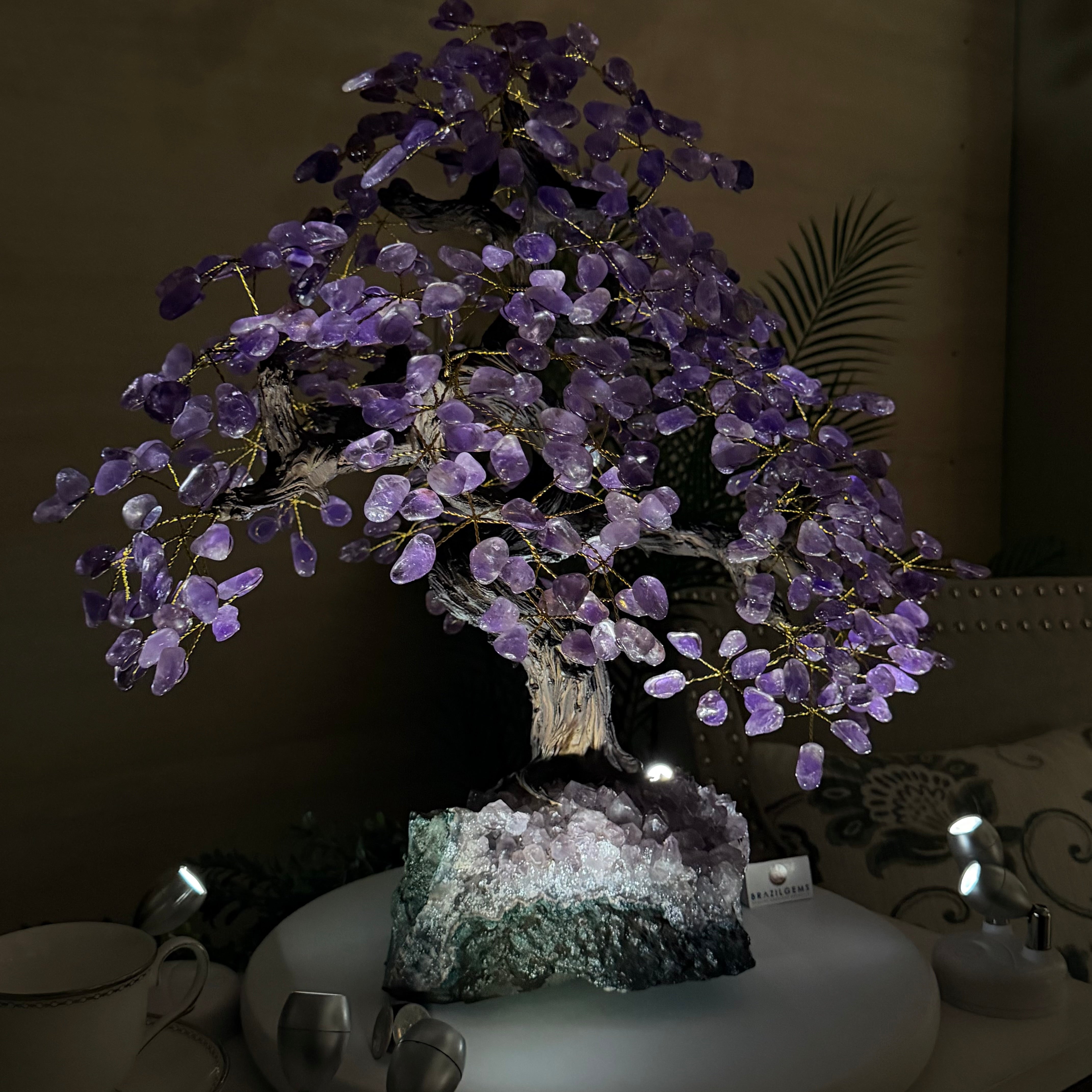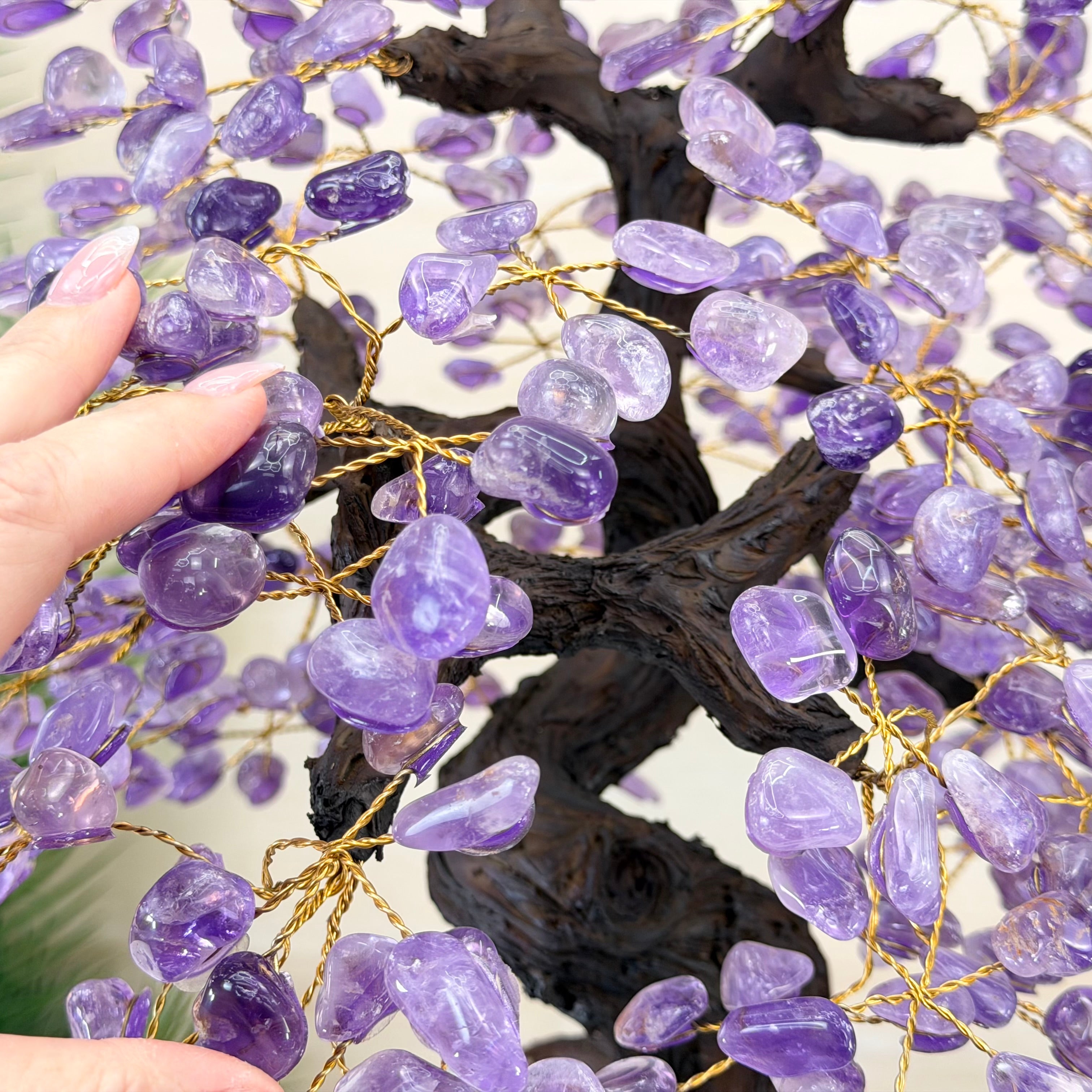 Brazil Gems® brings you Handmade Amethyst Gemstone trees with a crystal cluster base, resin trunk, wired branches and tumbled Amethyst gemstones.