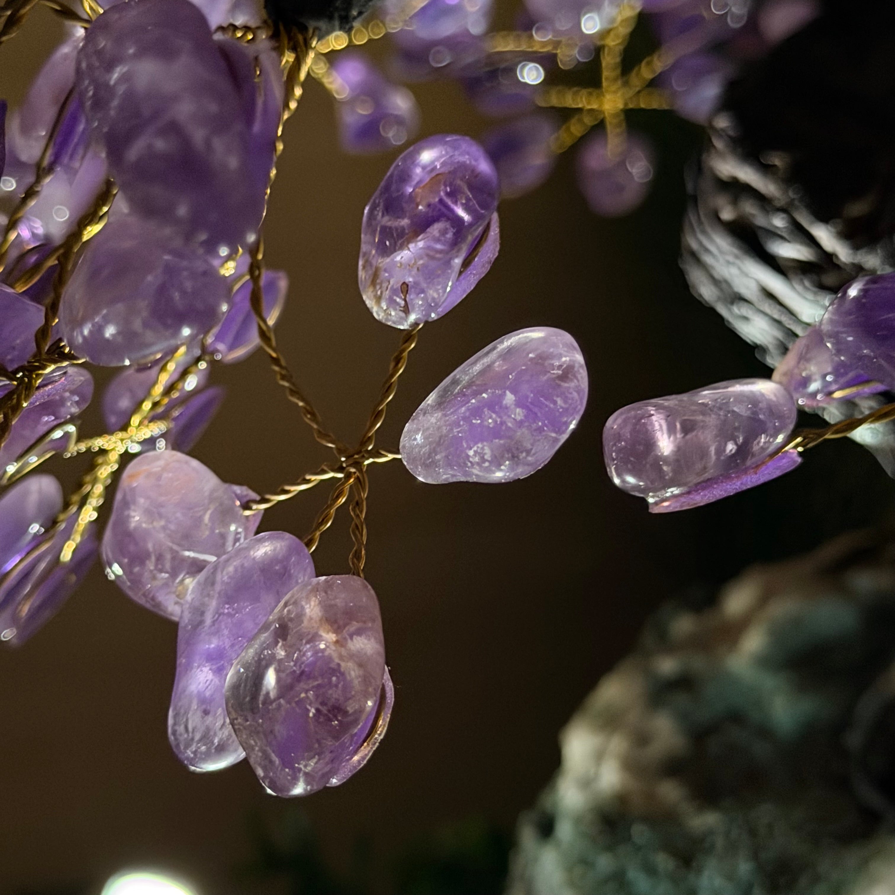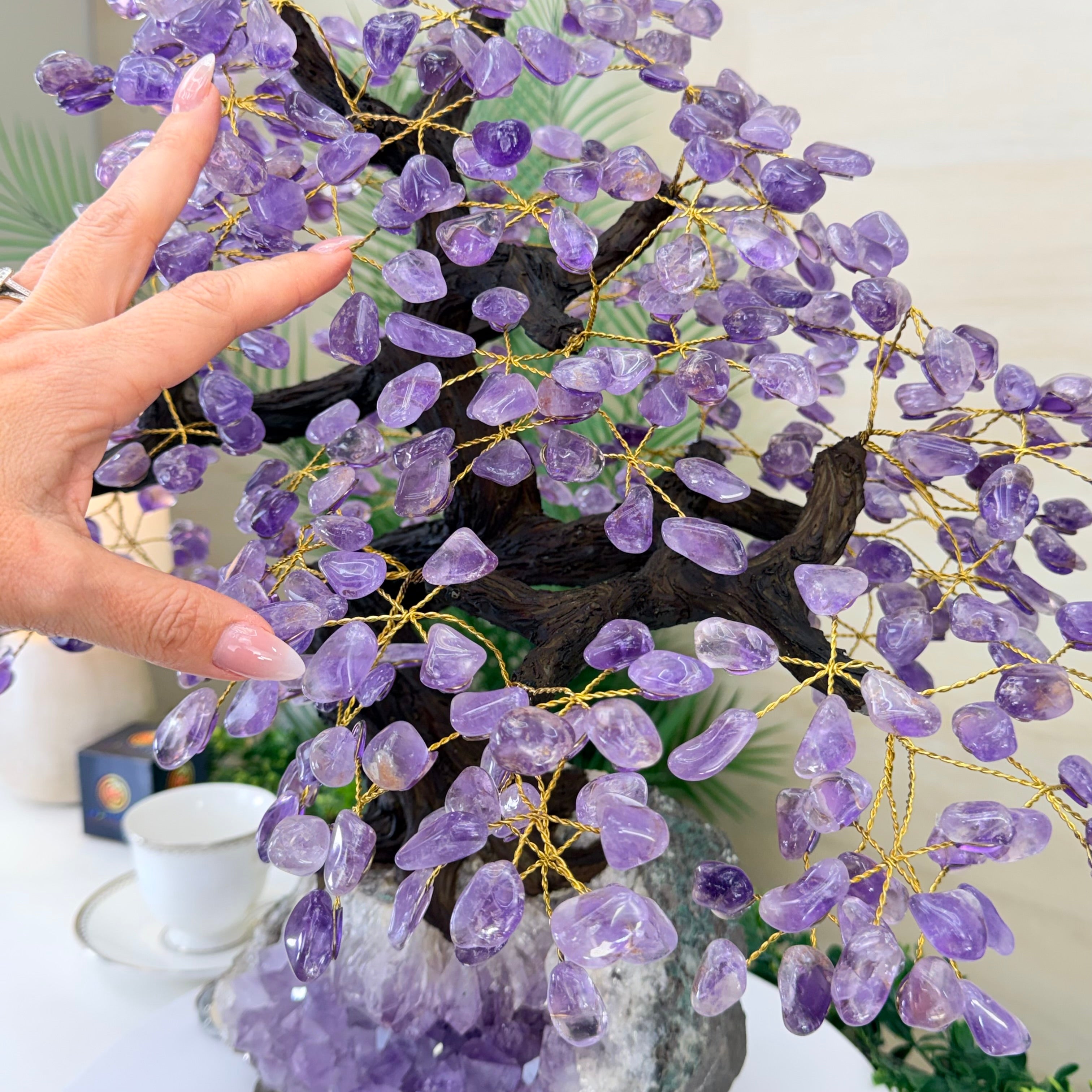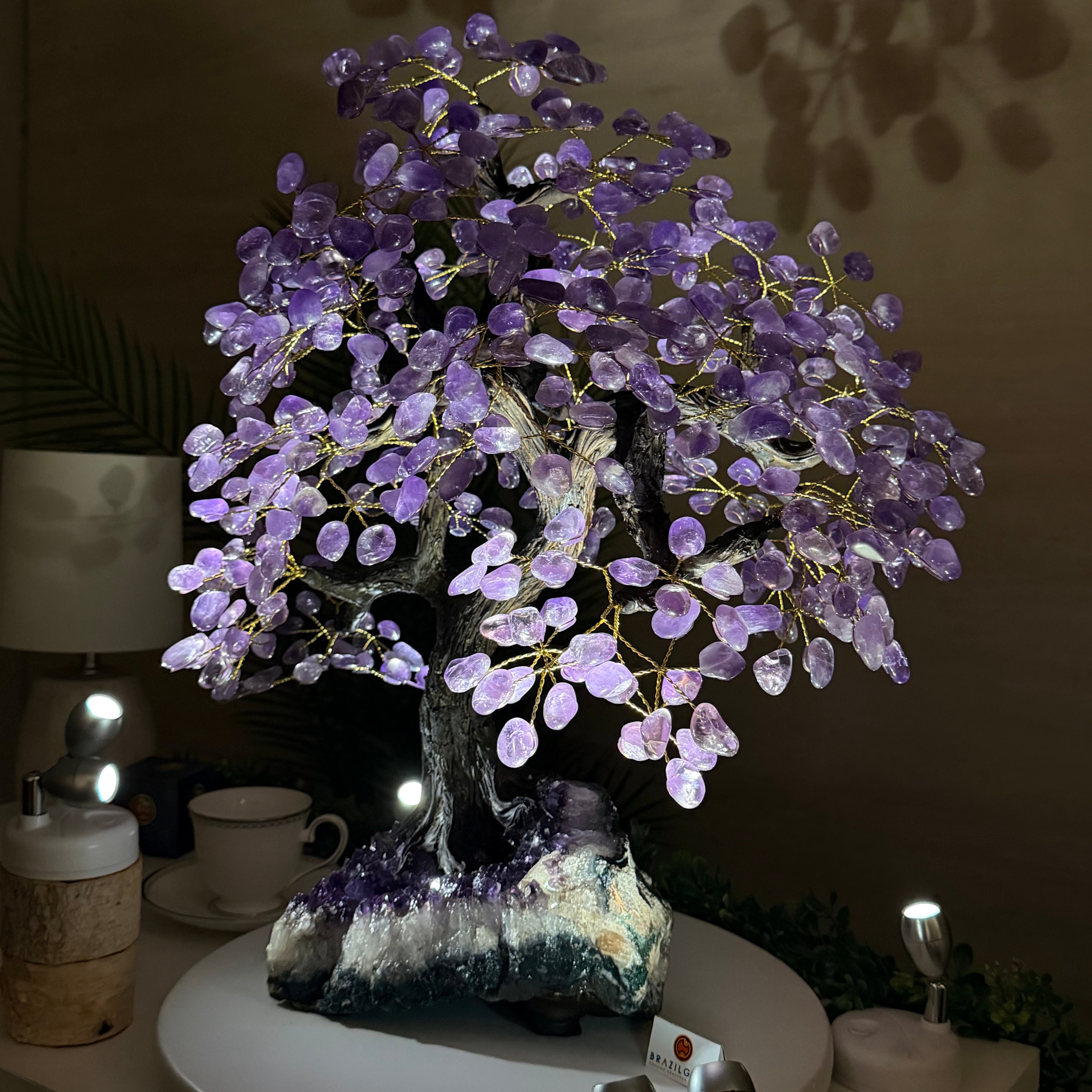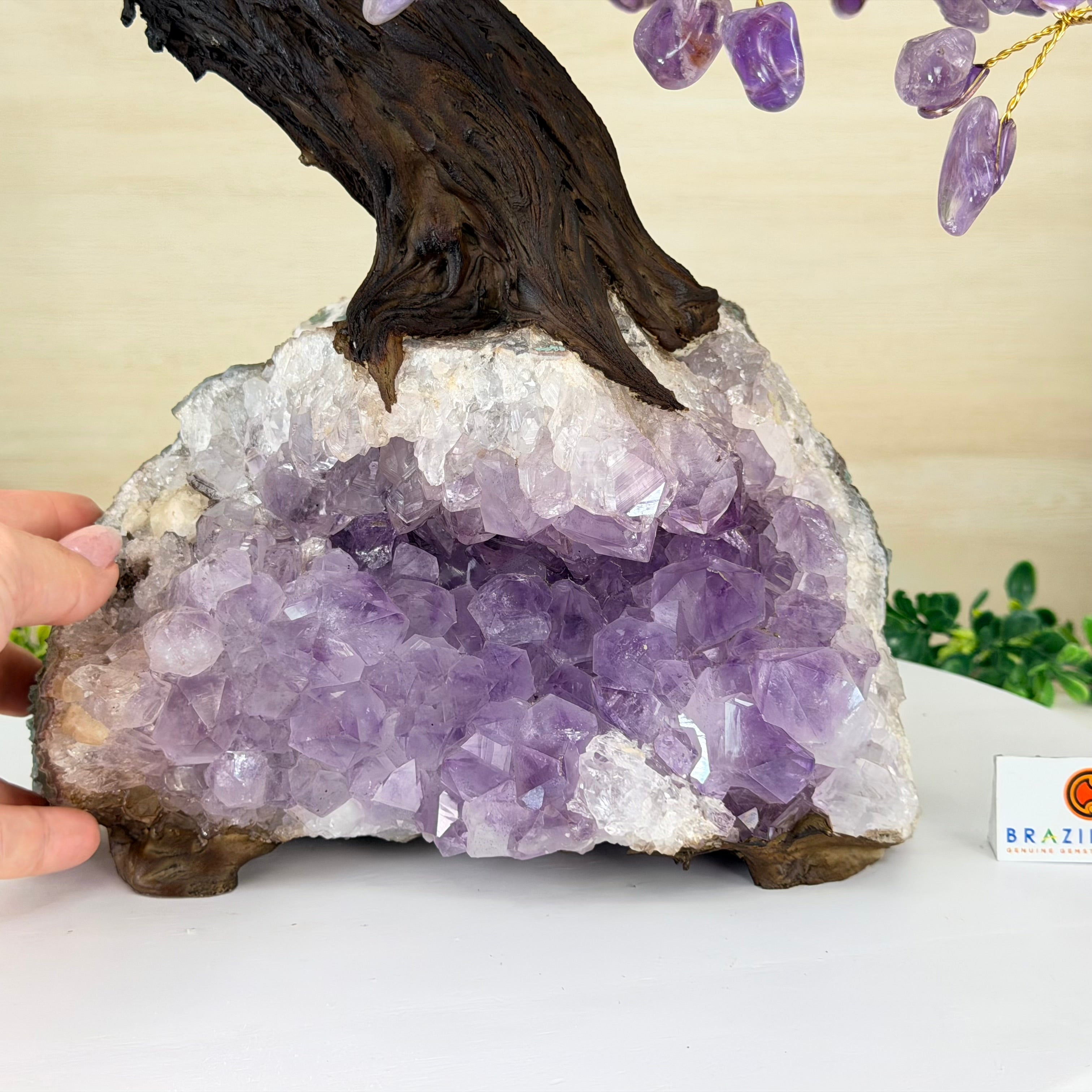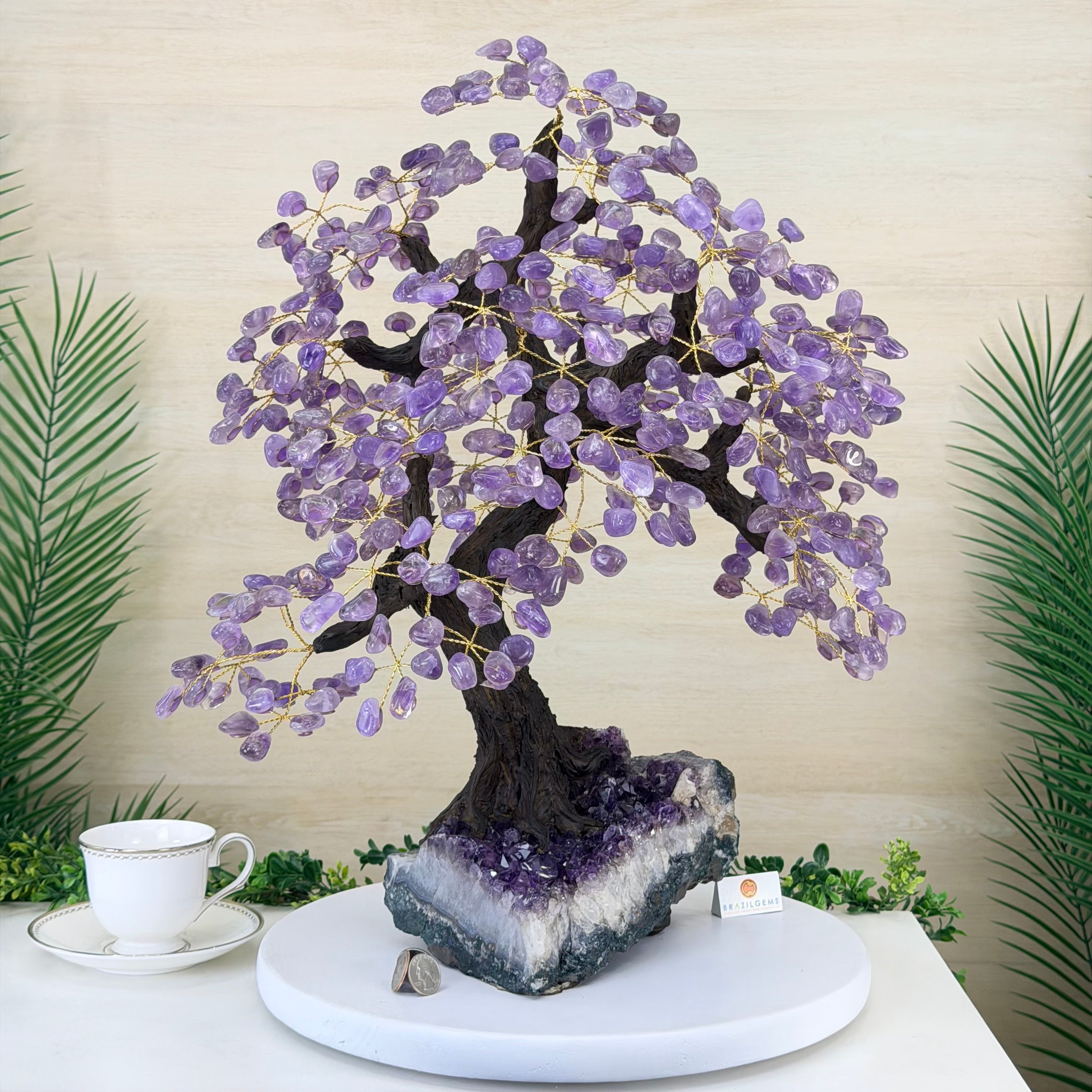 Brazil Gems® brings you Handmade Amethyst Gemstone trees with a crystal cluster base, resin trunk, wired branches and tumbled Amethyst gemstones.