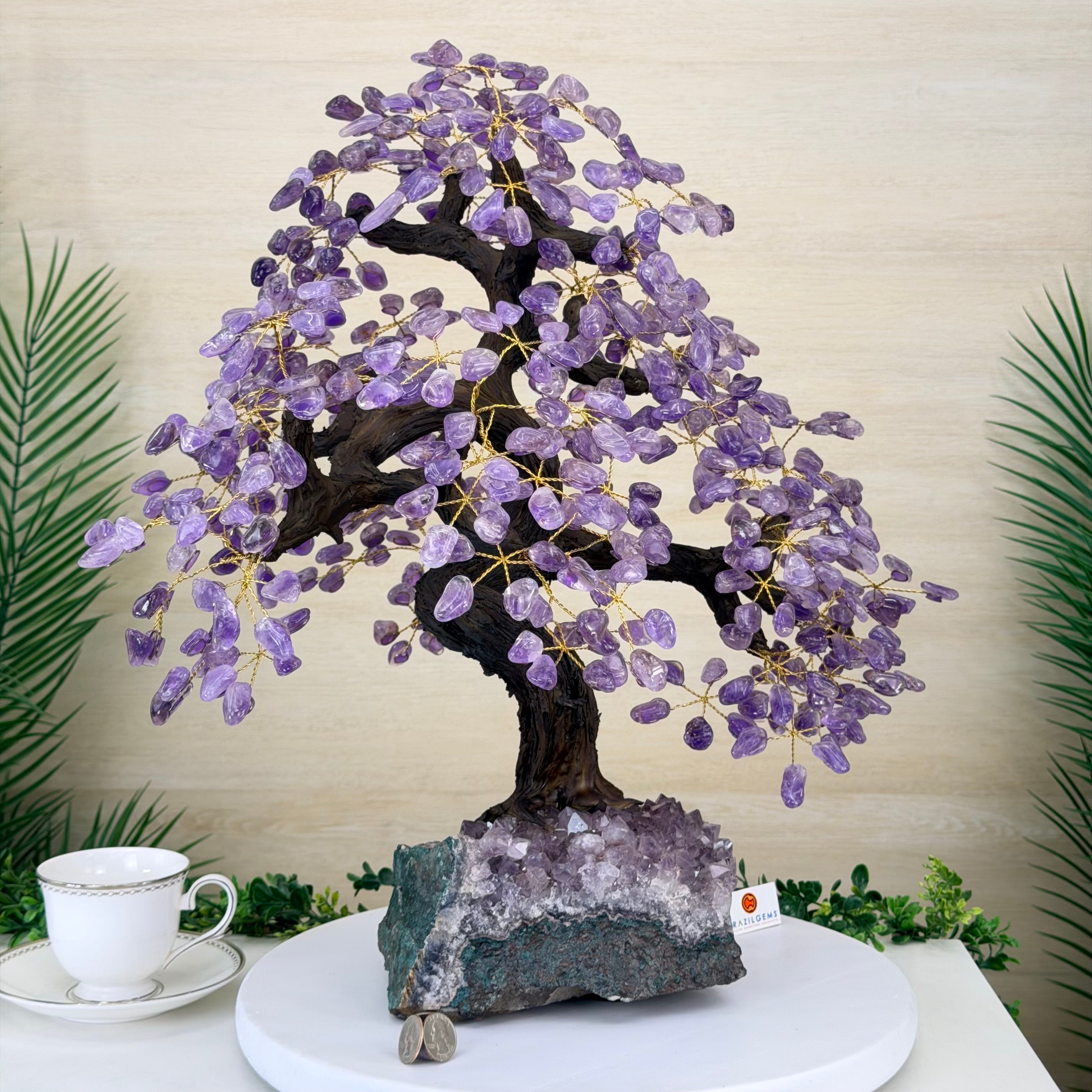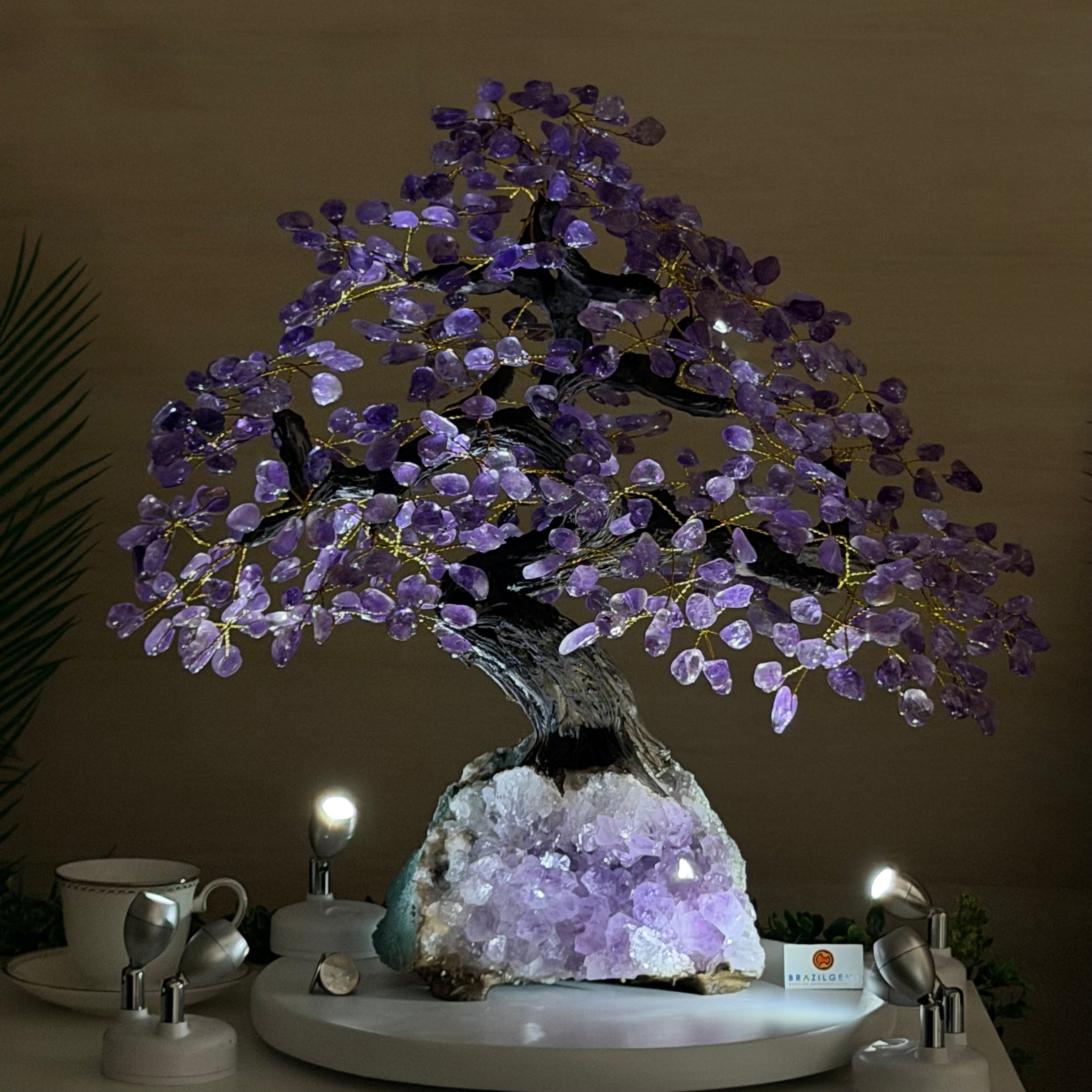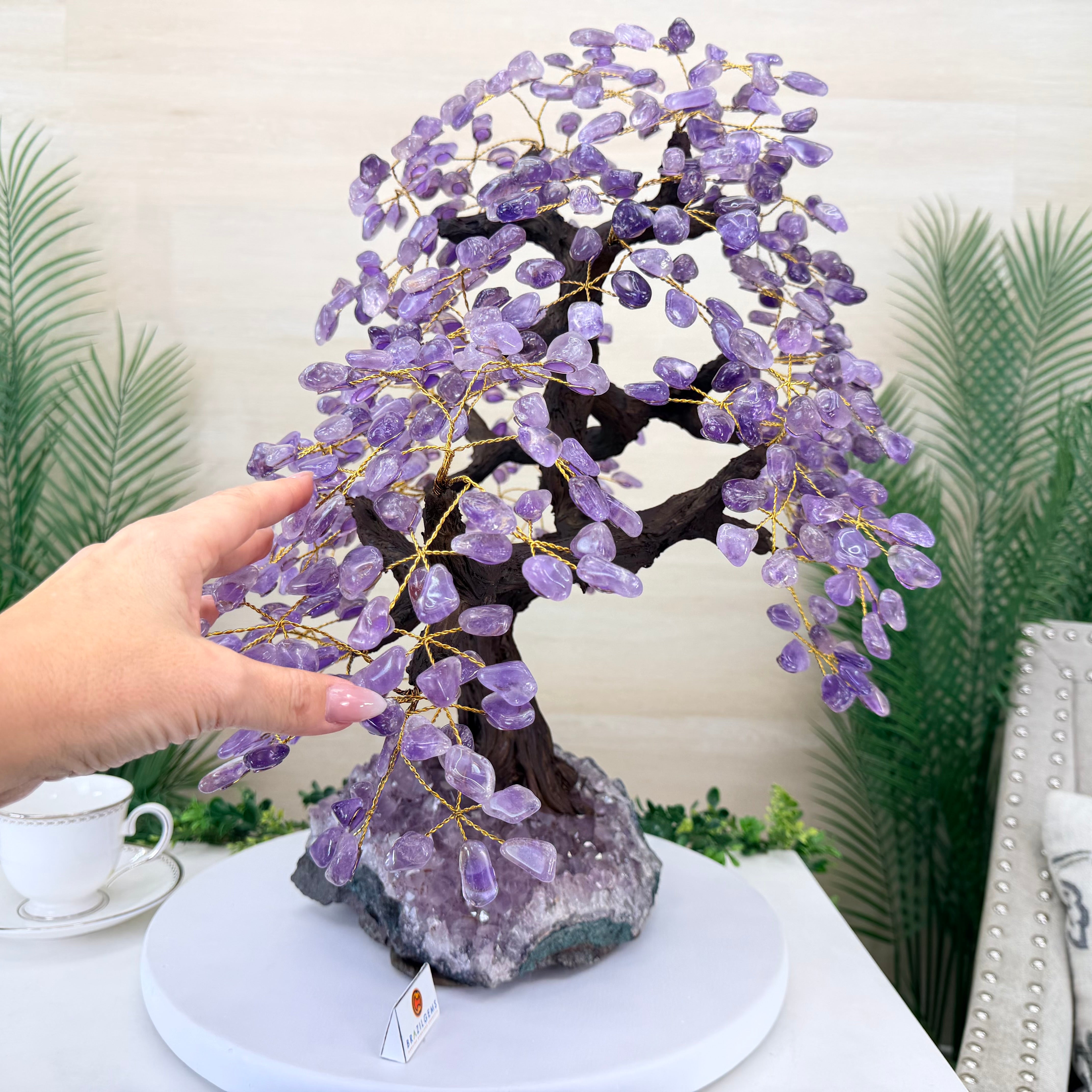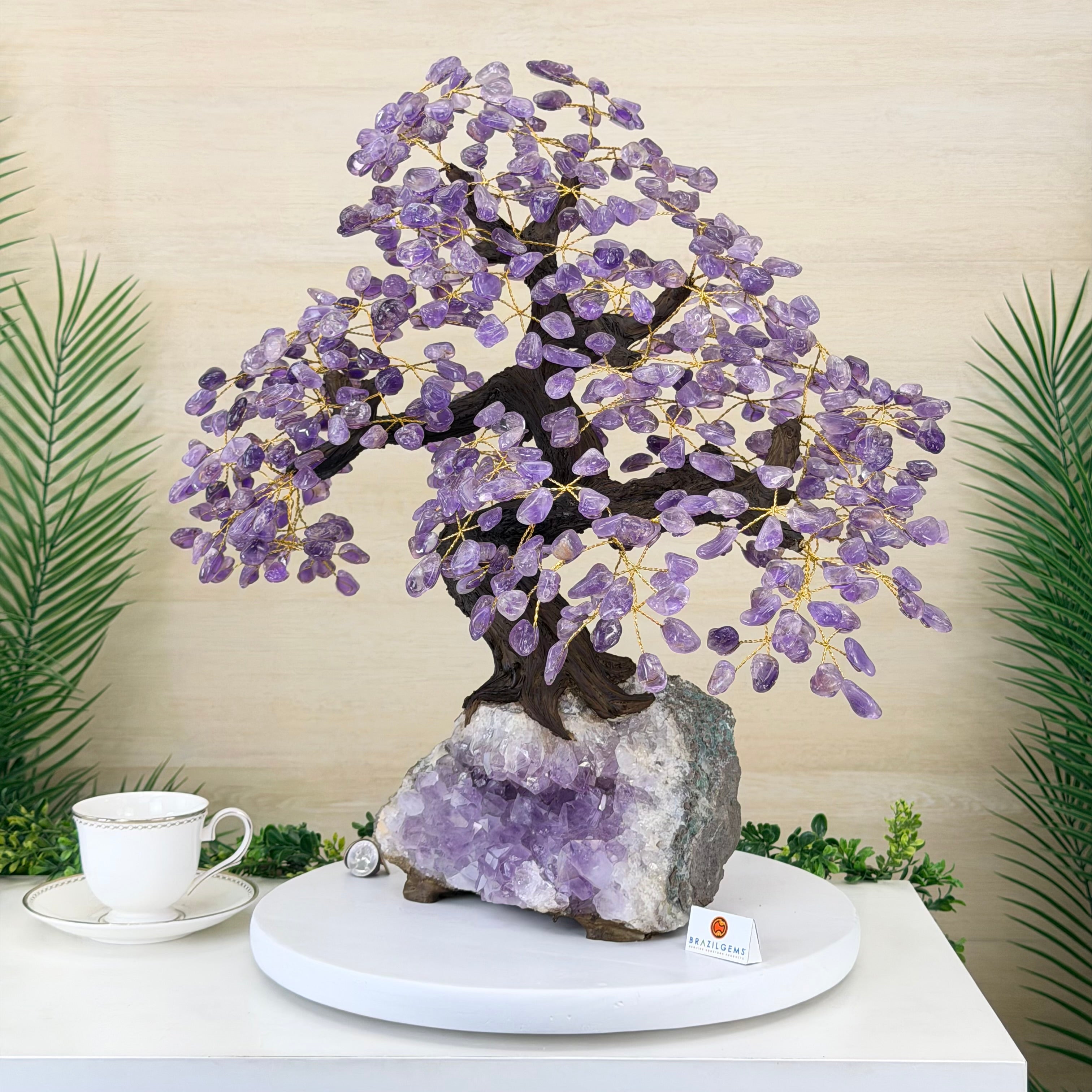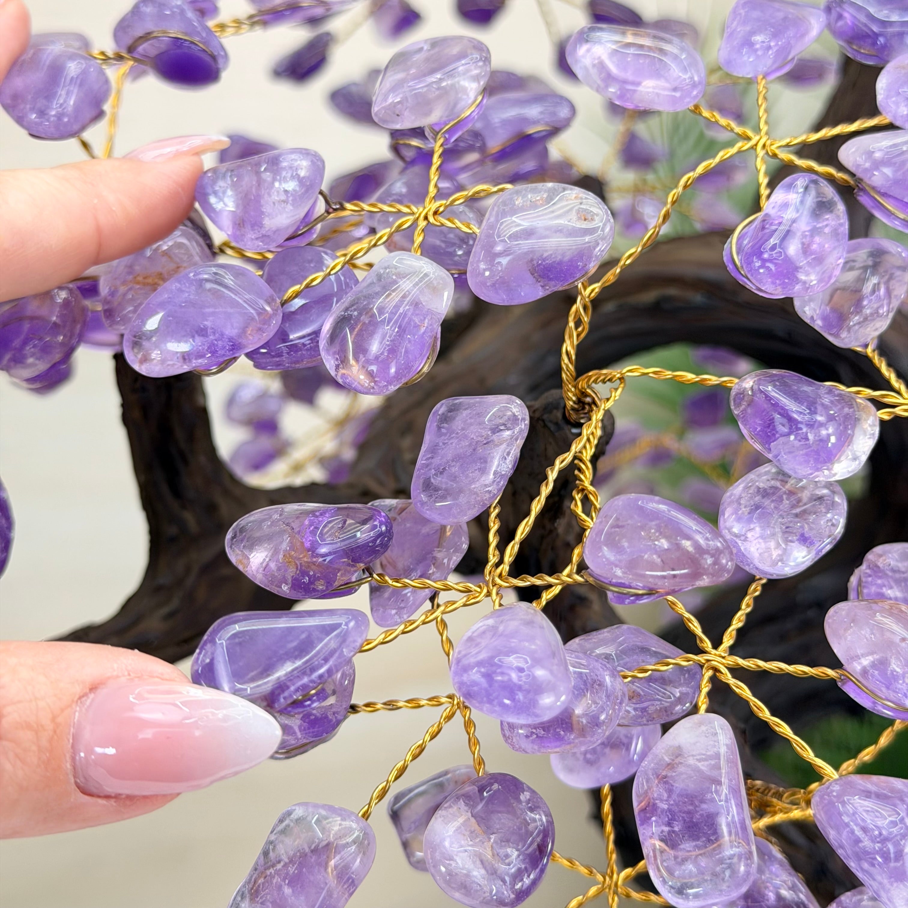 Brazil Gems® brings you Handmade Amethyst Gemstone trees with a crystal cluster base, resin trunk, wired branches and tumbled Amethyst gemstones.