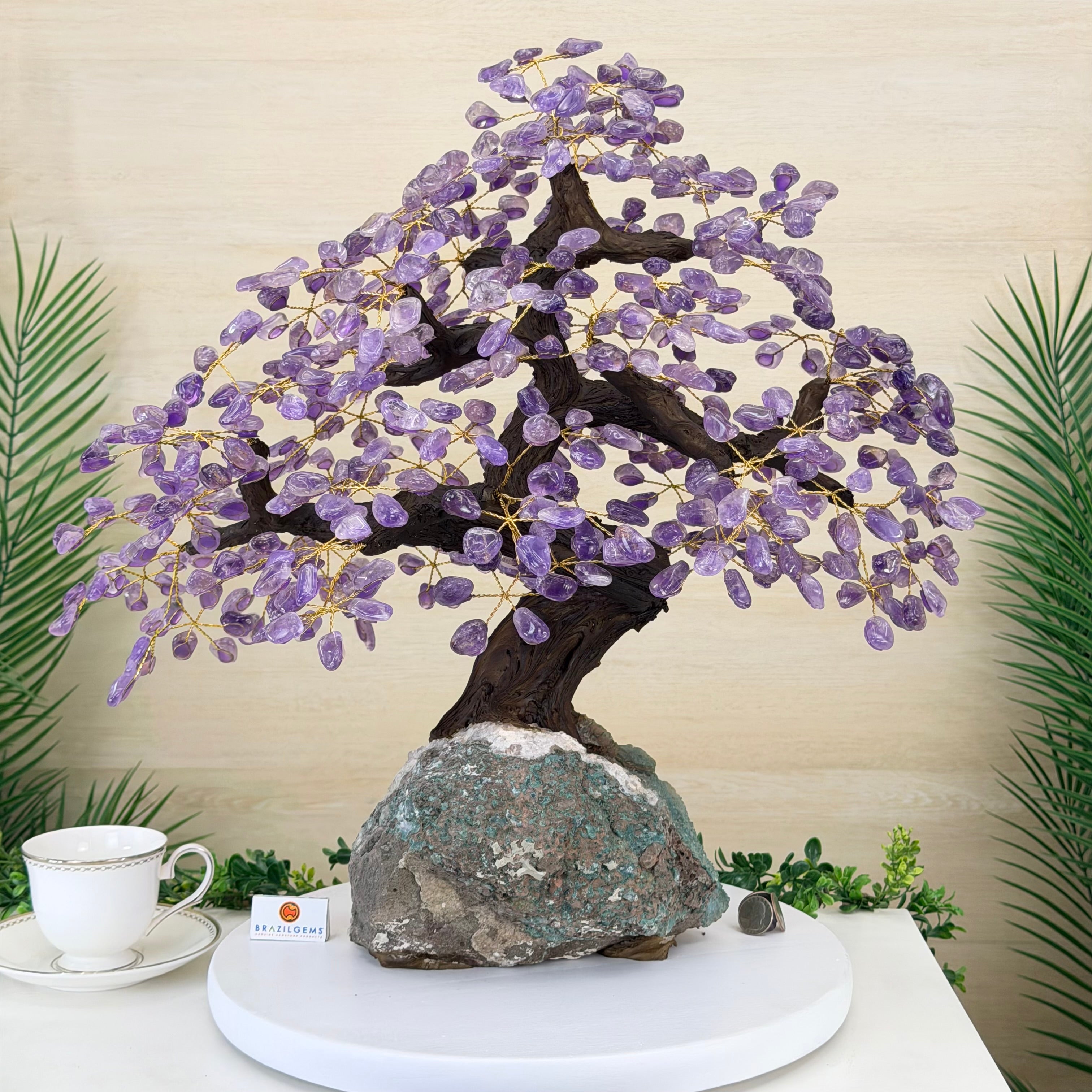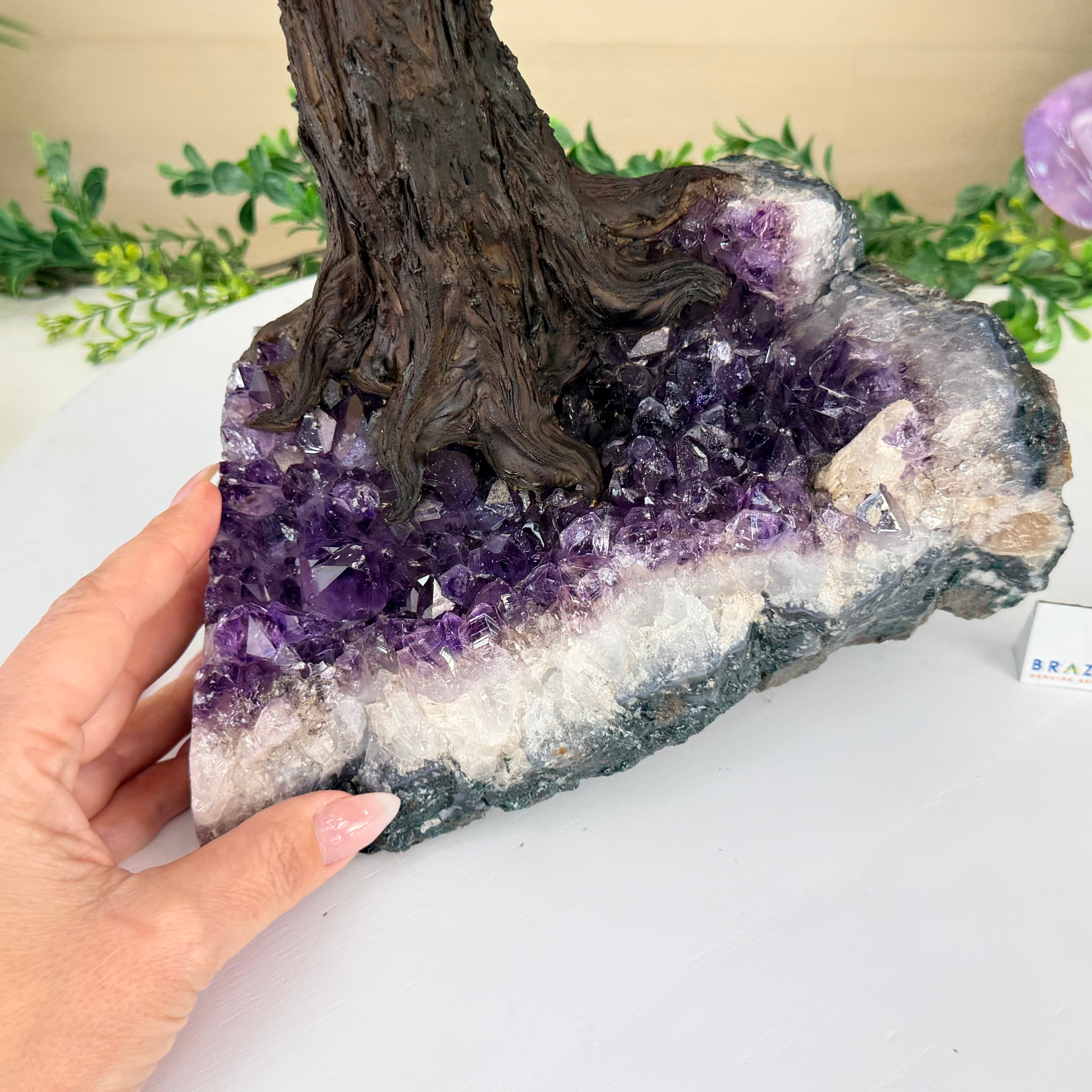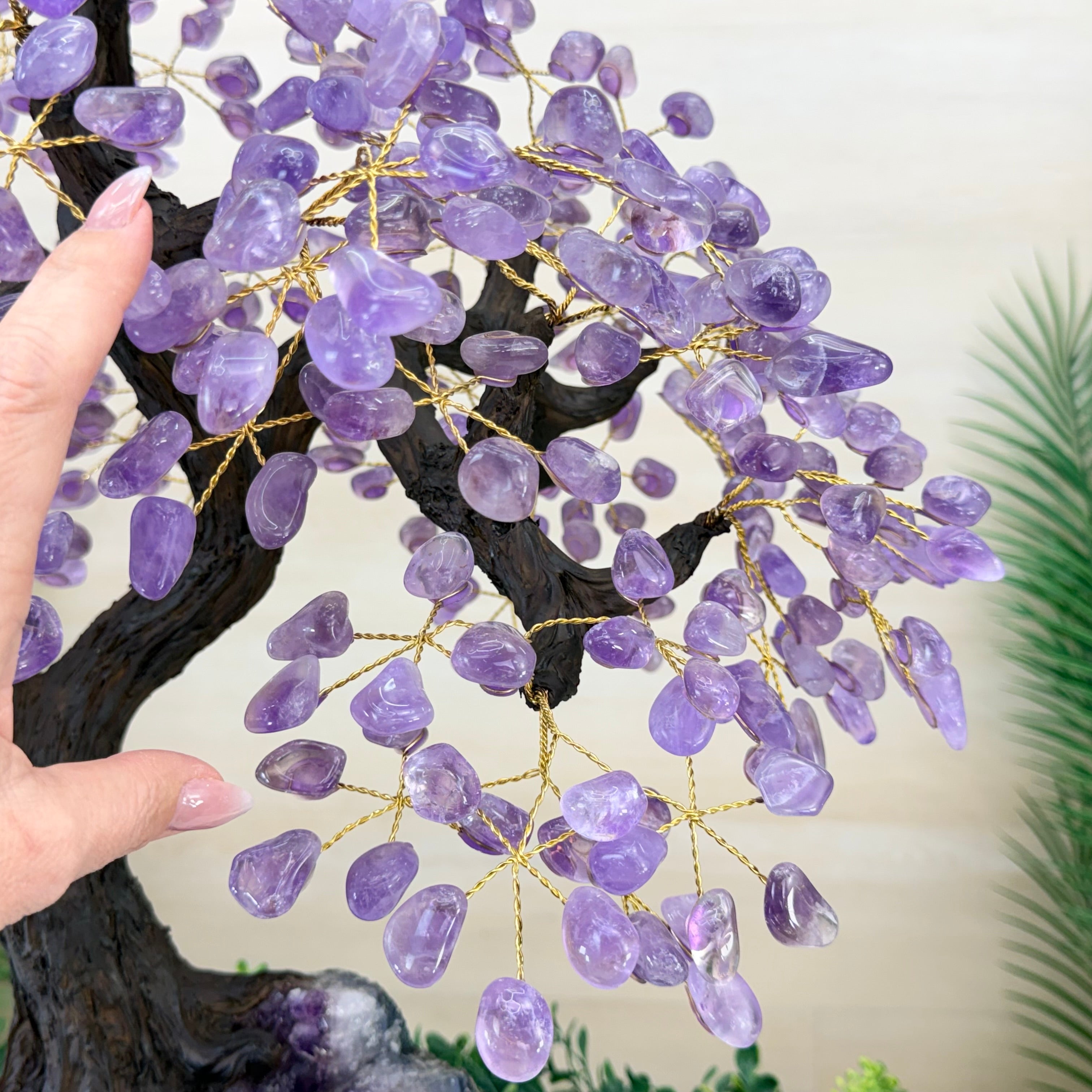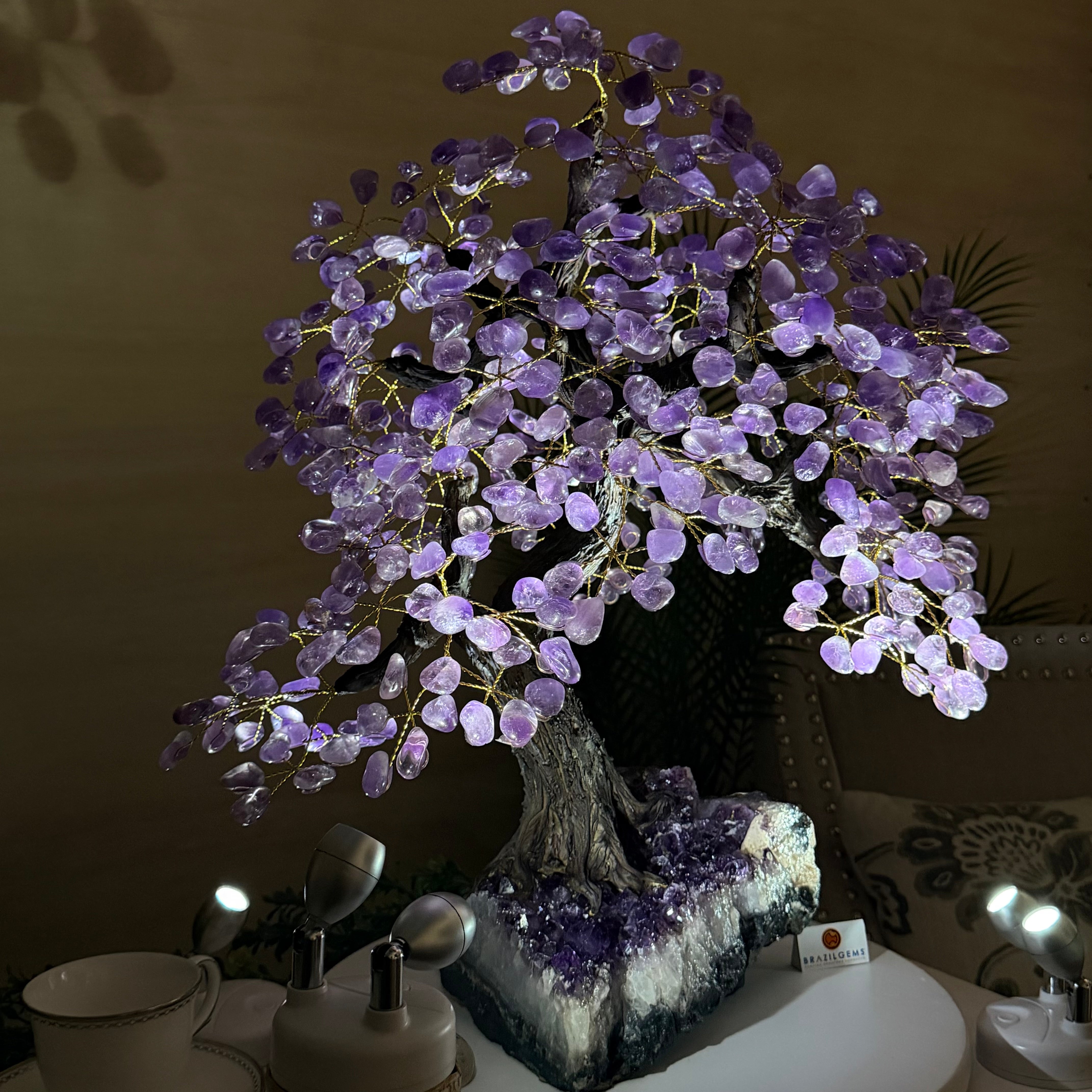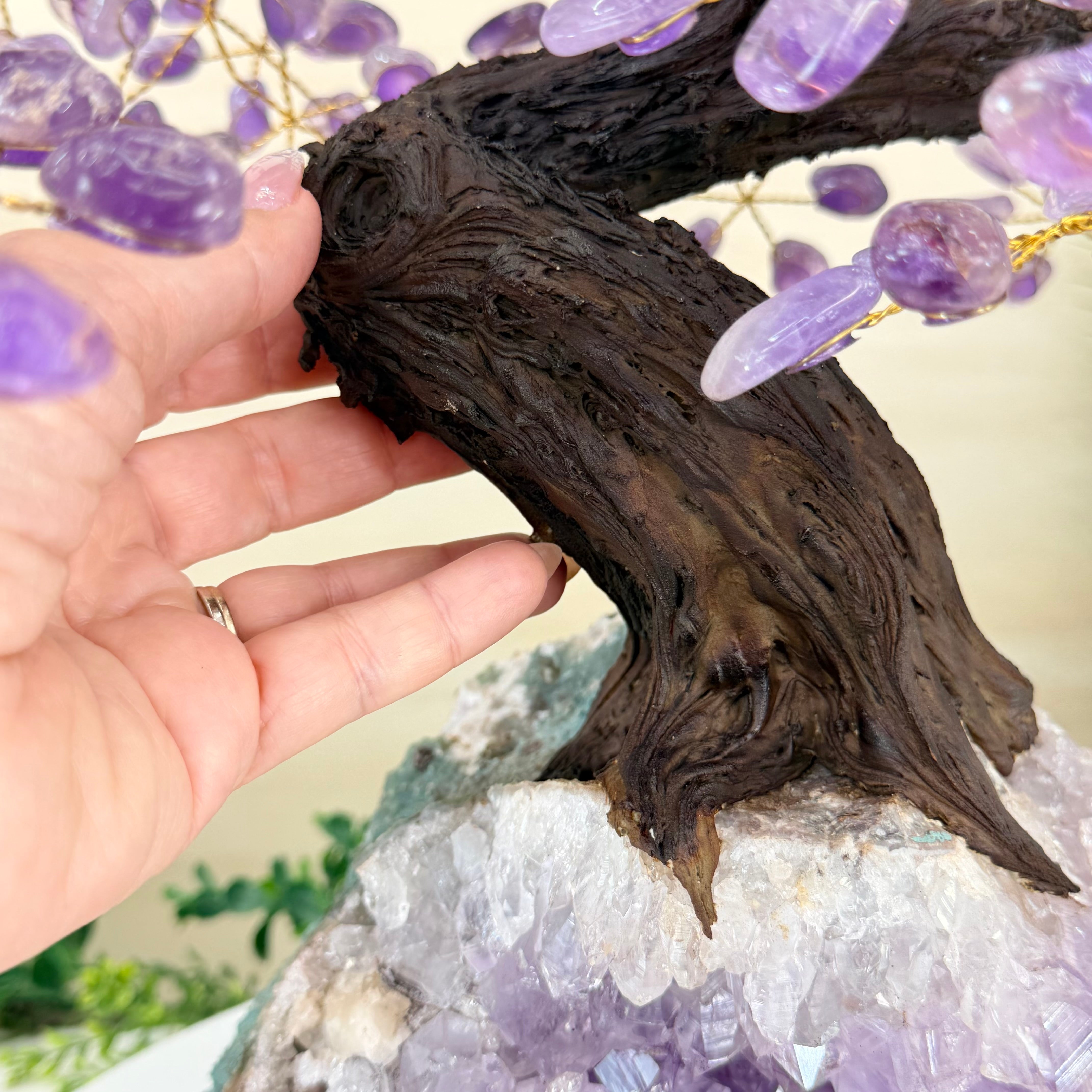 Brazil Gems® brings you Handmade Amethyst Gemstone trees with a crystal cluster base, resin trunk, wired branches and tumbled Amethyst gemstones.