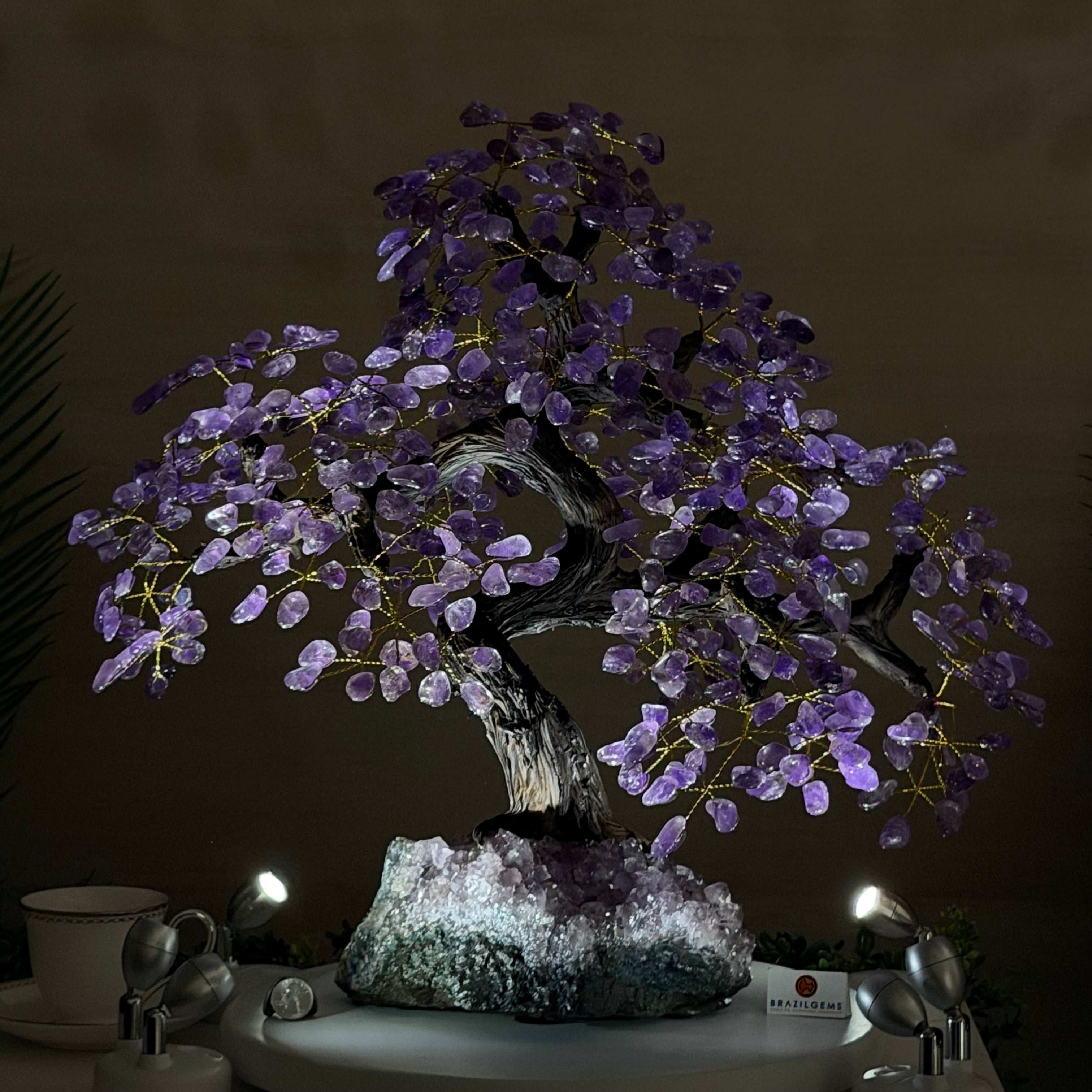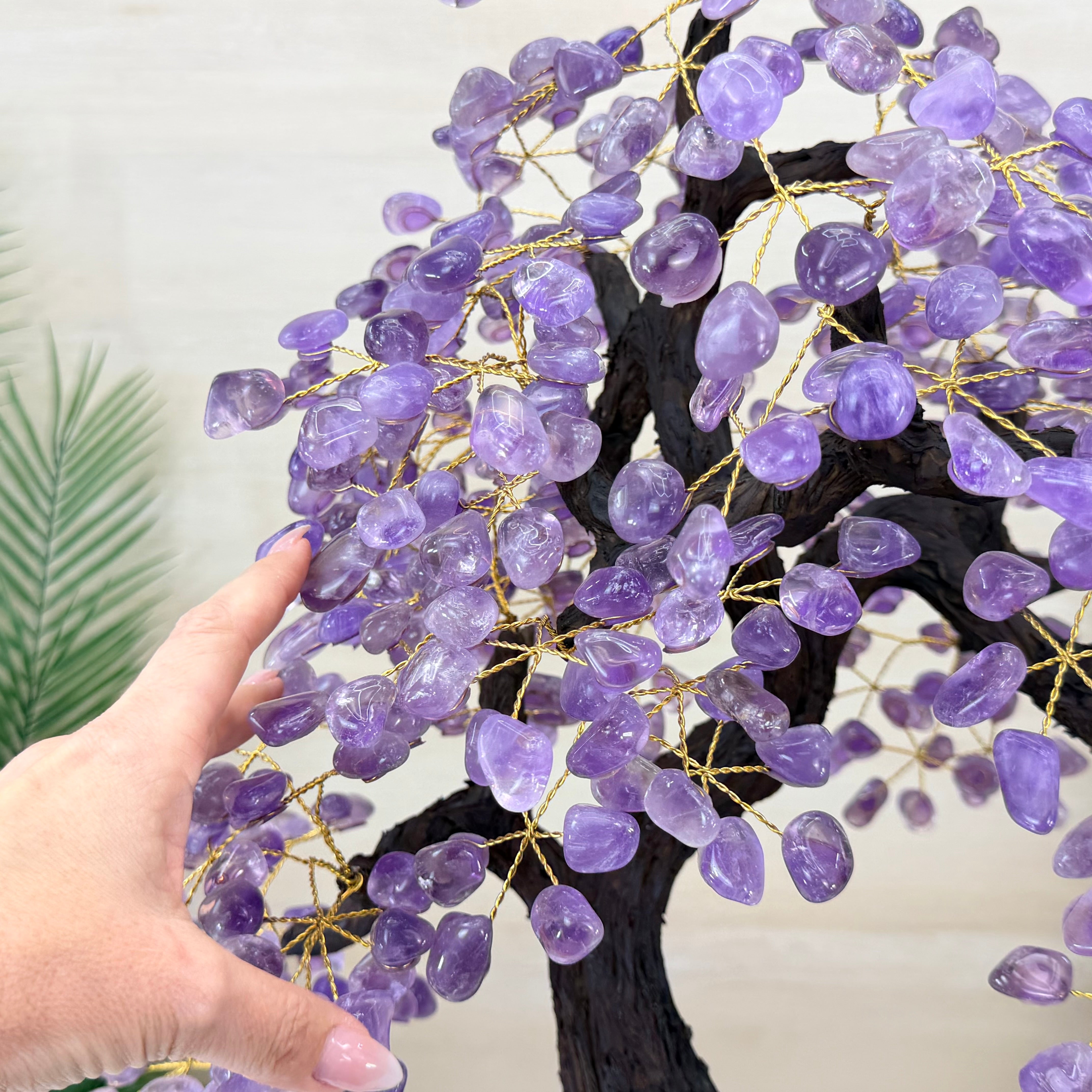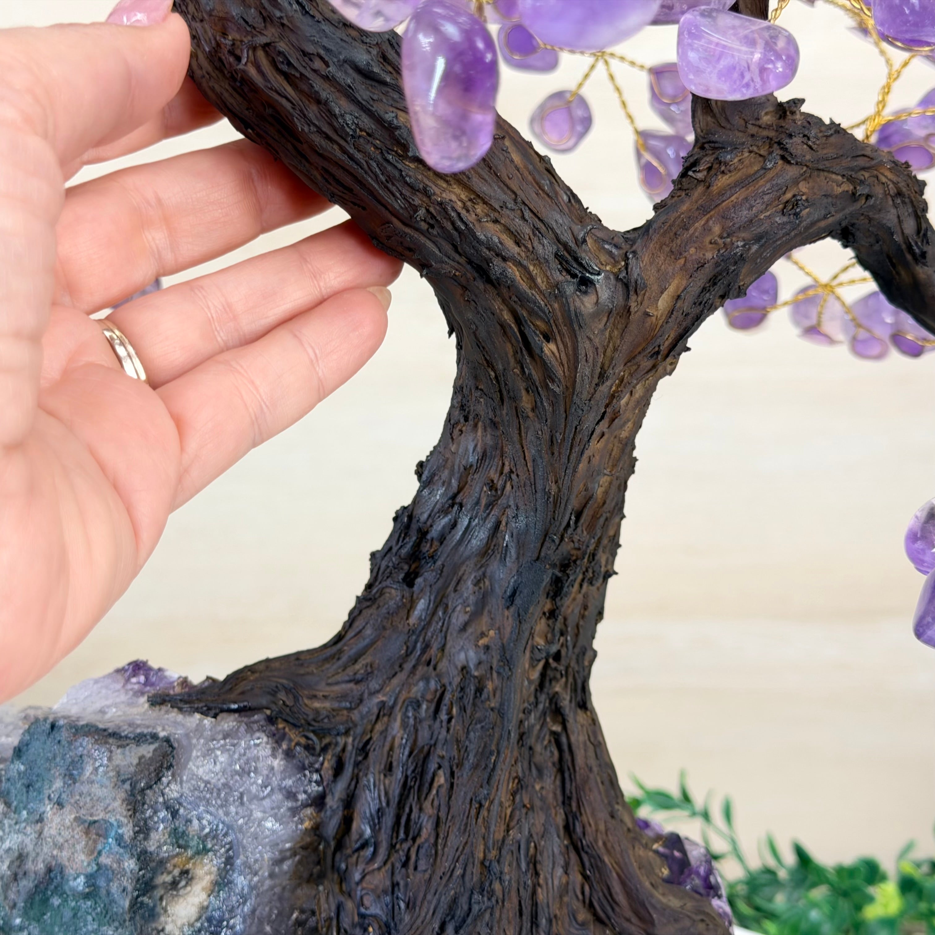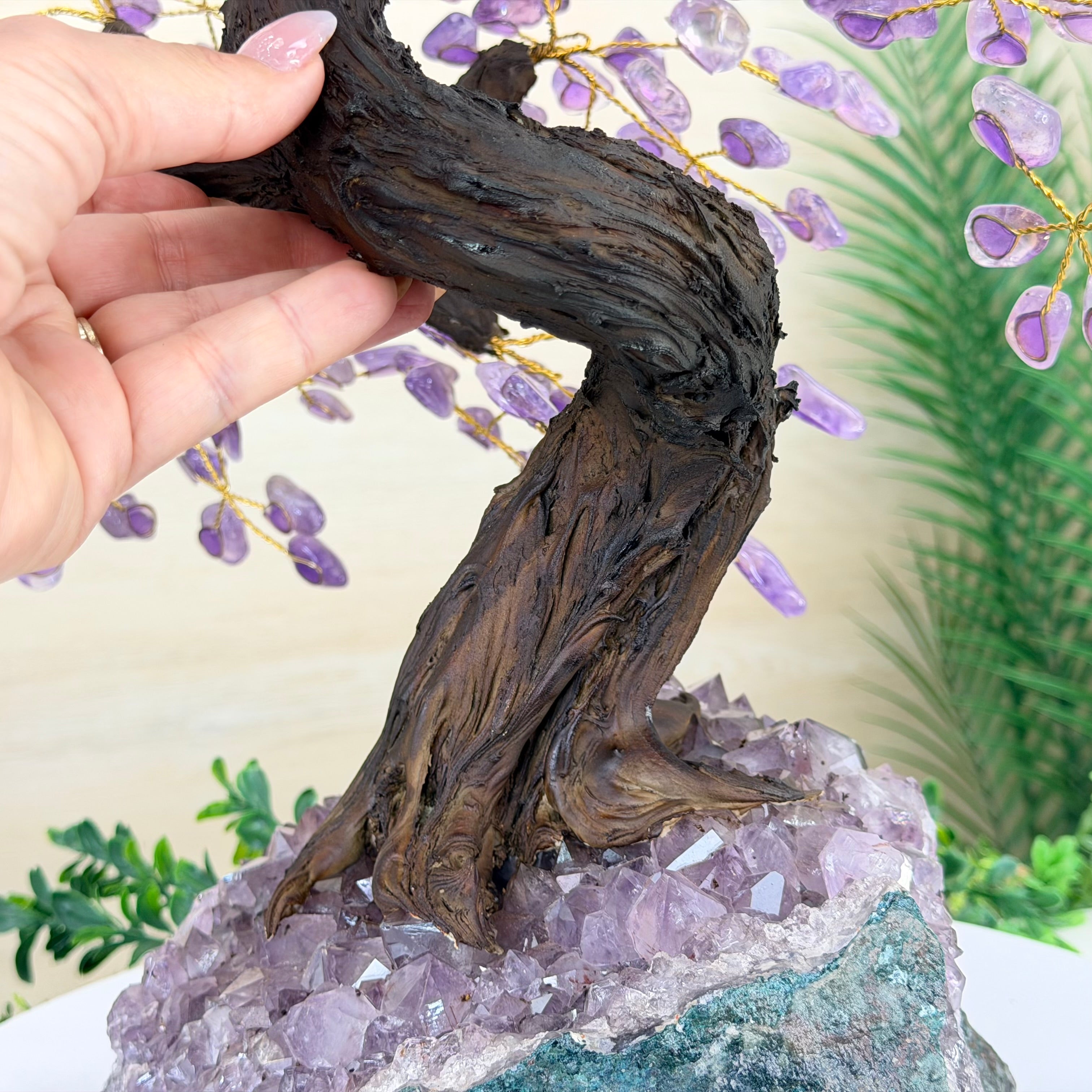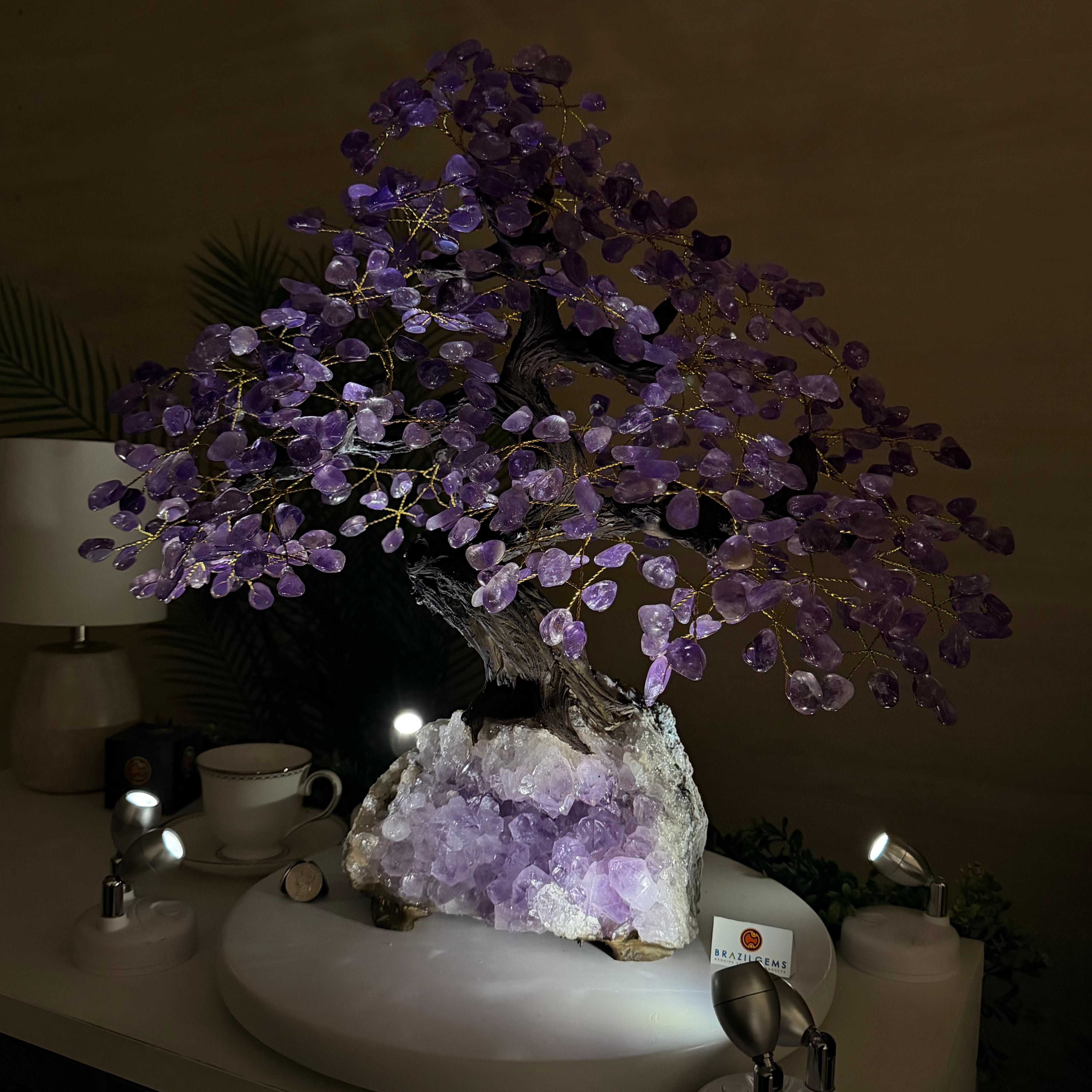 Brazil Gems® brings you Handmade Amethyst Gemstone trees with a crystal cluster base, resin trunk, wired branches and tumbled Amethyst gemstones.