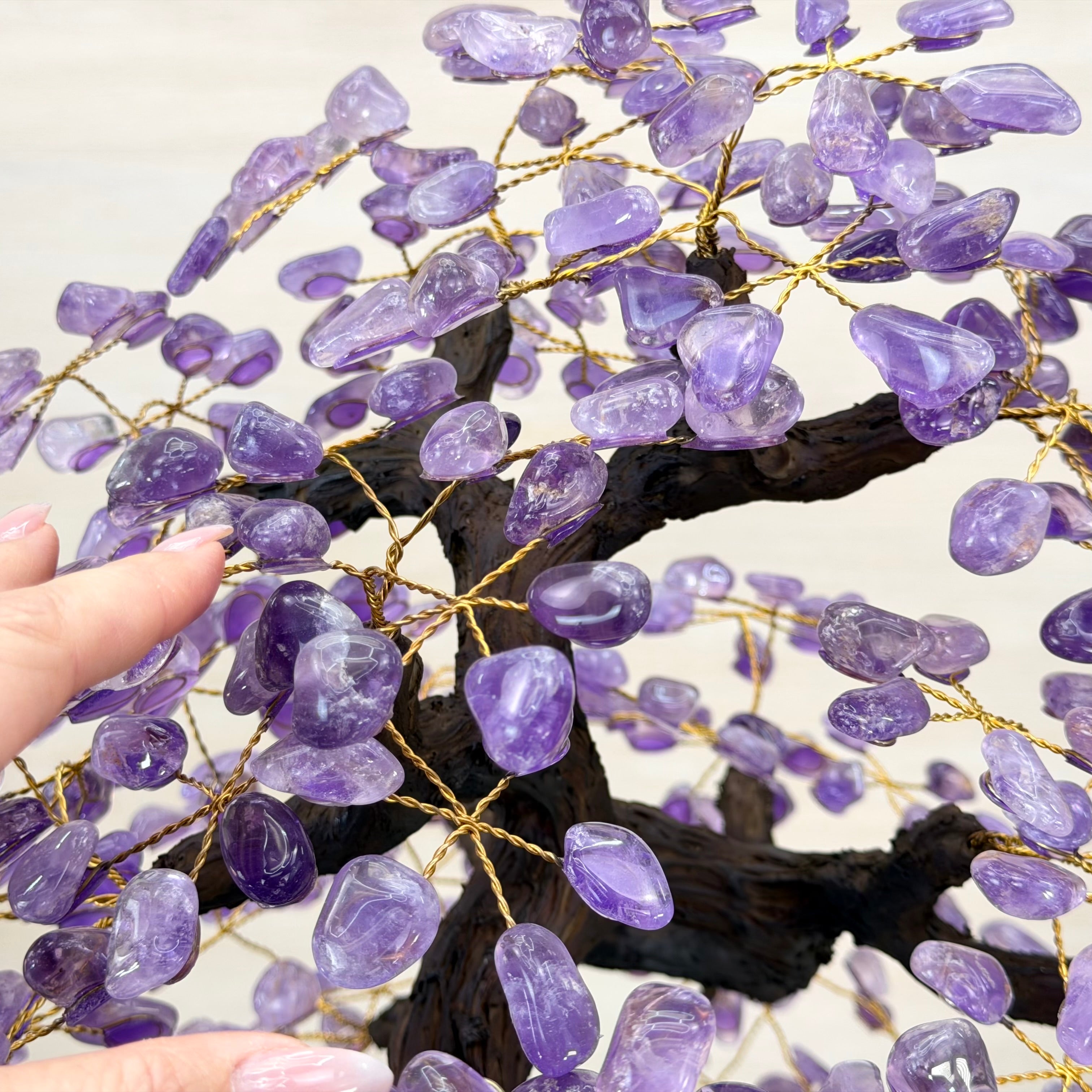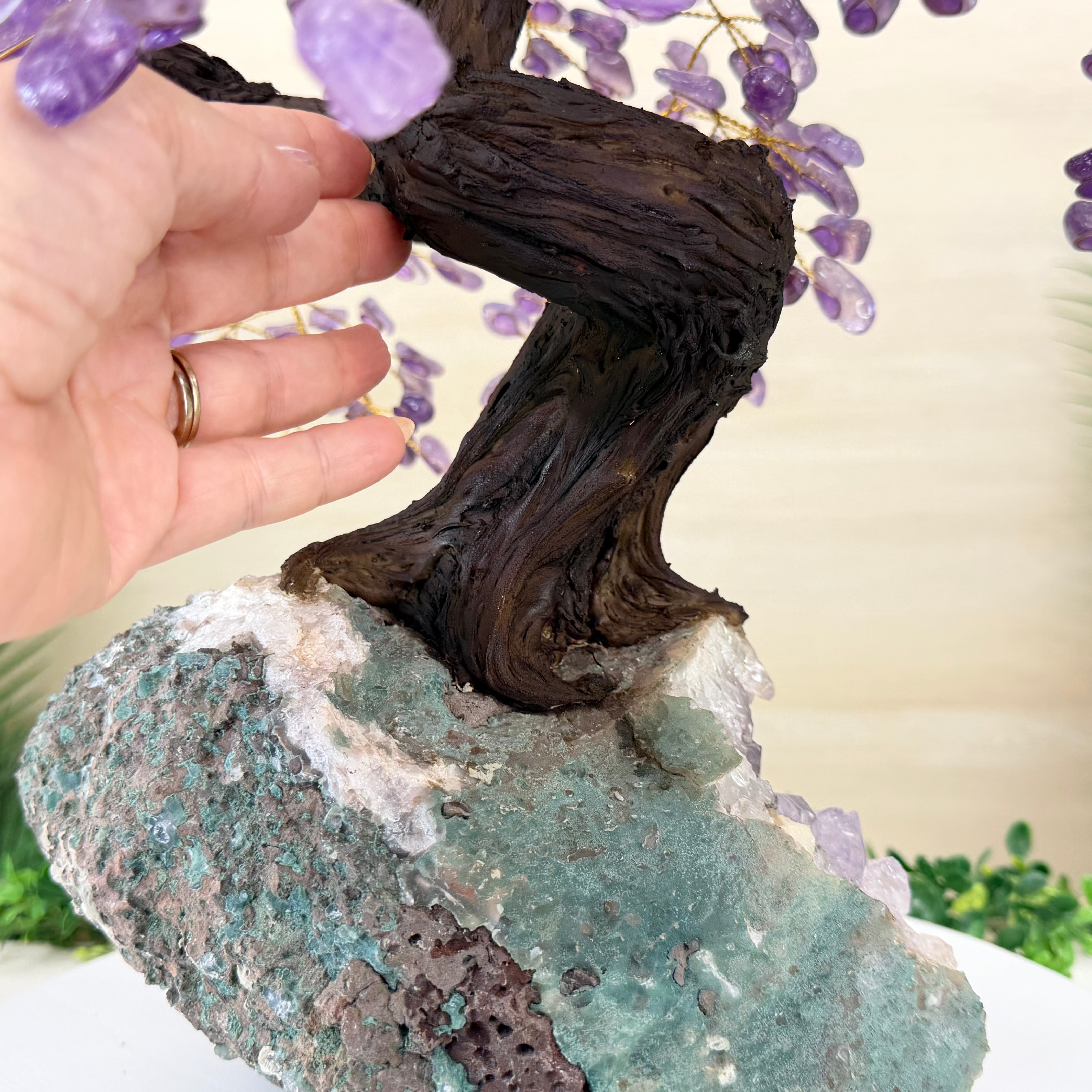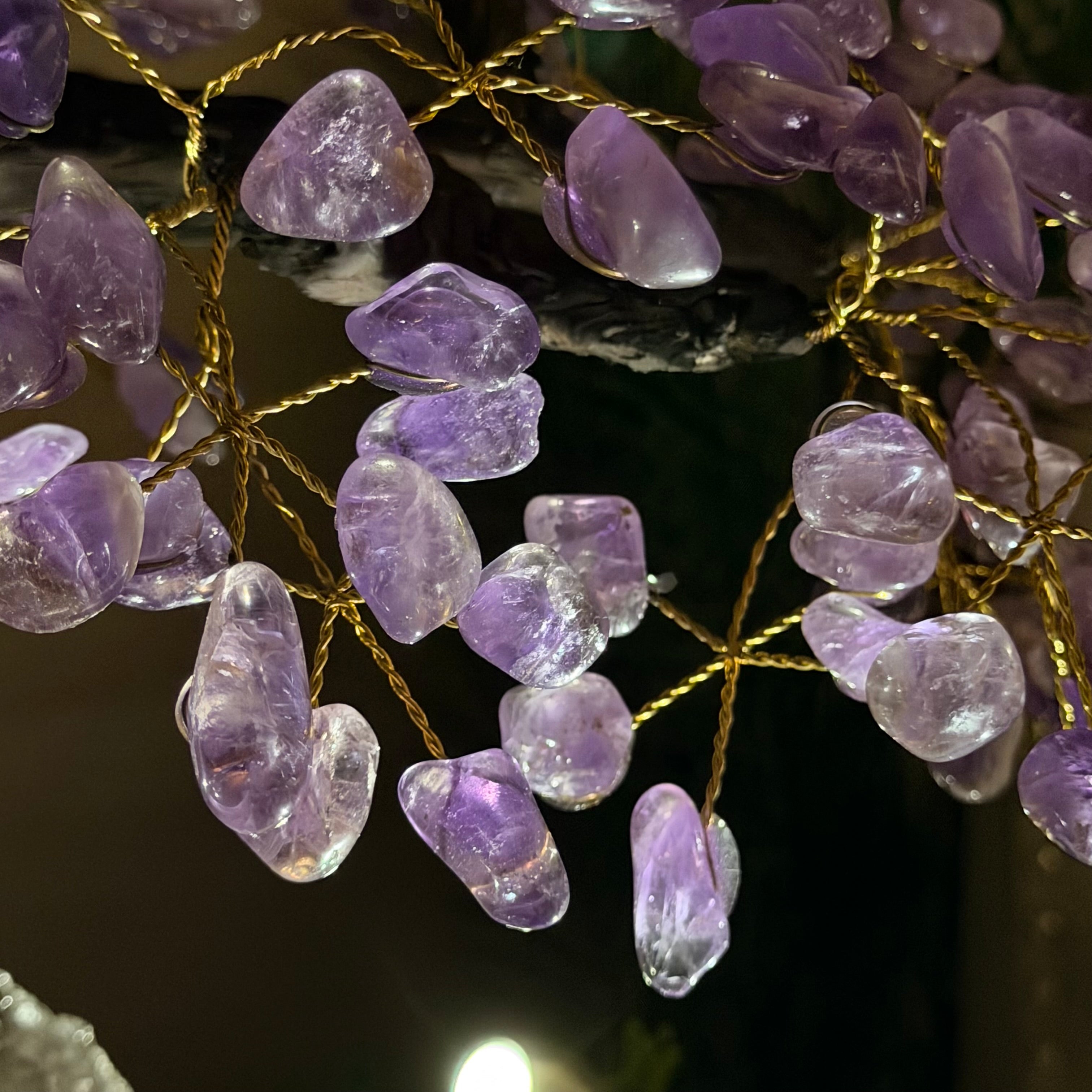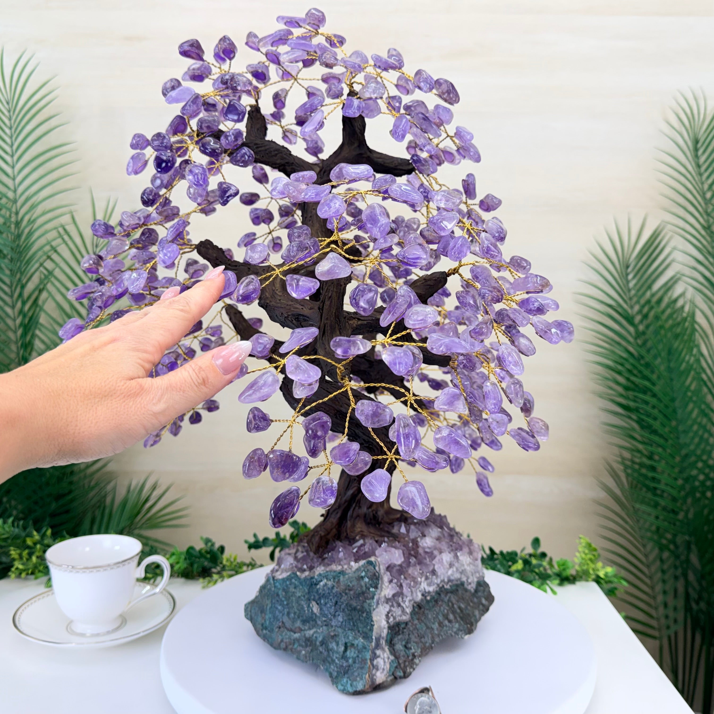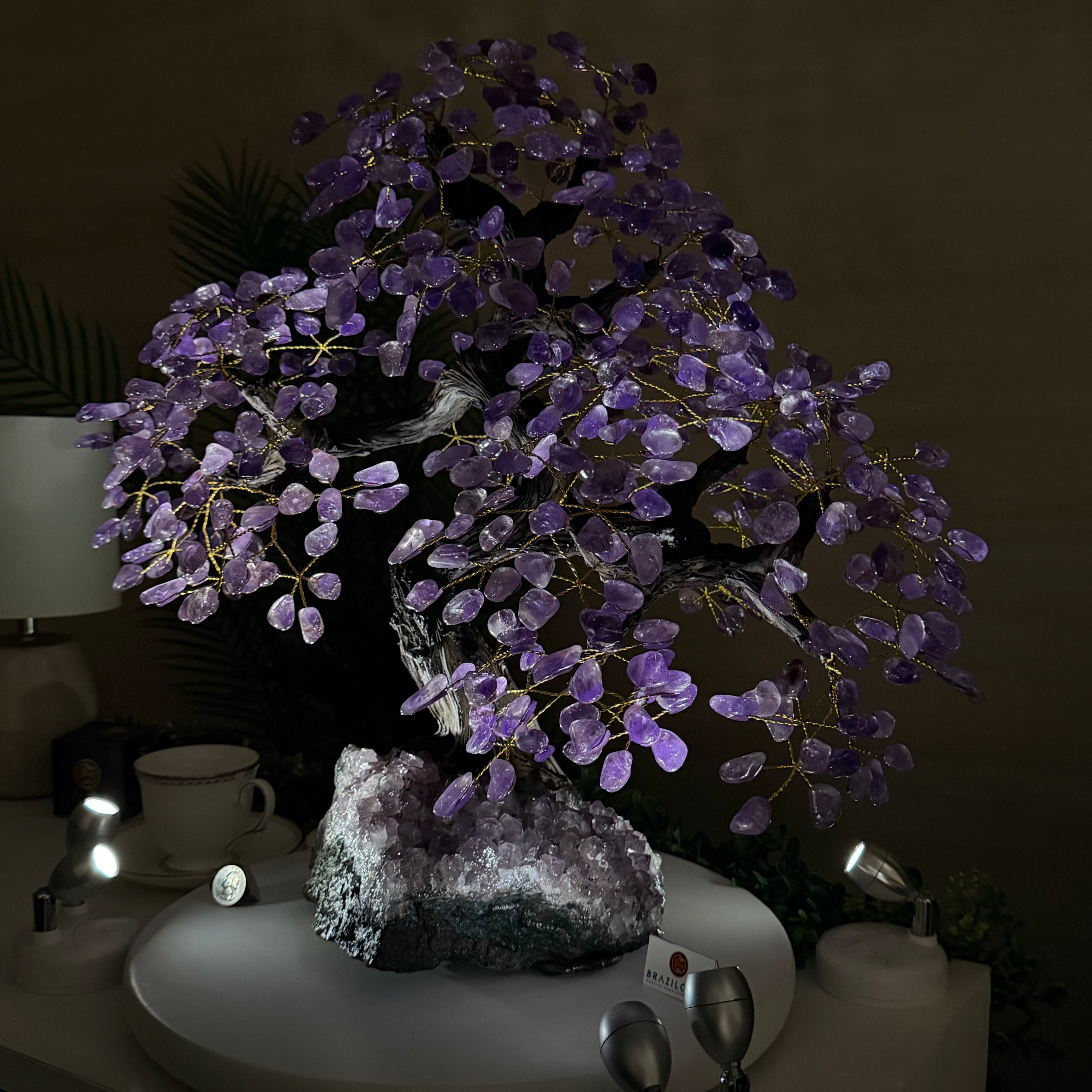 Brazil Gems® brings you Handmade Amethyst Gemstone trees with a crystal cluster base, resin trunk, wired branches and tumbled Amethyst gemstones.