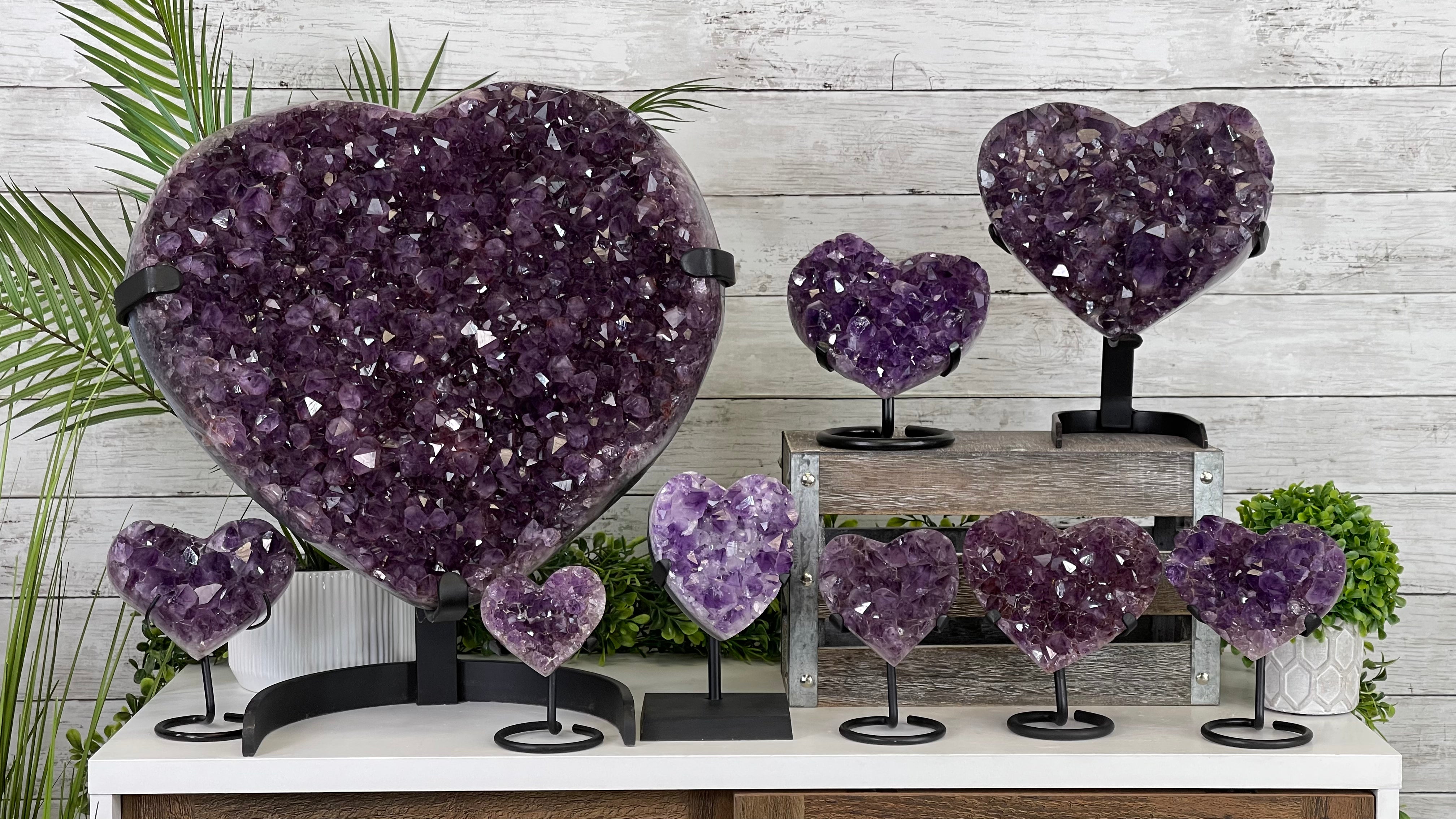 The more of these qualities an Amethyst possesses the more valuable it can be. Our Amethyst geode hearts for sale are top-quality and sure to impress. Here's the order we categorize our Amethyst geodes from higher to lower pricing: