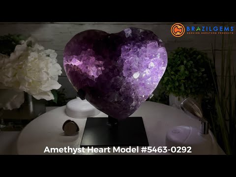 Extra Quality Heart-Shaped Amethyst Geode on a black metal stand. This beautiful gemstone has polished edges and it's backside exposes its natural rough stone on the back. It also features vibrant violet colors and nicely shaped crystal points.