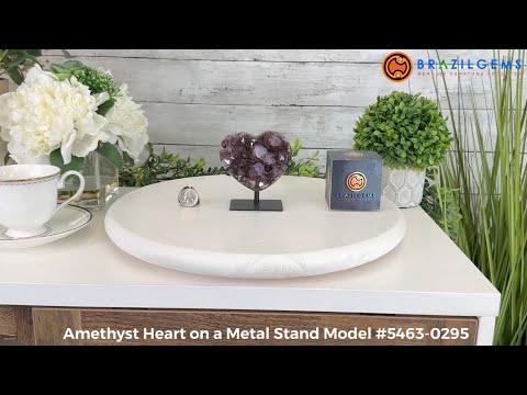 Brazil Gems® brings you this Extra Quality Heart-Shaped Amethyst Geode on a black metal stand. This beautiful gemstone has polished edges and it's backside exposes its natural rough stone on the back. It also features vibrant violet colors and nicely shaped crystal points.