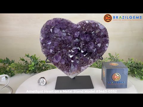 Experience the captivating beauty of this Extra Quality Heart-Shaped Amethyst Geode by Brazil Gems®. Elegantly displayed on a sleek black metal stand, this stunning gemstone showcases polished edges that highlight its vibrant violet hues, while the natural rough stone on the backside adds a touch of raw authenticity. Each crystal point sparkles with the unique, untouched beauty crafted by Mother Nature herself.