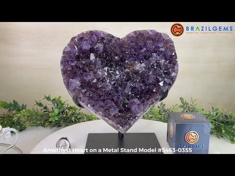 Experience the captivating beauty of this Extra Quality Heart-Shaped Amethyst Geode by Brazil Gems®. Elegantly displayed on a sleek black metal stand, this stunning gemstone showcases polished edges that highlight its vibrant violet hues, while the natural rough stone on the backside adds a touch of raw authenticity. Each crystal point sparkles with the unique, untouched beauty crafted by Mother Nature herself.
