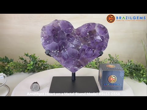 Experience the captivating beauty of this Extra Quality Heart-Shaped Amethyst Geode by Brazil Gems®. Elegantly displayed on a sleek black metal stand, this stunning gemstone showcases polished edges that highlight its vibrant violet hues, while the natural rough stone on the backside adds a touch of raw authenticity. Each crystal point sparkles with the unique, untouched beauty crafted by Mother Nature herself.