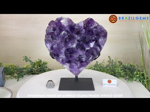 Redefine elegance with this Extra Plus Quality Heart-Shaped Amethyst Geode on a black metal stand. This beautiful gemstone has polished edges and it's backside exposes its natural rough stone. It also features large, vibrant violet colors and nicely shaped crystal points.