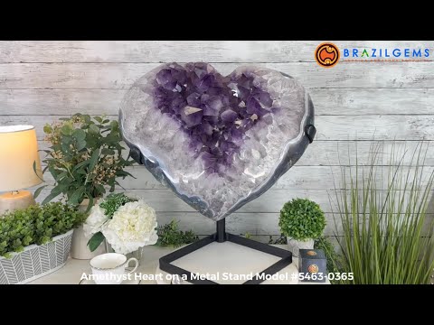 Redefine elegance with this Extra Plus Quality Heart-Shaped Amethyst Geode on a black metal stand. This beautiful gemstone has polished edges with Agate bands and it's backside exposes its natural rough stone on the back. It also features large, vibrant violet colors and nicely shaped crystal points.