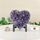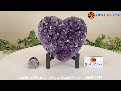 Experience the captivating beauty of this Extra Quality Heart-Shaped Amethyst Geode by Brazil Gems®. Elegantly displayed on a sleek black metal stand, this stunning gemstone showcases polished edges that highlight its vibrant violet hues, while the natural rough stone on the backside adds a touch of raw authenticity. Each crystal point sparkles with the unique, untouched beauty crafted by Mother Nature herself.