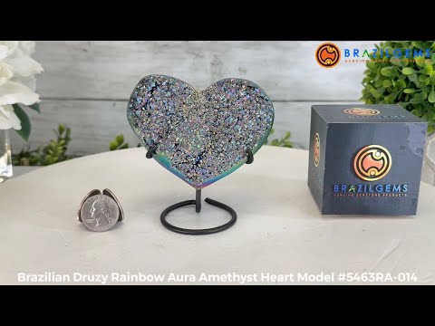 Add a touch of enchantment to your crystal collection with Brazil Gems® Rainbow Aura Quartz Heart on a black metal stand. This captivating piece features polished edges and drusy crystals that glisten with an iridescent rainbow aura effect.