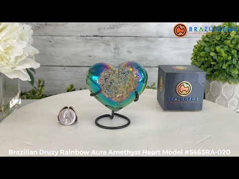 Add a touch of enchantment to your crystal collection with Brazil Gems® Rainbow Aura Quartz Heart on a black metal stand. This captivating piece features polished edges and drusy crystals that glisten with an iridescent rainbow aura effect.