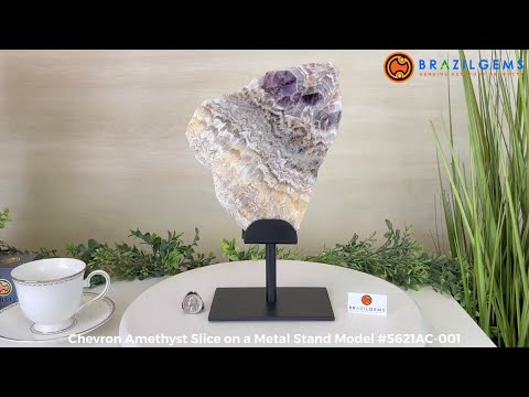 This Chevron Amethyst Slice is a captivating blend of natural beauty and elegance, showcasing striking bands of deep purple and white quartz. Expertly cut and polished, each piece highlights the unique V-shaped patterns of Chevron Amethyst, known for its calming energy and ability to enhance intuition. Mounted on a sleek black metal stand, it makes a perfect statement piece for any space.