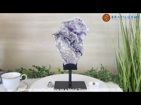 This Chevron Amethyst Slice is a captivating blend of natural beauty and elegance, showcasing striking bands of deep purple and white quartz. Expertly cut and polished, each piece highlights the unique V-shaped patterns of Chevron Amethyst, known for its calming energy and ability to enhance intuition. Mounted on a sleek black metal stand, it makes a perfect statement piece for any space.
