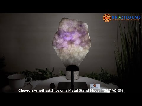 This Chevron Amethyst Slice is a captivating blend of natural beauty and elegance, showcasing striking bands of deep purple and white quartz. Expertly cut and polished, each piece highlights the unique V-shaped patterns of Chevron Amethyst, known for its calming energy and ability to enhance intuition. Mounted on a sleek black metal stand, it makes a perfect statement piece for any space.