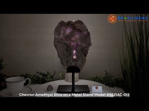 This Chevron Amethyst Slice is a captivating blend of natural beauty and elegance, showcasing striking bands of deep purple and white quartz. Expertly cut and polished, each piece highlights the unique V-shaped patterns of Chevron Amethyst, known for its calming energy and ability to enhance intuition. Mounted on a sleek black metal stand, it makes a perfect statement piece for any space.