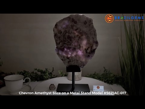 This Chevron Amethyst Slice is a captivating blend of natural beauty and elegance, showcasing striking bands of deep purple and white quartz. Expertly cut and polished, each piece highlights the unique V-shaped patterns of Chevron Amethyst, known for its calming energy and ability to enhance intuition. Mounted on a sleek black metal stand, it makes a perfect statement piece for any space.
