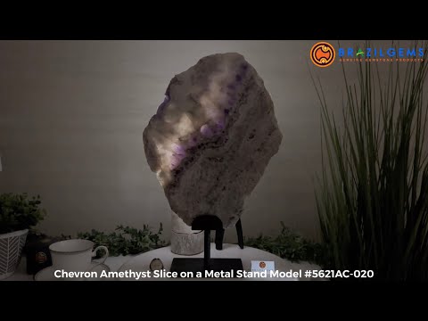 This Chevron Amethyst Slice is a captivating blend of natural beauty and elegance, showcasing striking bands of deep purple and white quartz. Expertly cut and polished, each piece highlights the unique V-shaped patterns of Chevron Amethyst, known for its calming energy and ability to enhance intuition. Mounted on a sleek black metal stand, it makes a perfect statement piece for any space.