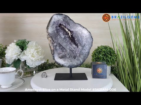 Infuse your room with the natural elegance of this Natural Brazilian Amethyst crystal slice on a black metal and wood stand. This Standard Plus Quality Amethyst has a polished front and back side making it admirable from either side. With its intricate mixes of amethyst crystals and agate bands it will certainly impress all who see it and will make a perfect focal point in your home or office. Place a light behind it to watch it glow. It is certainly a gemstone to admire or as a gift to a loved one.