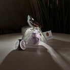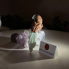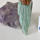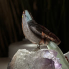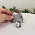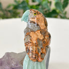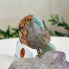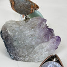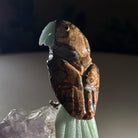 Marvel at our exquisite hand-carved X-Small Size Parrot crystal bird perched on a captivating Amethyst cluster base, a harmonious blend of nature, art, and elegance. Crafted from premium Bird's Eye Rhyolite for its body, Green Quartz for its beak, Green Quartz for its tail and adorned with cute little metal feet, this stunning sculpture captures the essence of nature's beauty.