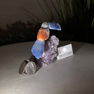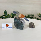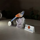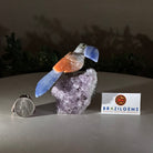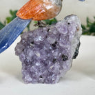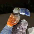 Marvel at our exquisite hand-carved Extra Small Size Toucan crystal bird perched on a captivating Amethyst cluster base, a harmonious blend of nature, art, and elegance. Crafted from premium Orange Apatite for its body, Blue Quartz for its beak, Blue Quartz for its tail and adorned with cute little metal feet, this stunning sculpture captures the essence of nature's beauty.