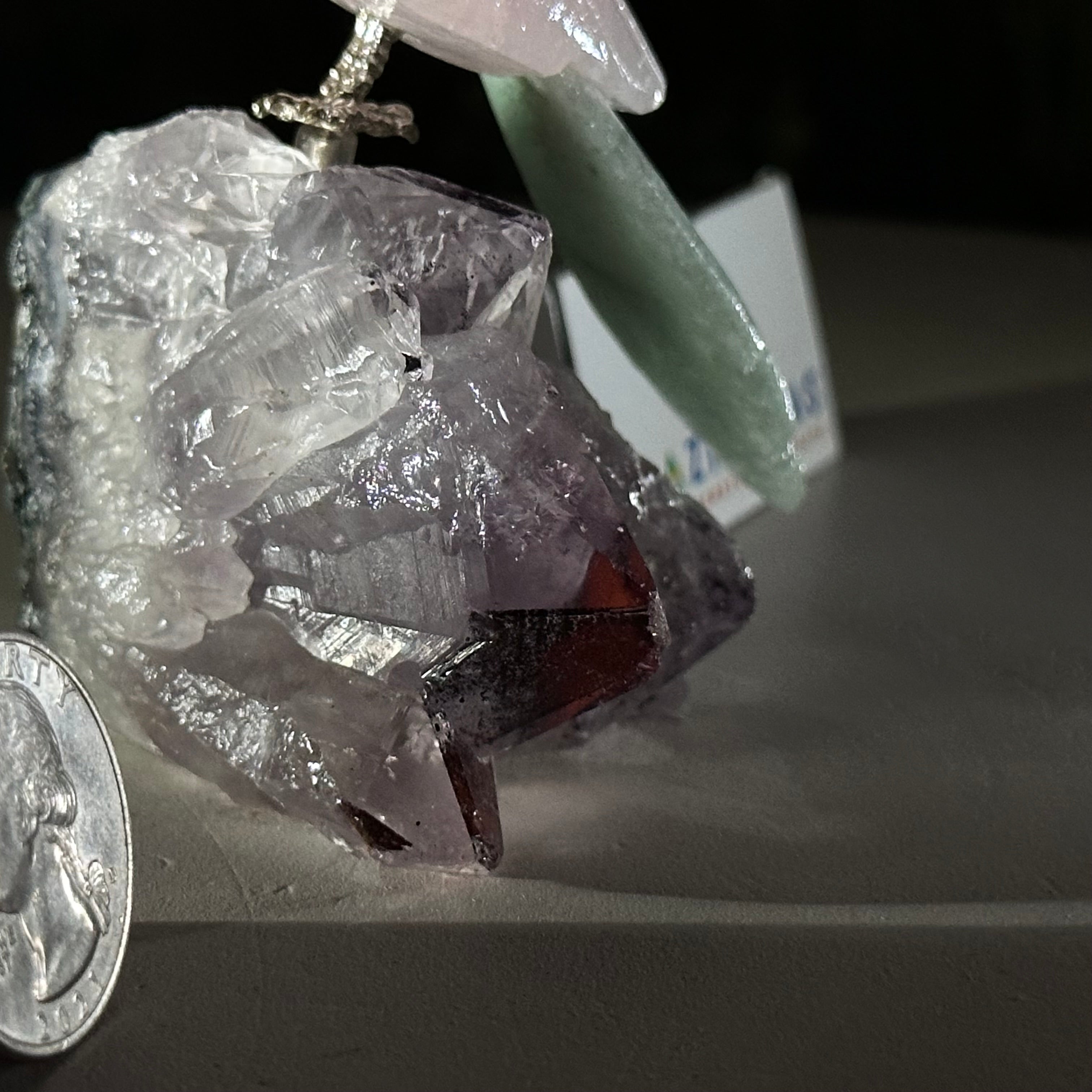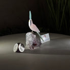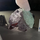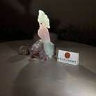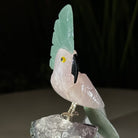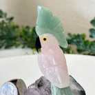 Marvel at our exquisite hand-carved X-Small Size Cockatoo gemstone bird perched on a captivating Amethyst cluster base, a harmonious blend of nature, art, and elegance. Crafted from premium Rose Quartz for its body, Black Onyx for its beak, Green Quartz for its crest and its tail and adorned with cute little metal feet, this stunning sculpture captures the essence of nature's beauty.