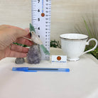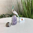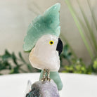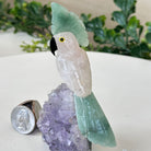 Marvel at our exquisite hand-carved X-Small Size Cockatoo gemstone bird perched on a captivating Amethyst cluster base, a harmonious blend of nature, art, and elegance. Crafted from premium Rose Quartz for its body, Black Onyx for its beak, Green Quartz for its crest and its tail and adorned with cute little metal feet, this stunning sculpture captures the essence of nature's beauty.
