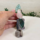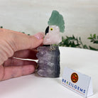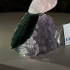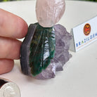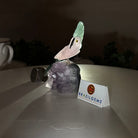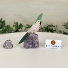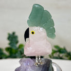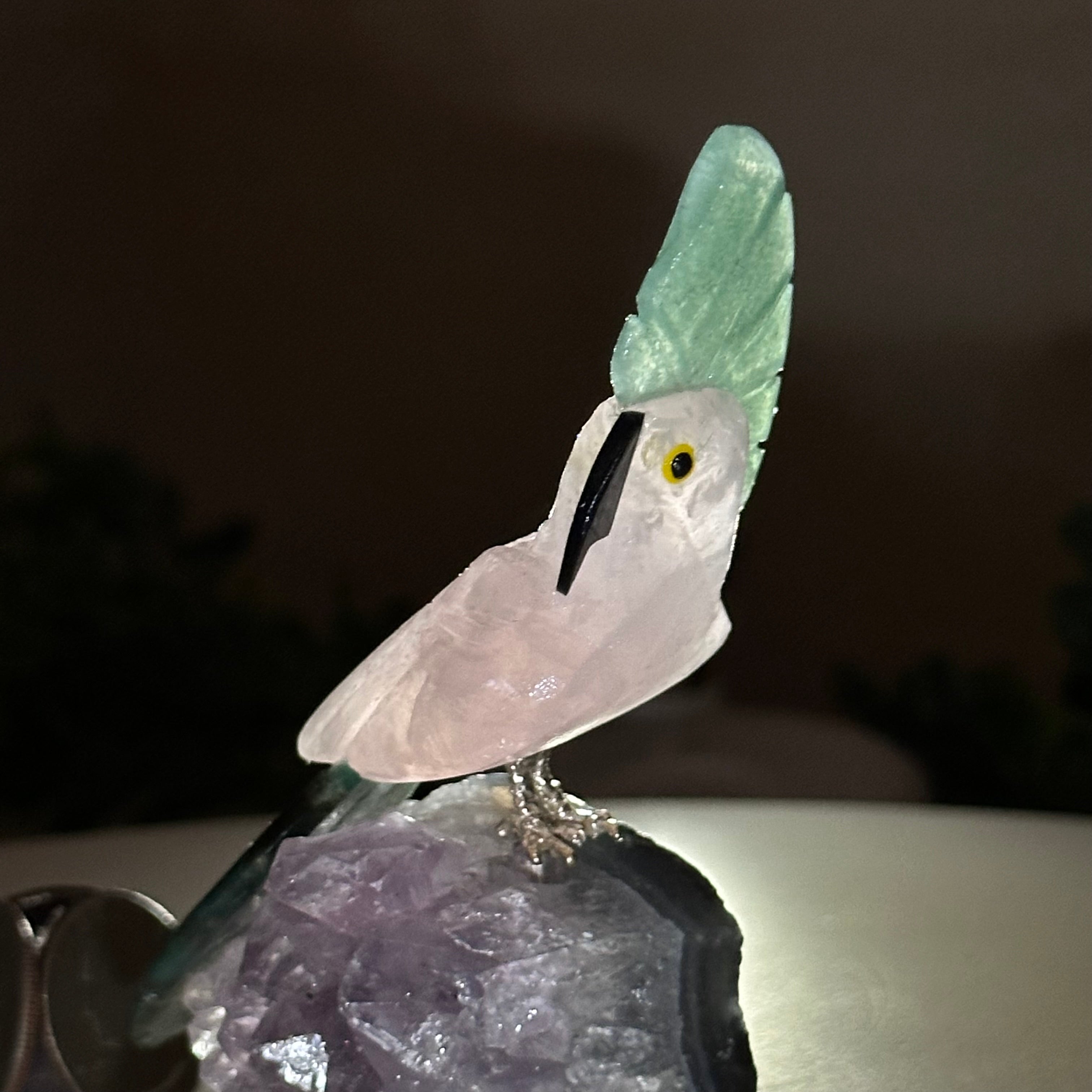 Marvel at our exquisite hand-carved X-Small Size Cockatoo gemstone bird perched on a captivating Amethyst cluster base, a harmonious blend of nature, art, and elegance. Crafted from premium Rose Quartz for its body, Black Onyx for its beak, Green Quartz for its crest, Green Jasper for its tail and adorned with cute little metal feet, this stunning sculpture captures the essence of nature's beauty.