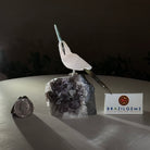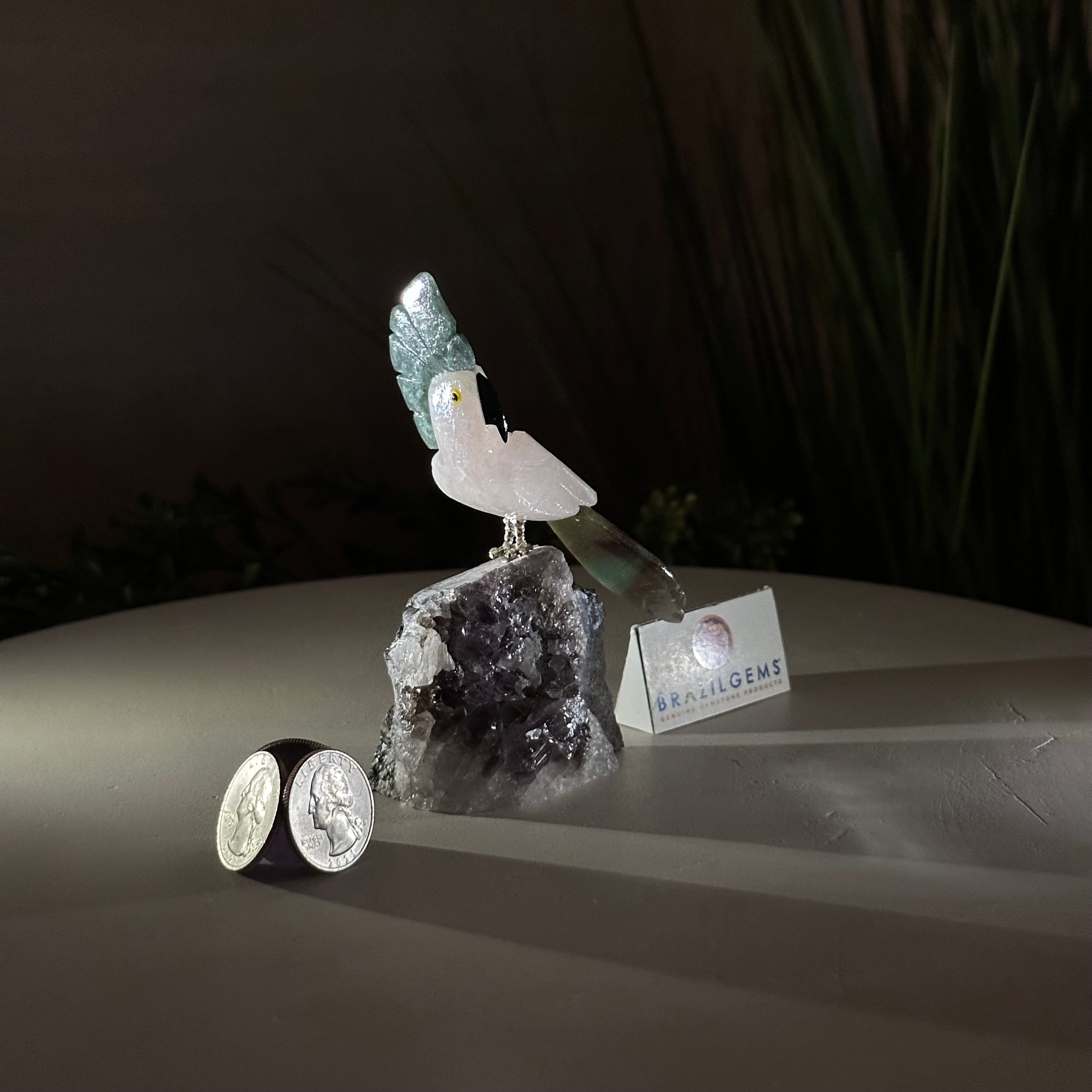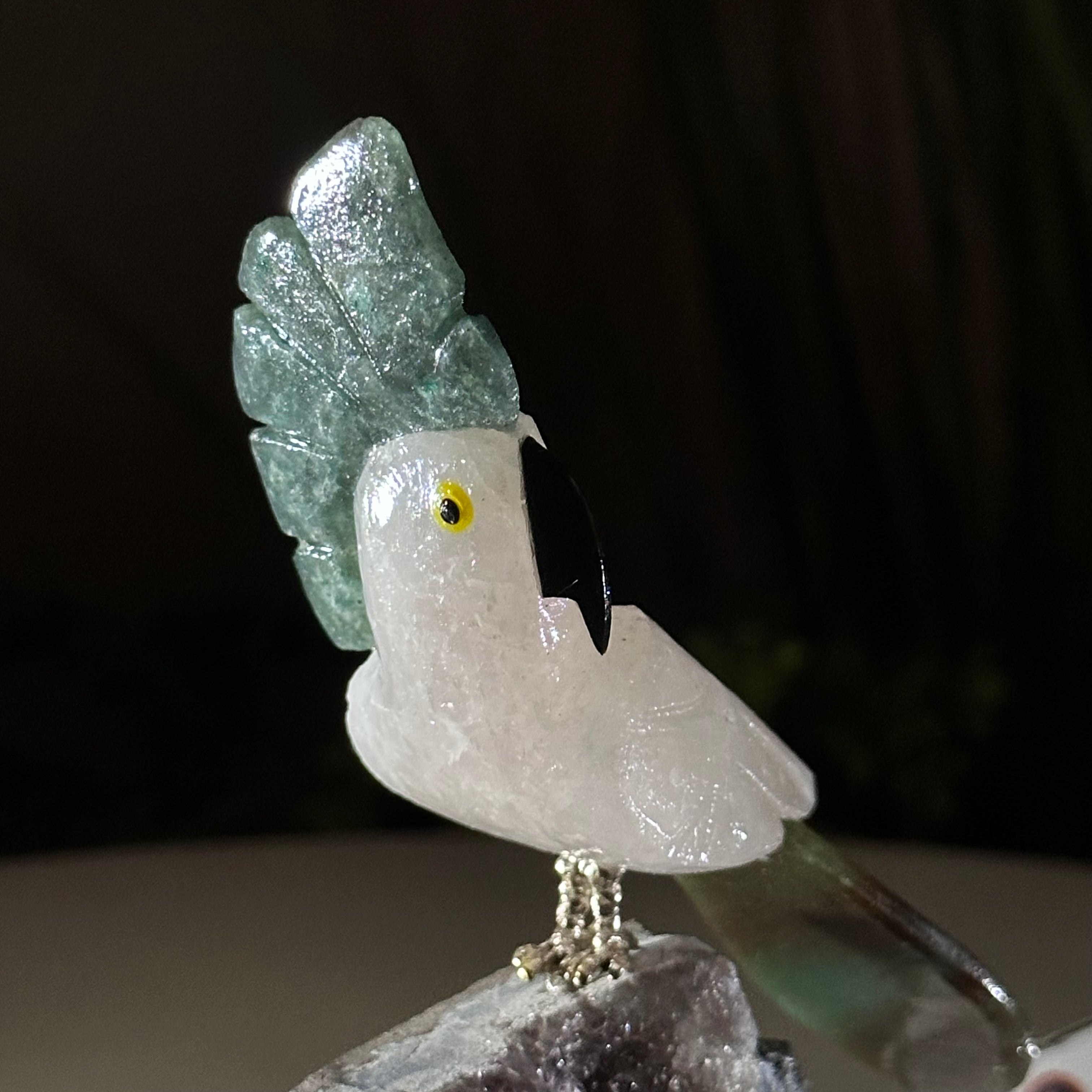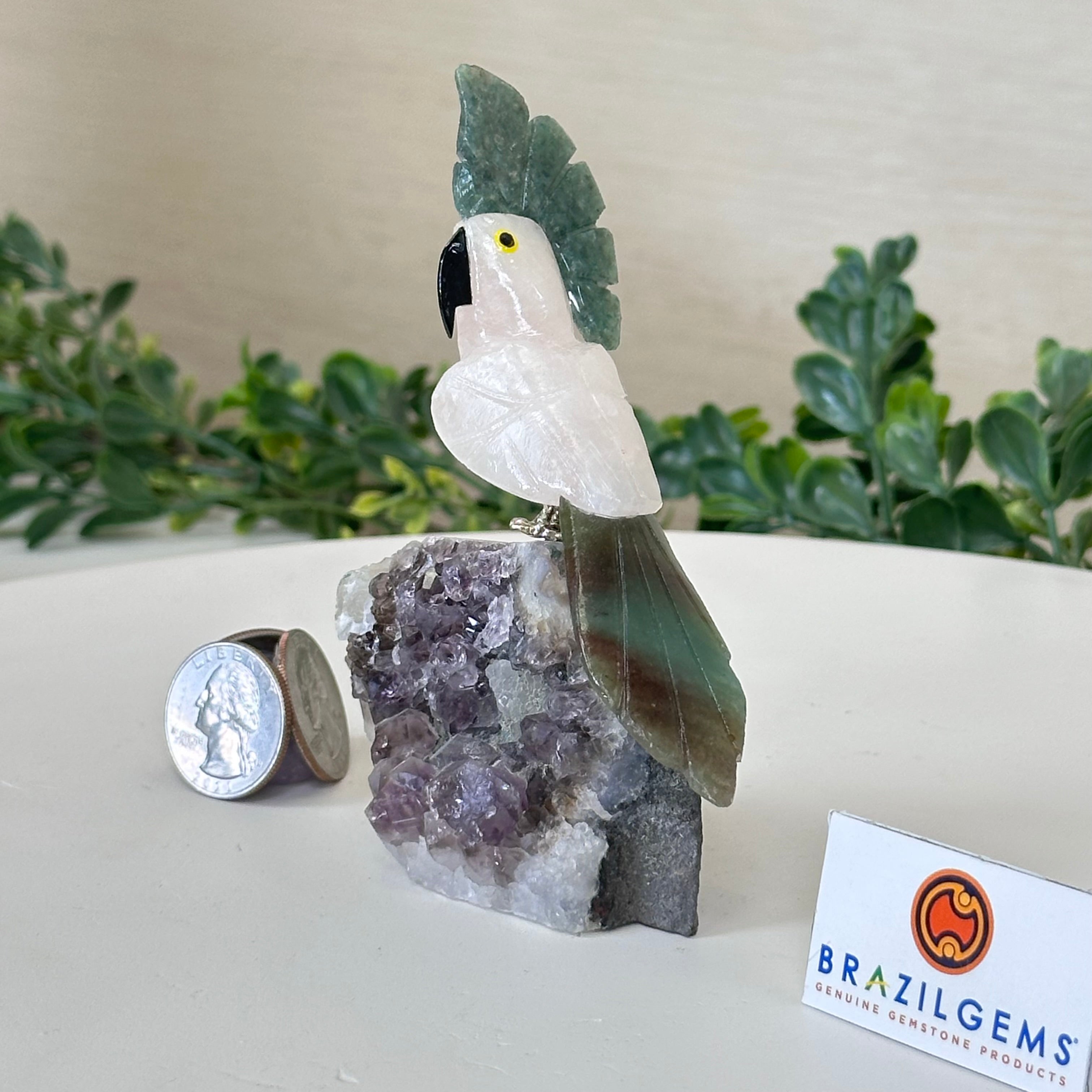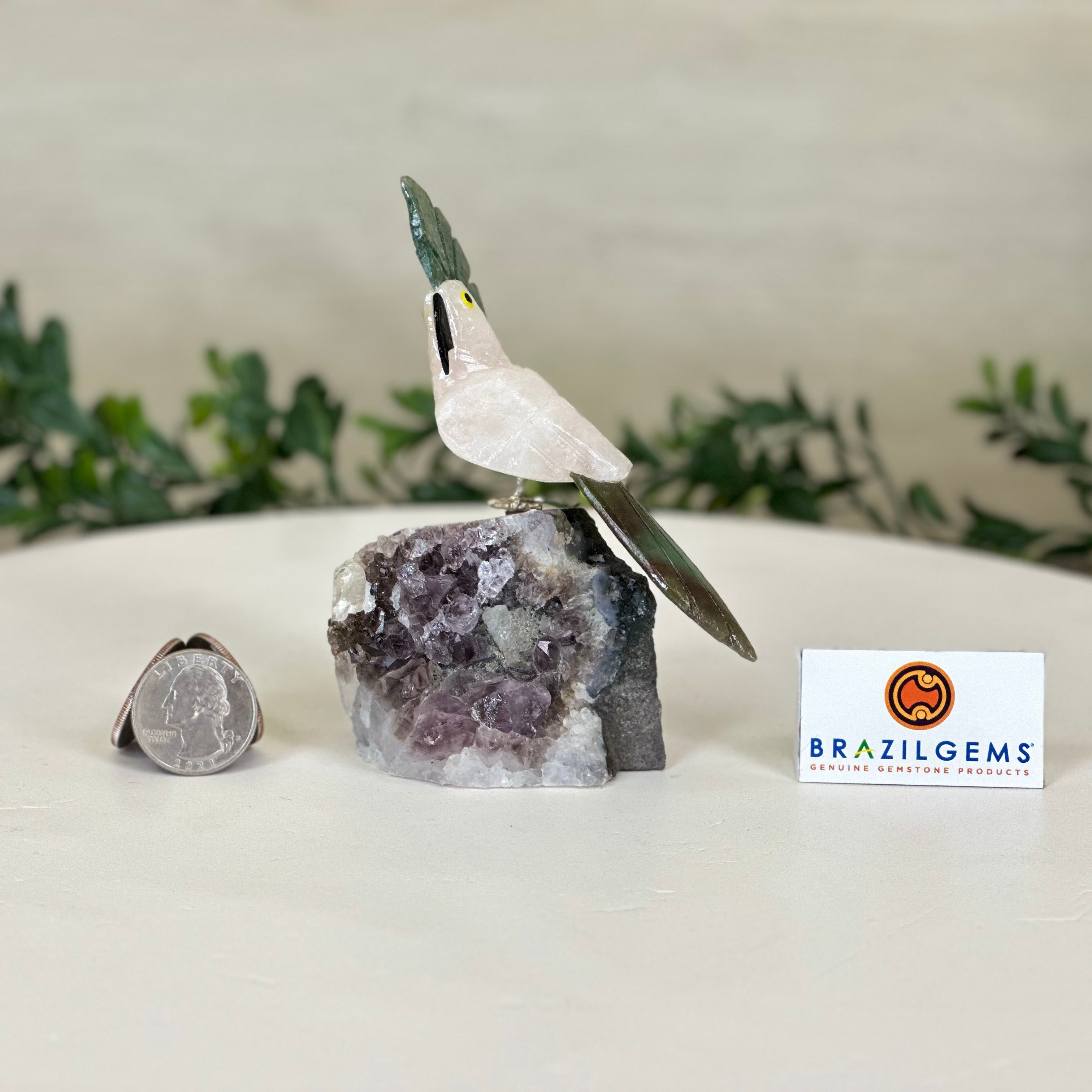 Each intricate detail of the bird is meticulously carved by skilled Brazilian artisans who have mastered the technique that combines the beauty of Brazil's gemstones with their colorful native birds into an amazing art piece. Elevate your space with the timeless charm of our Cockatoo gemstone bird on an Amethyst base.
