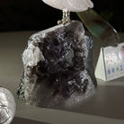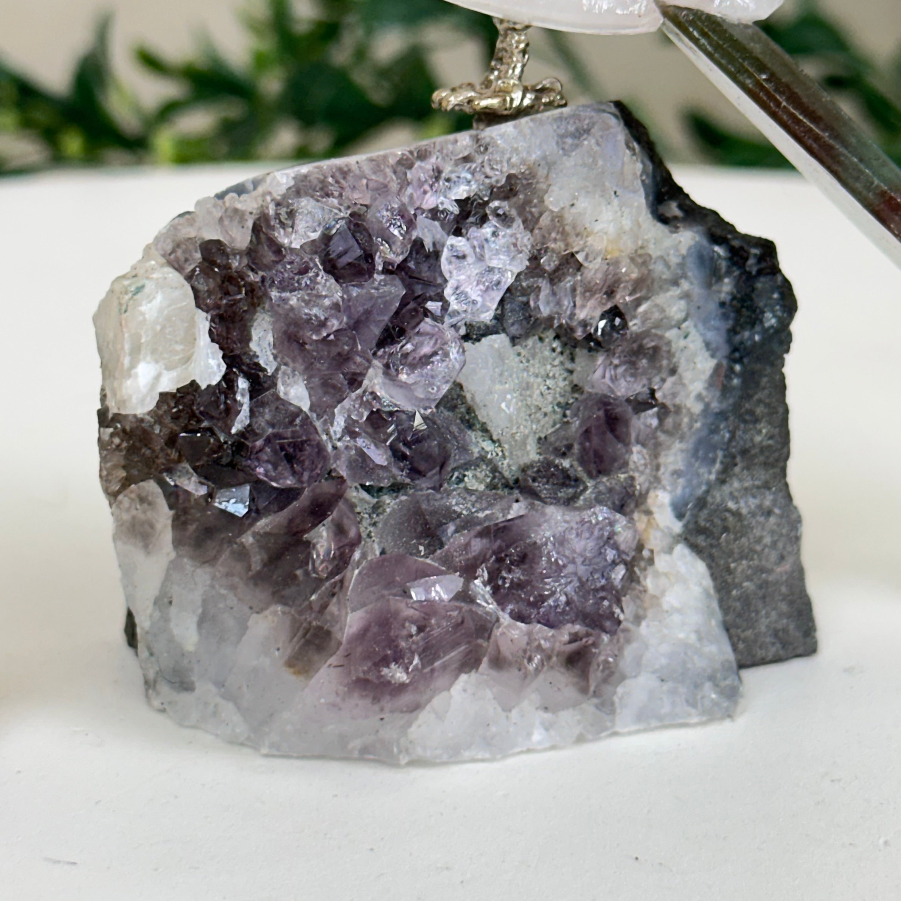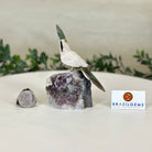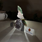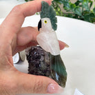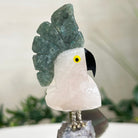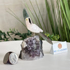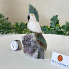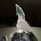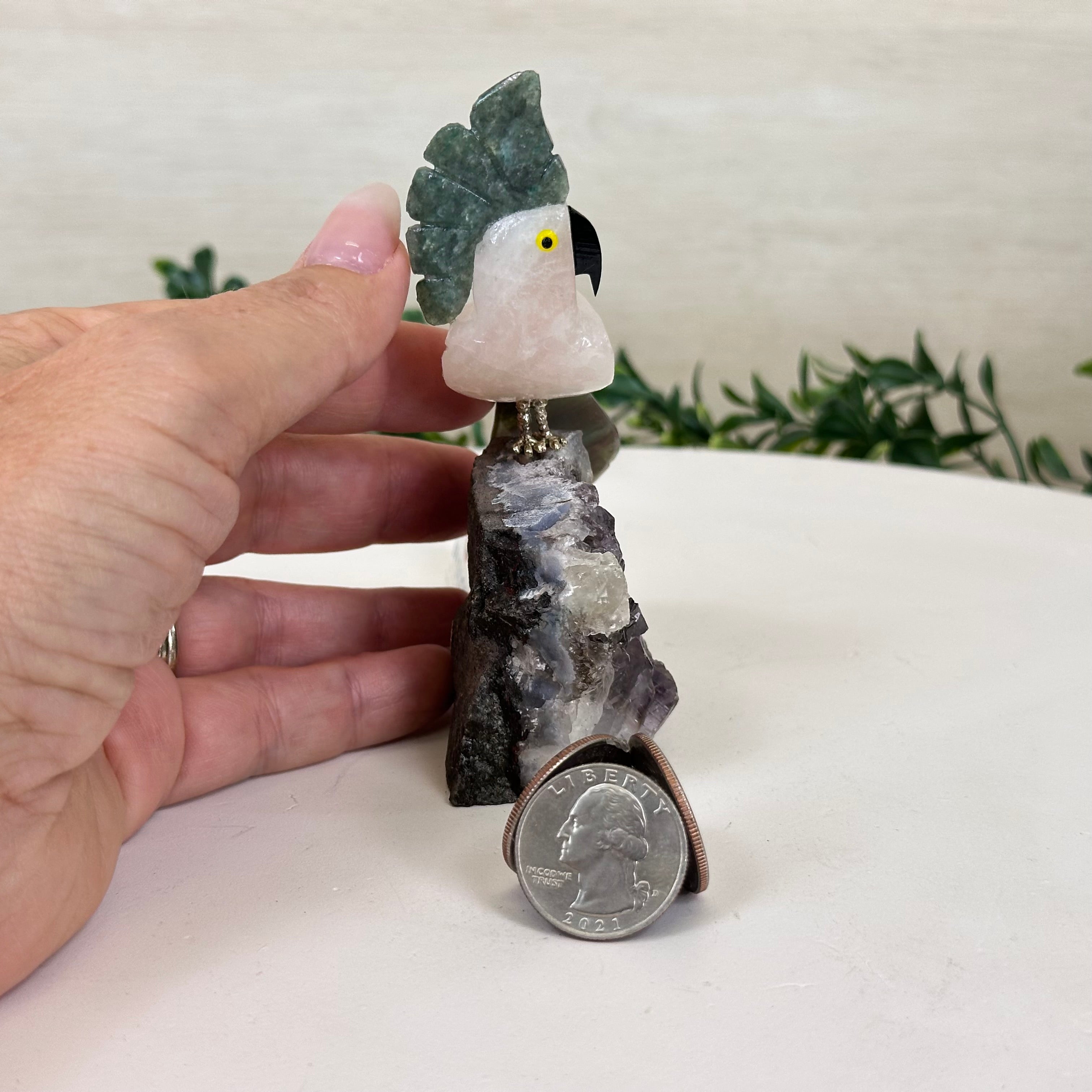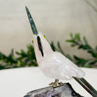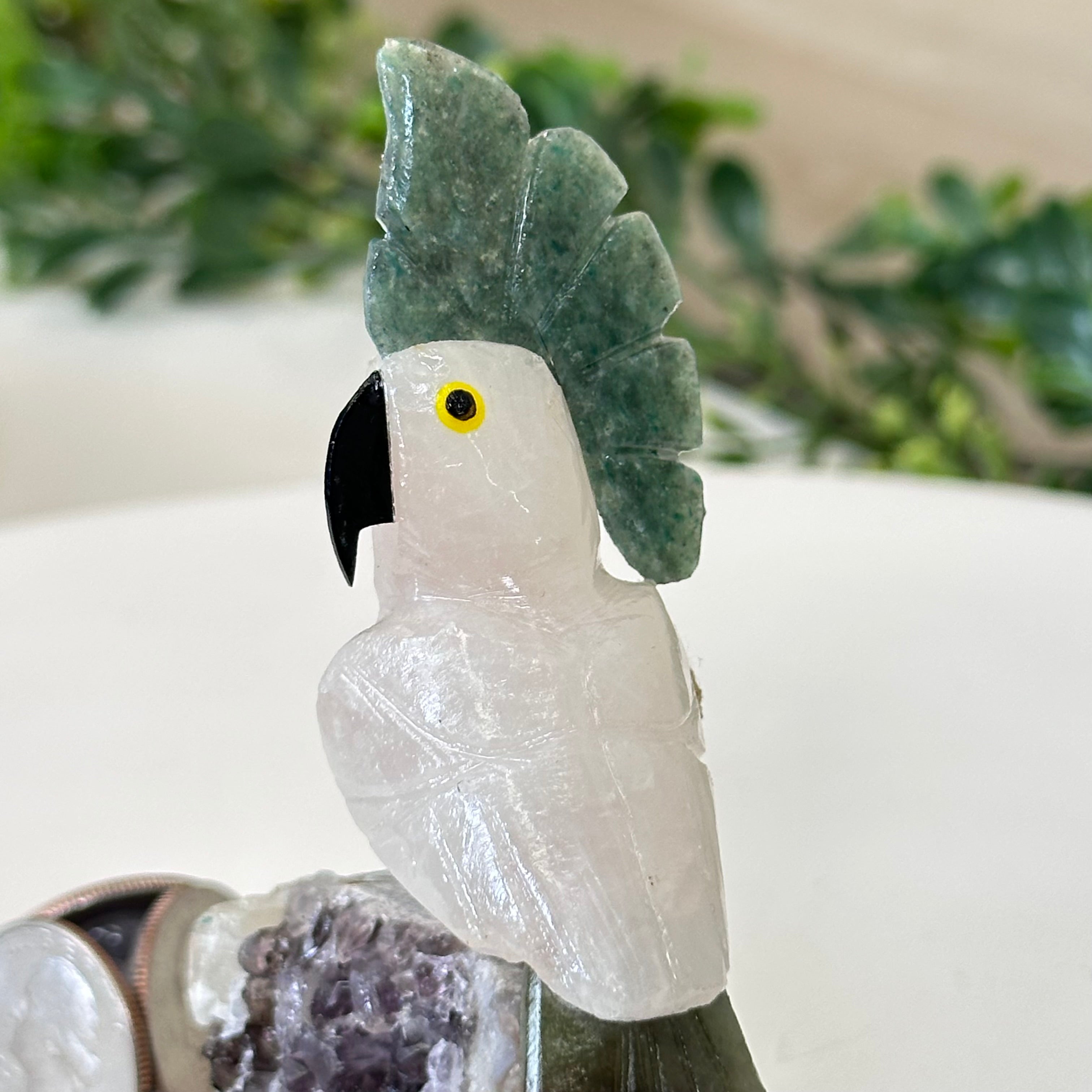 Marvel at our exquisite hand-carved X-Small Size Cockatoo gemstone bird perched on a captivating Amethyst cluster base, a harmonious blend of nature, art, and elegance. Crafted from premium Rose Quartz for its body, Black Onyx for its beak, Green Jasper for its crest and its tail and adorned with cute little metal feet, this stunning sculpture captures the essence of nature's beauty.
