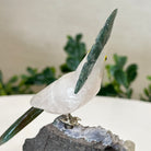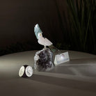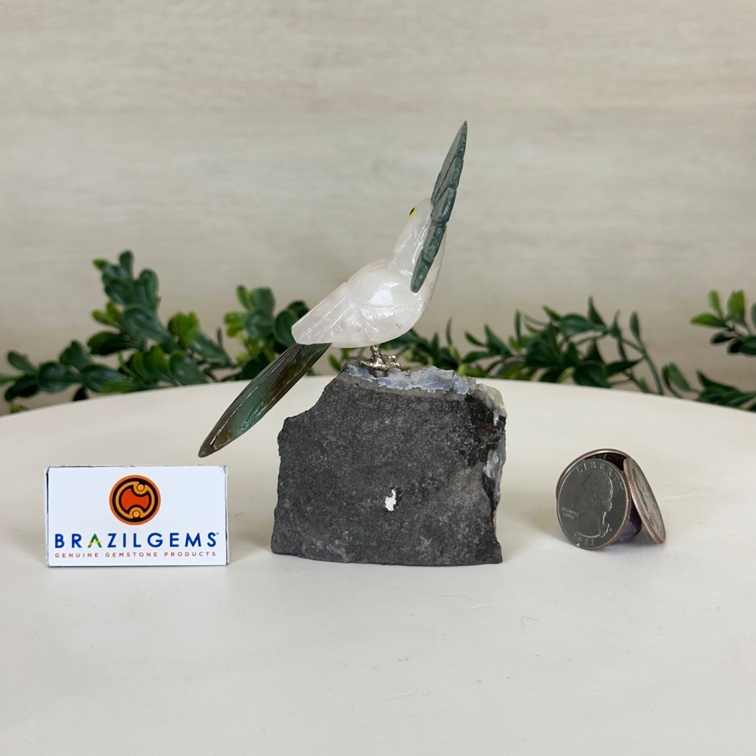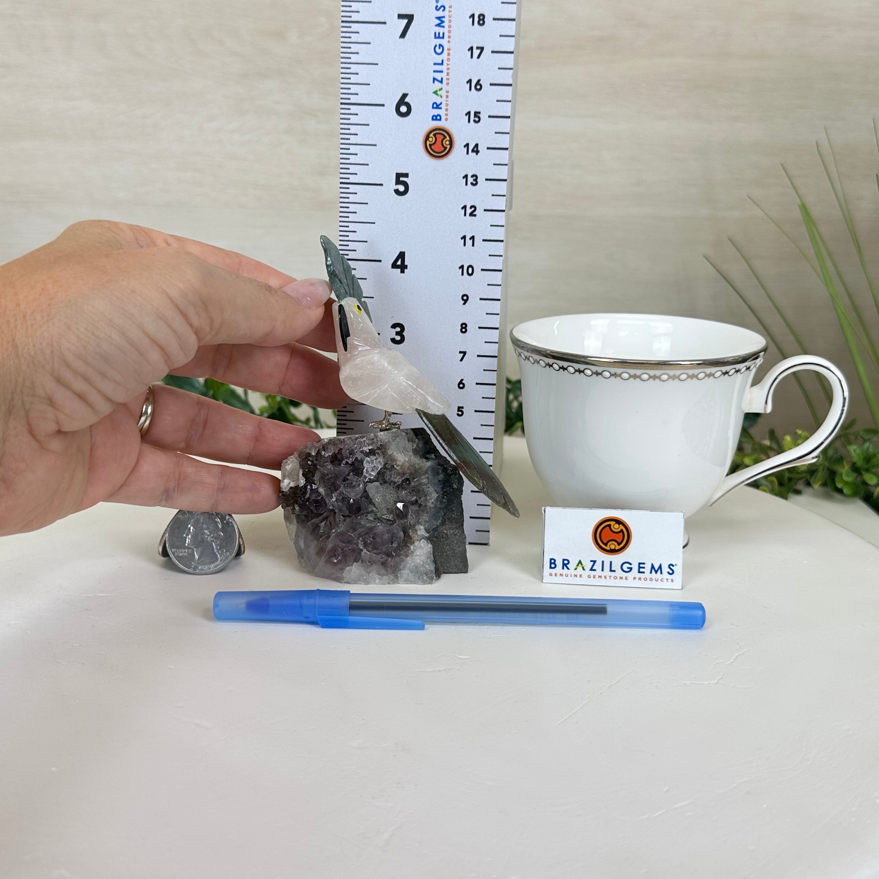 Disclaimer: This is a natural gemstone product sold by Brazil Gems® as is and as you see it in its images and video. The bird figurine has been hand carved out of natural gemstones and constructed together to give it its unique look. It and its cluster base may contain natural imperfections as well as imperfections, broken edges and repairs from the hand carving, extraction, mounting and prepping processes. The cluster base has a small hole drilled in the top for the bird to mount into. The crystal bird detaches from its base for shipping purposes. At Brazil Gems® we make every effort to get measurements as exact as possible but they are done by human hands and eyes and therefore may have minor discrepancies.