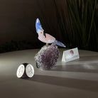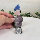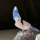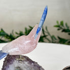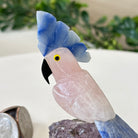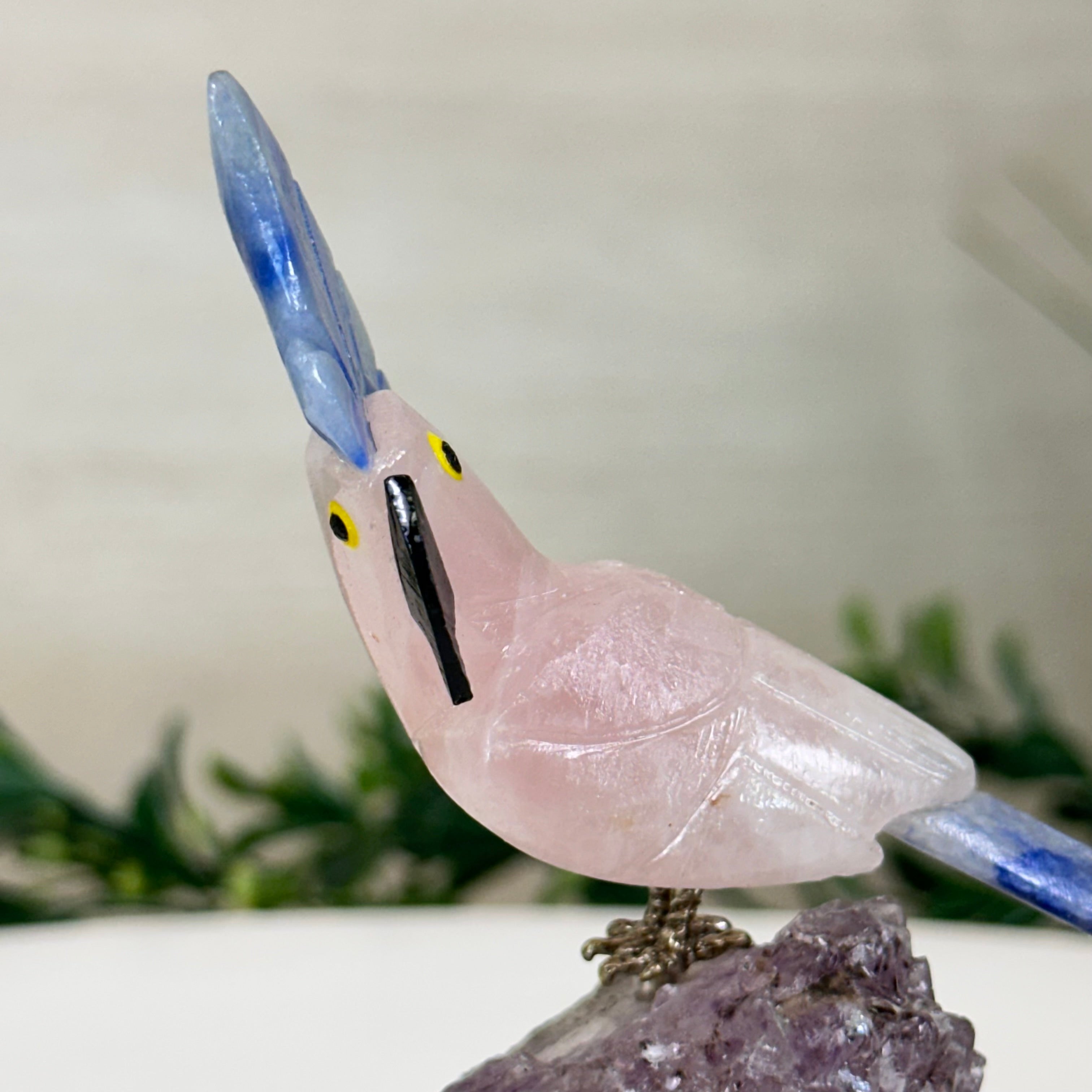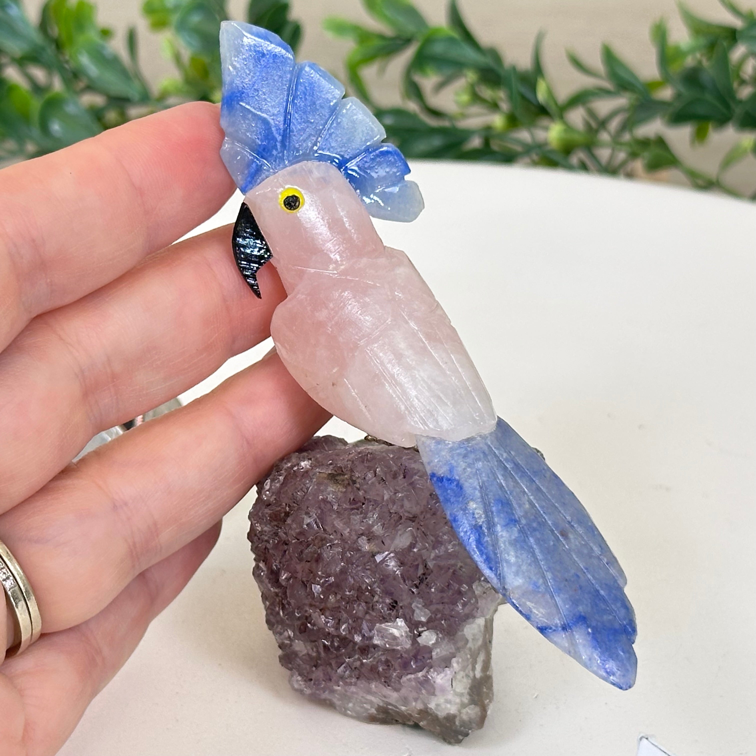 Marvel at our exquisite hand-carved X-Small Size Cockatoo gemstone bird perched on a captivating Amethyst cluster base, a harmonious blend of nature, art, and elegance. Crafted from premium Rose Quartz for its body, Black Quartz for its beak, Blue Quartz for its crest, Blue Quartz for its tail and adorned with cute little metal feet, this stunning sculpture captures the essence of nature's beauty.