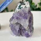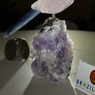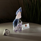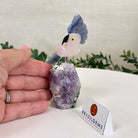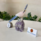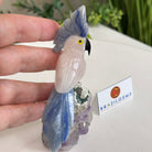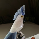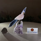 Marvel at our exquisite hand-carved X-Small Size Cockatoo gemstone bird perched on a captivating Amethyst cluster base, a harmonious blend of nature, art, and elegance. Crafted from premium Rose Quartz for its body, Black Onyx for its beak, Blue Quartz for its crest, Blue Quartz for its tail and adorned with cute little metal feet, this stunning sculpture captures the essence of nature's beauty.