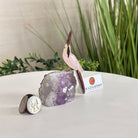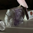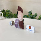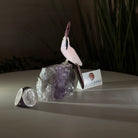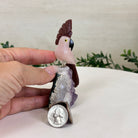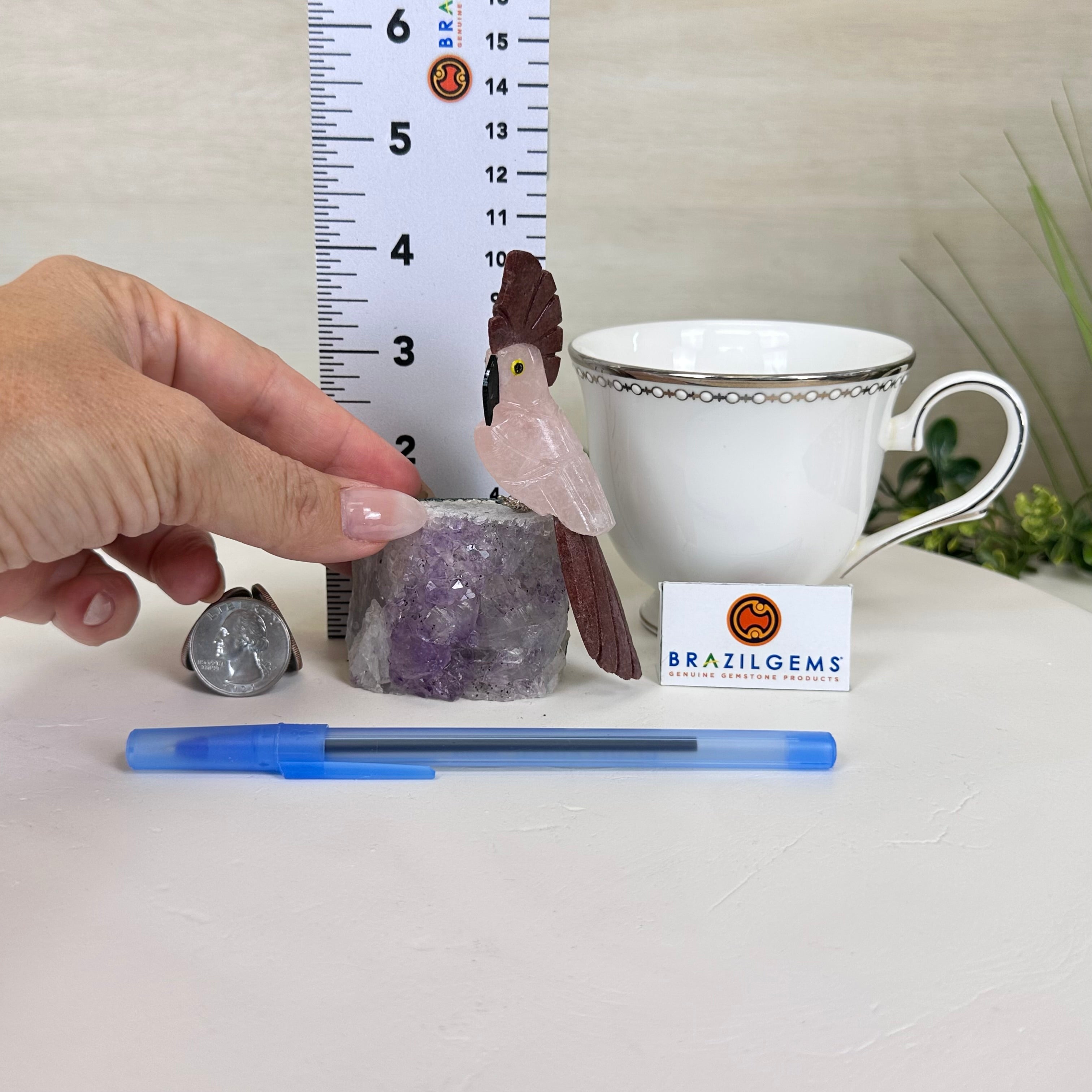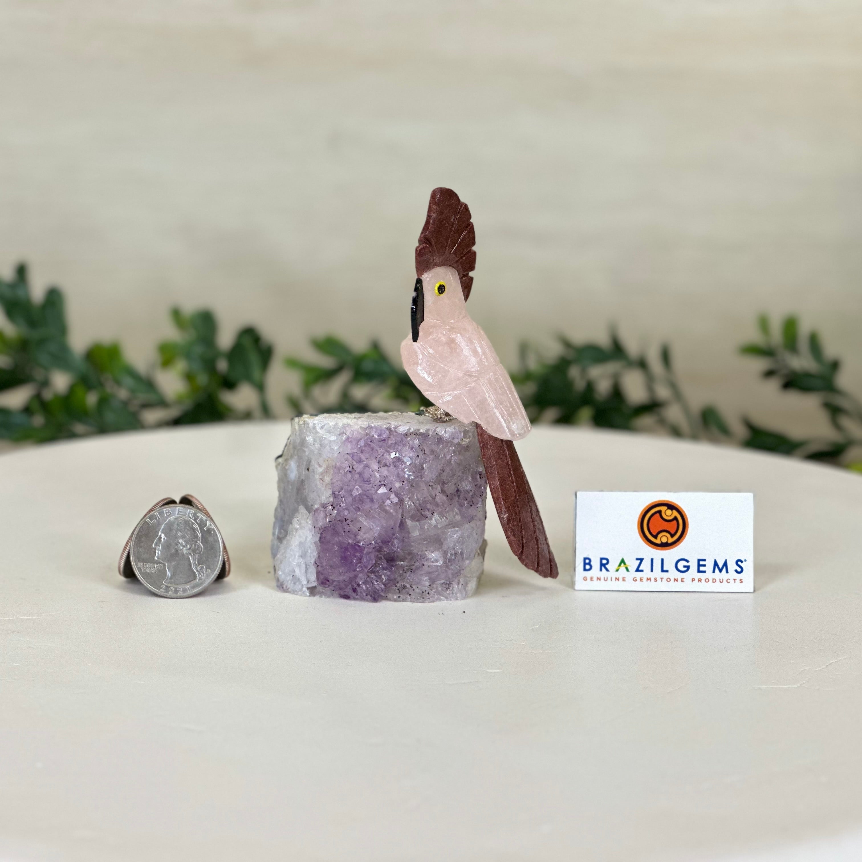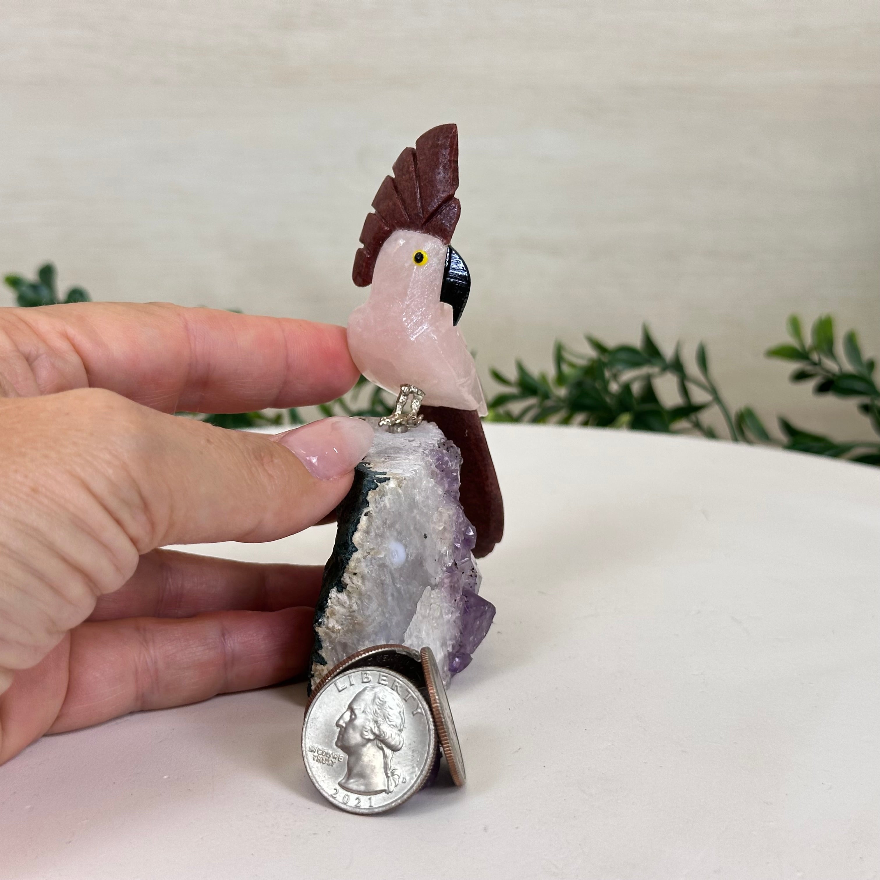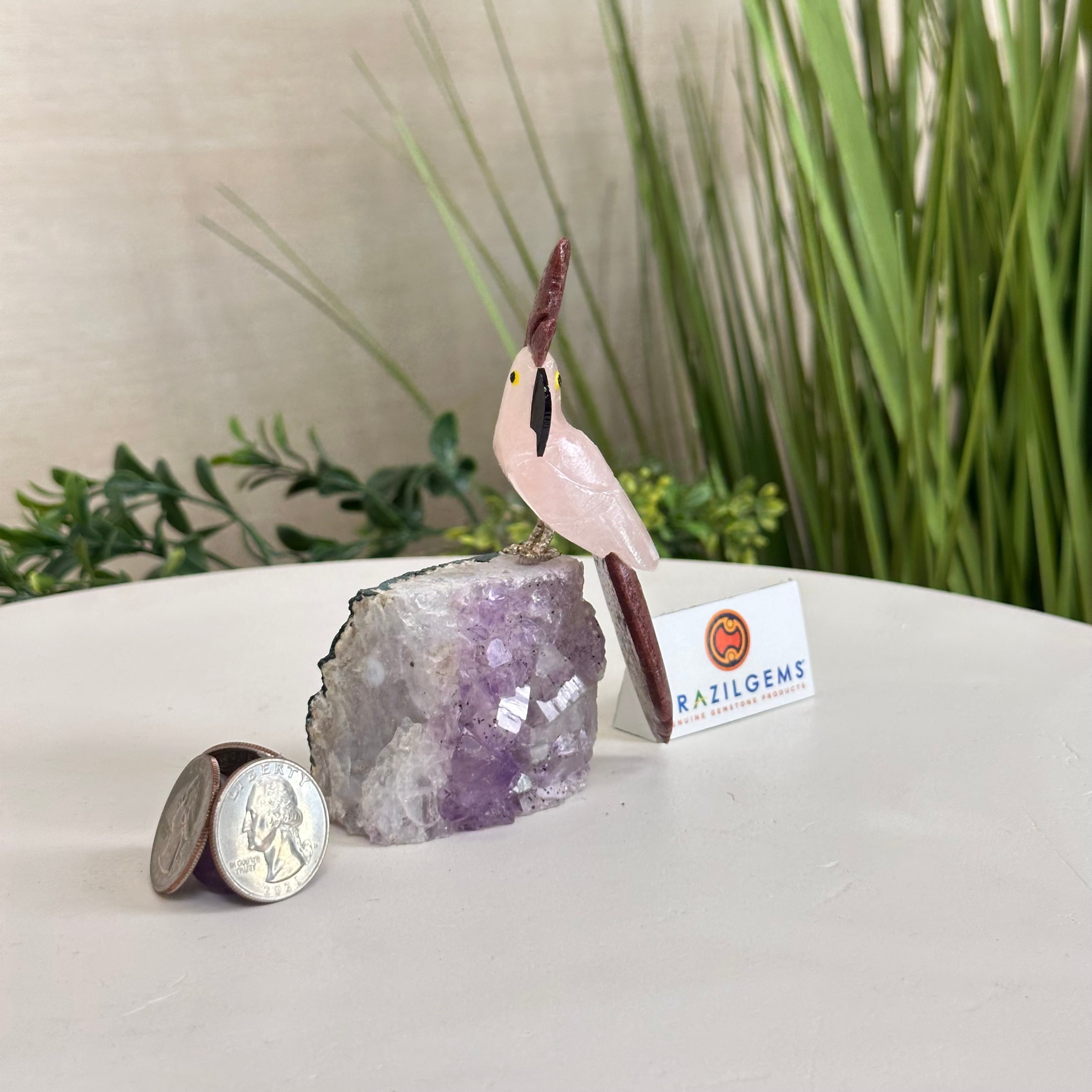 Marvel at our exquisite hand-carved X-Small Size Cockatoo gemstone bird perched on a captivating Amethyst cluster base, a harmonious blend of nature, art, and elegance. Crafted from premium Rose Quartz for its body, Black Onyx for its beak, Red Jasper for its crest, Red Jasper for its tail and adorned with cute little metal feet, this stunning sculpture captures the essence of nature's beauty.