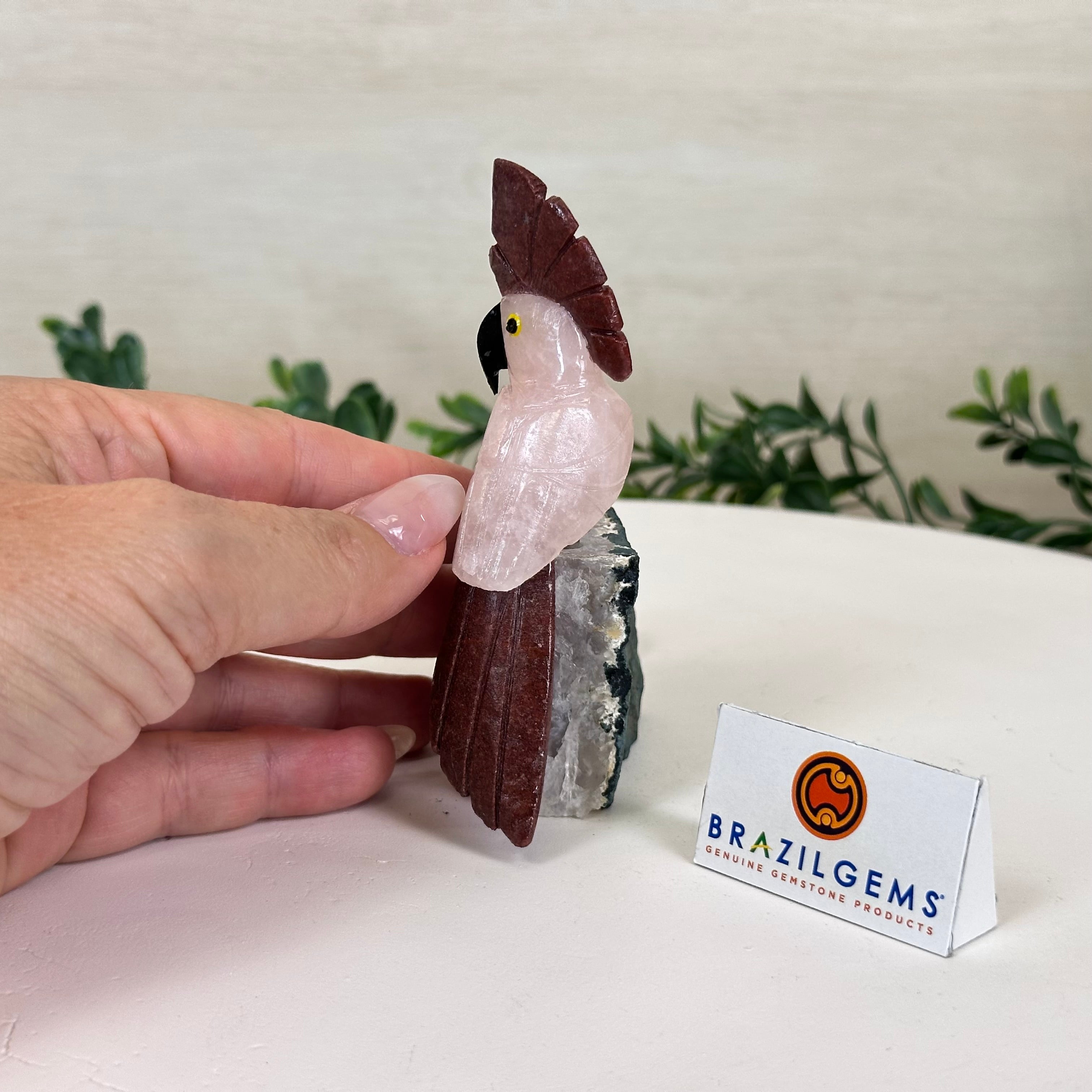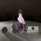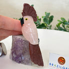 Each intricate detail of the bird is meticulously carved by skilled Brazilian artisans who have mastered the technique that combines the beauty of Brazil's gemstones with their colorful native birds into an amazing art piece. Elevate your space with the timeless charm of our Cockatoo gemstone bird on an Amethyst base.